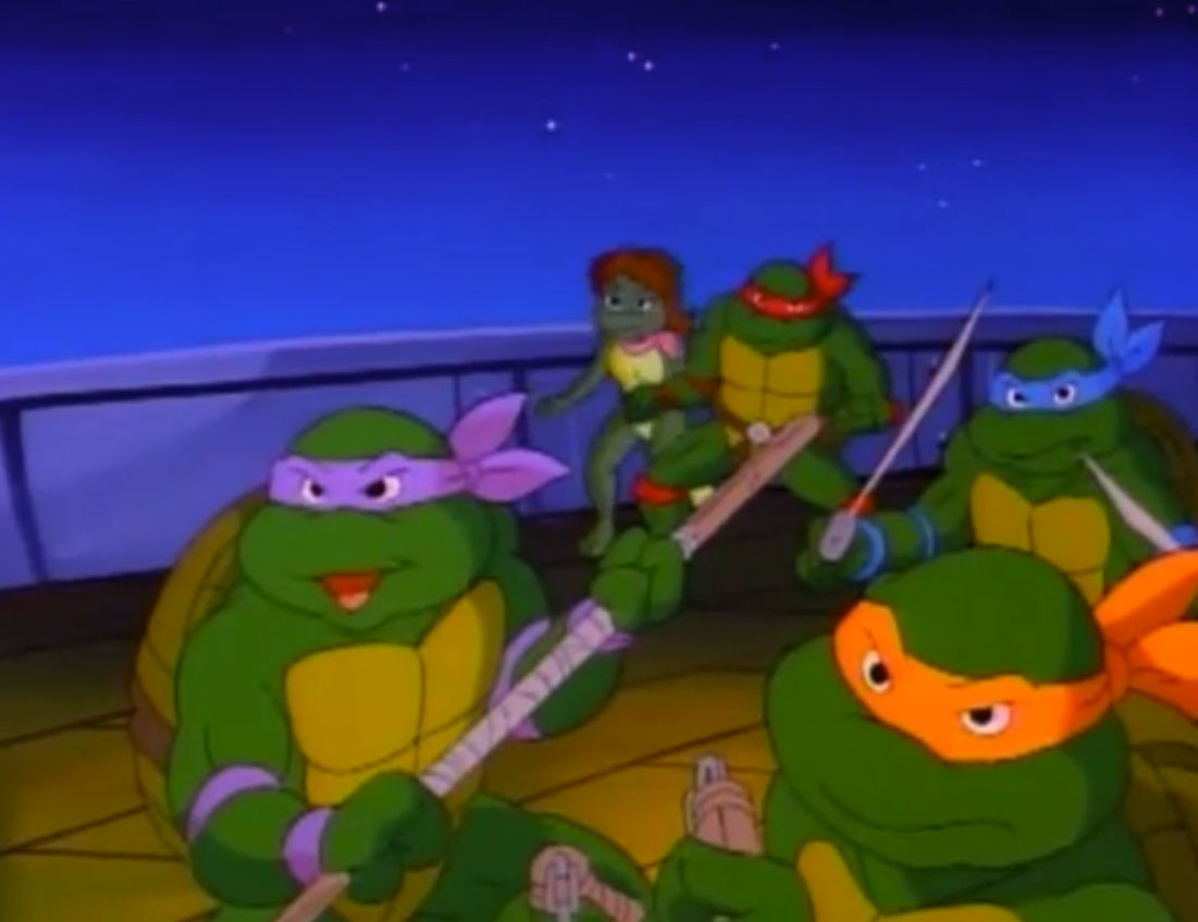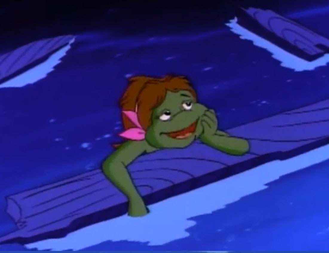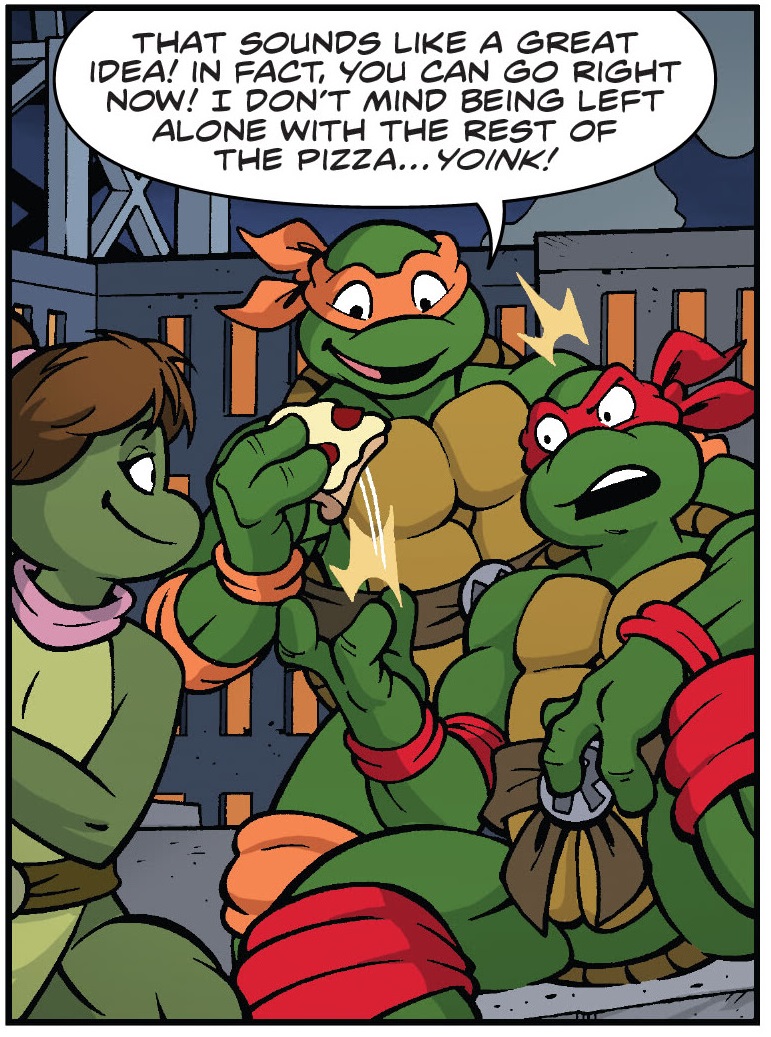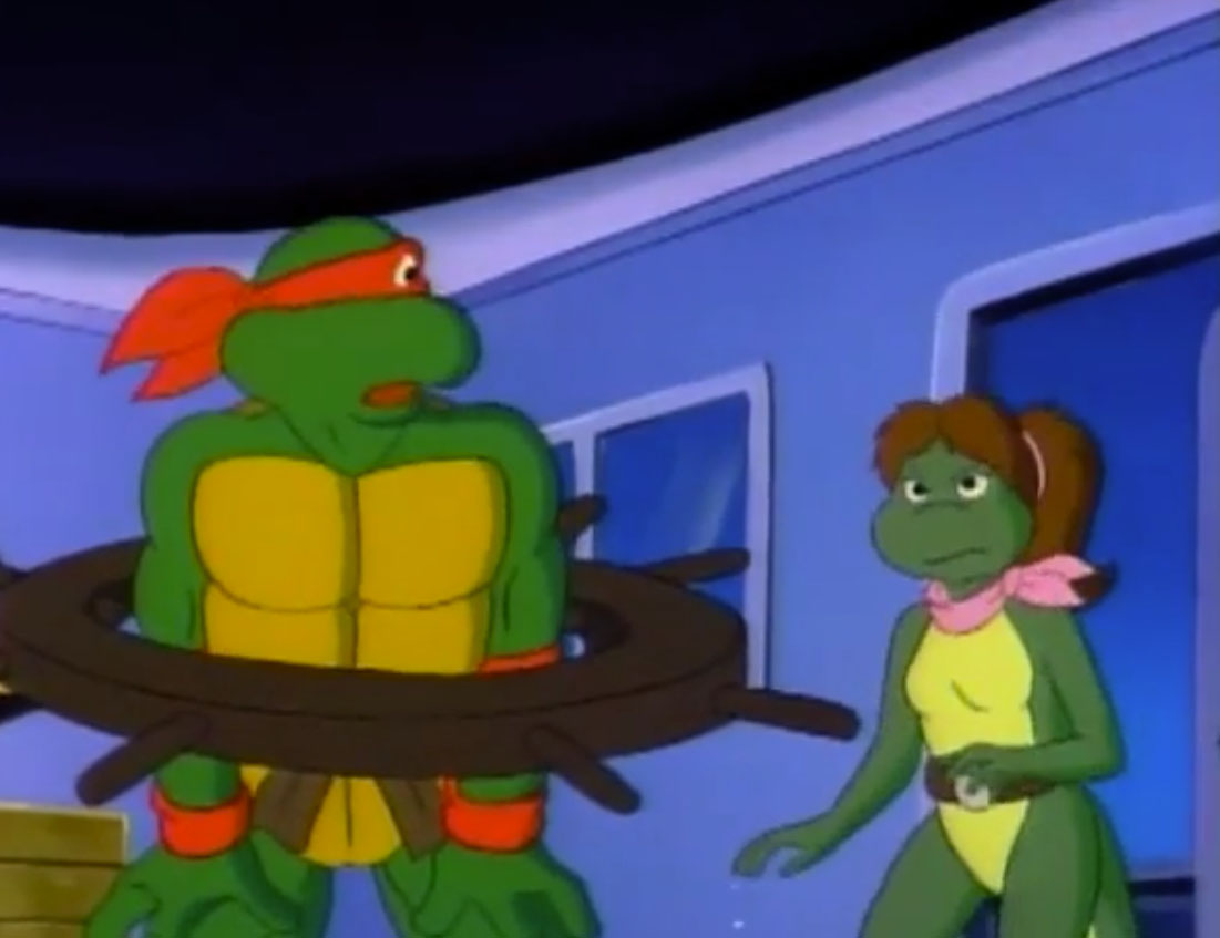 De retour à New York, Raphael repensait à Mona Lisa et regrettait d’avoir laissé une si bonne amie derrière lui. Il ignorait qu’April avait invité la salamandre dans le repaire des tortues. Elle les attendait avec des pizzas (Raphael en croisière, S4 E17).