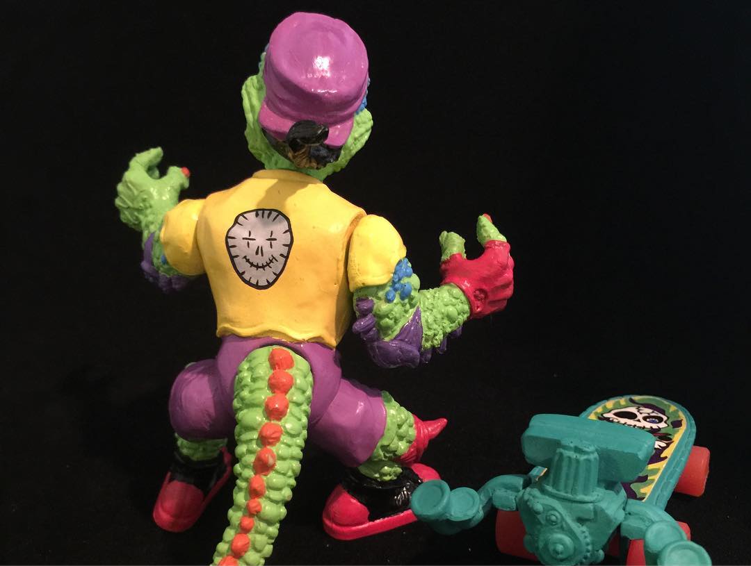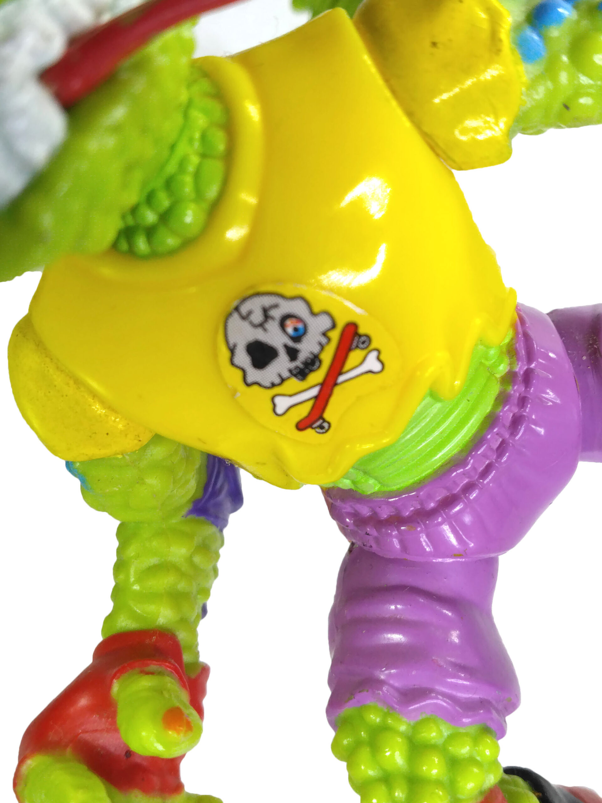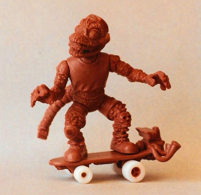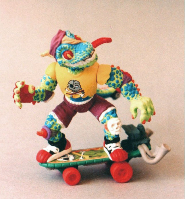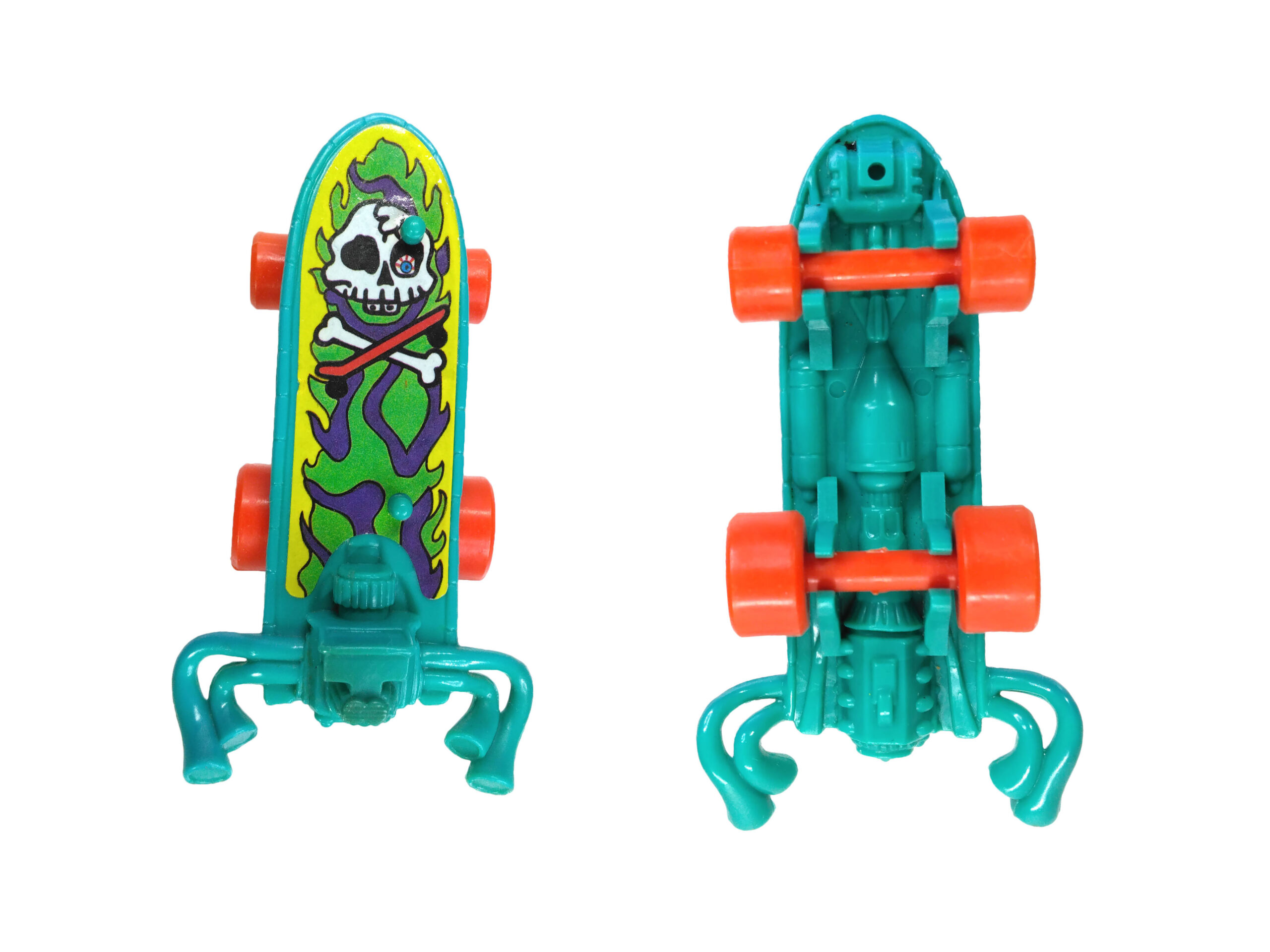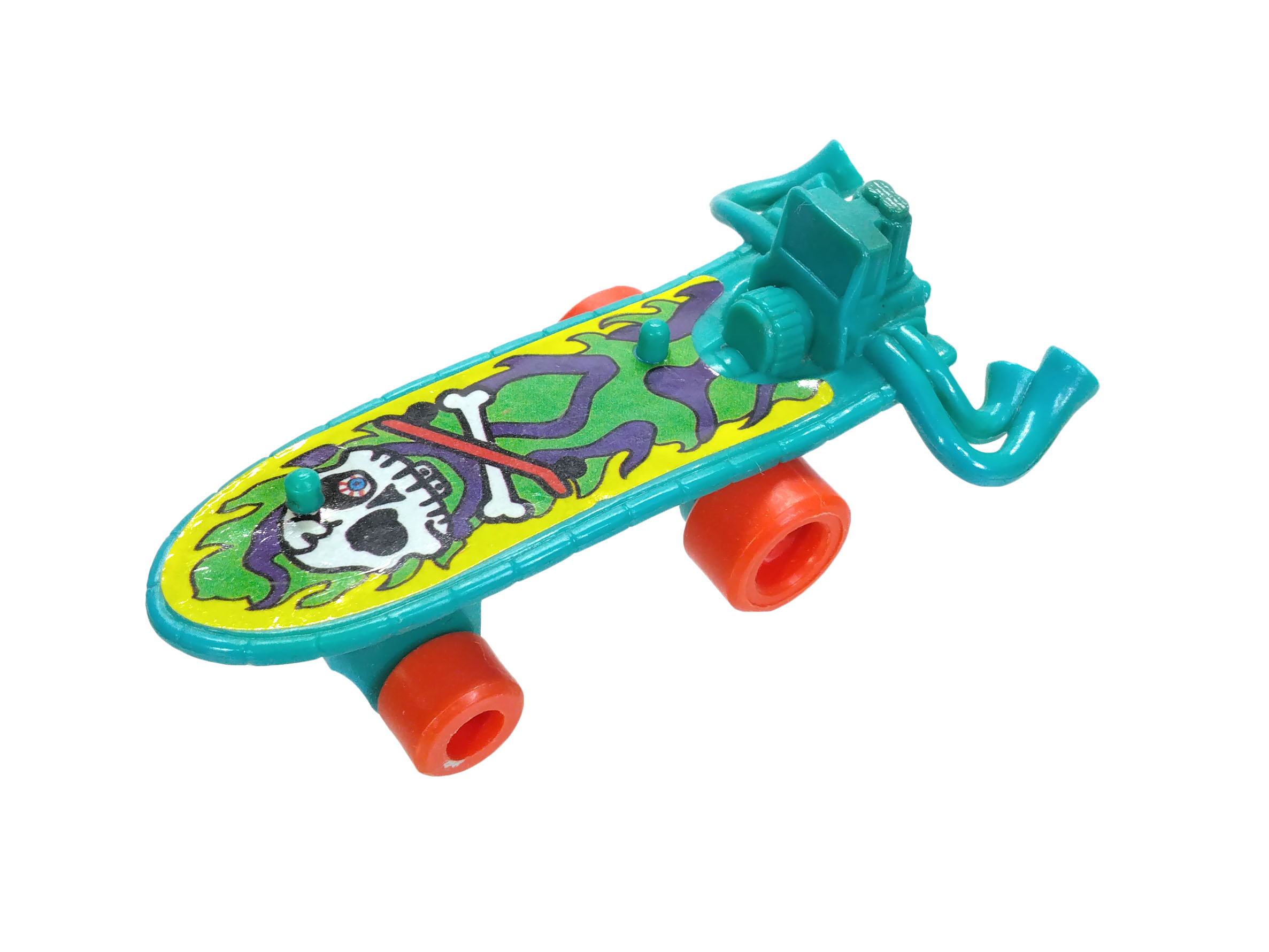 Ce skateboard est assez particulier, puisqu’il s’agit du deuxième modèle proposé par Playmates Toys. Deuxième, car le fabricant avait déjà sorti le cheapskate en 1988 ! Et ce premier bolide, assez similaire sur le principe, était autrement plus imposant.