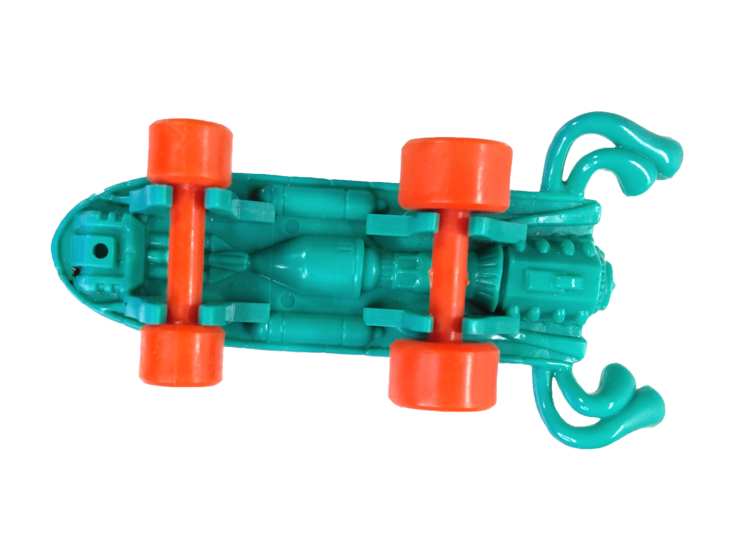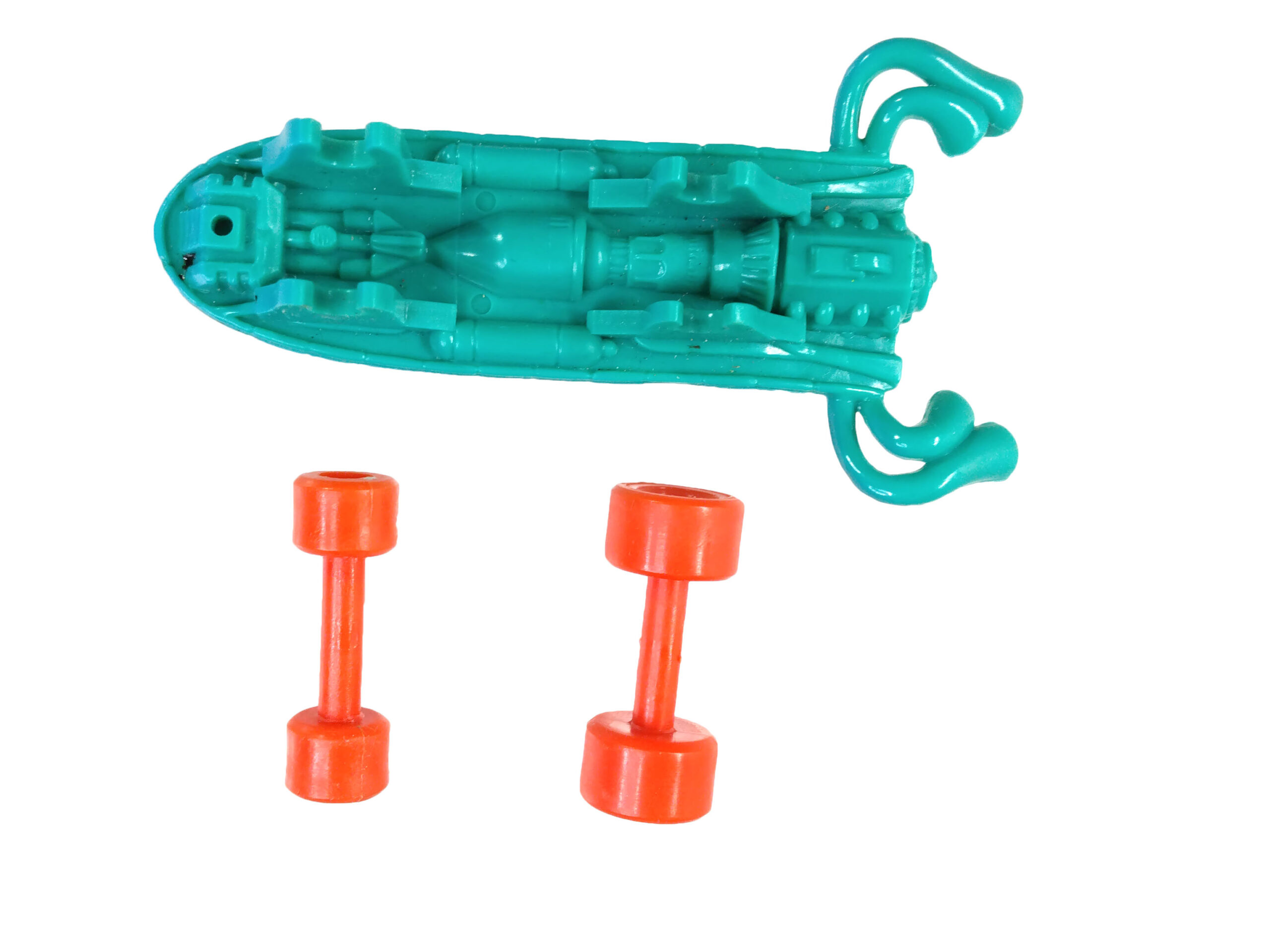 Mondo Gecko n’est accompagné que de sa planche de skate. Il ne s’agit pas d’une planche classique, puisque celle-ci est extrêmement détaillée sur la partie basse, avec toutes sortes d’éléments mécaniques comme les propulseurs. Un sticker est déjà collé sur la planche. Deux pegs dépassent du plateau pour y fixer le personnage.