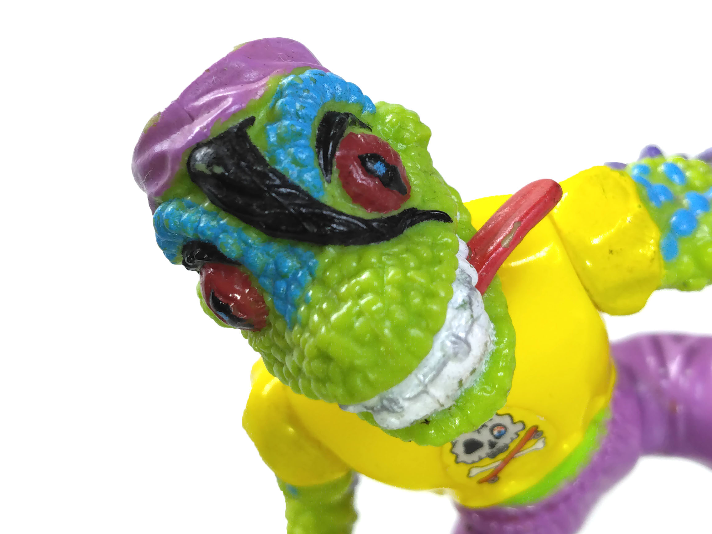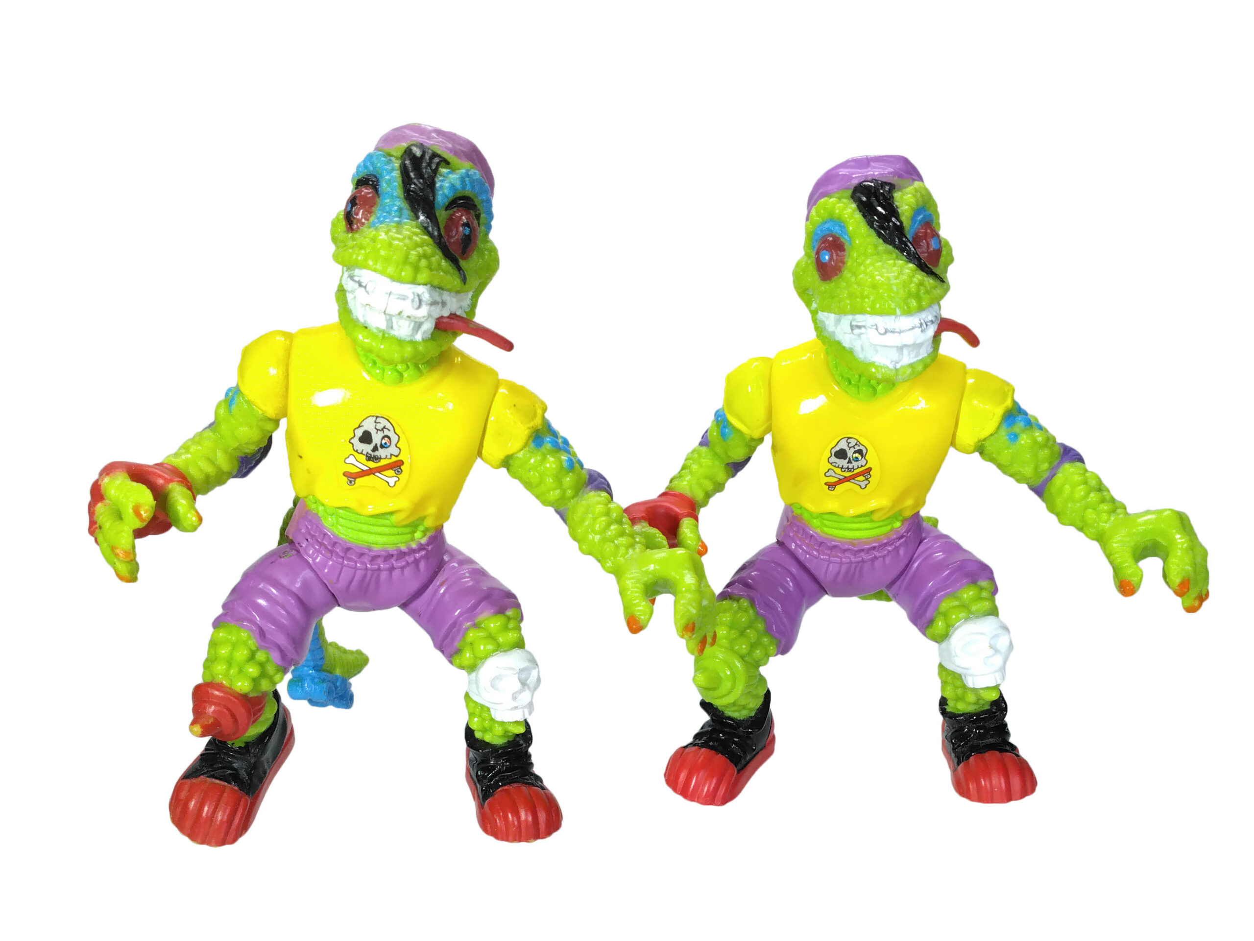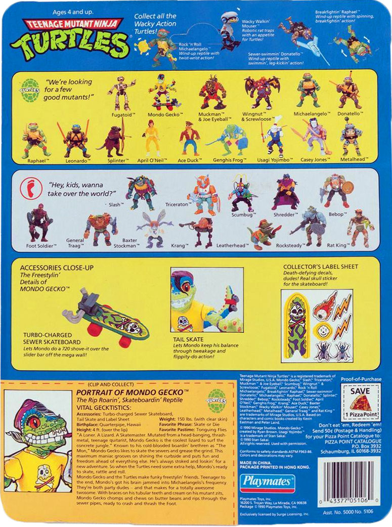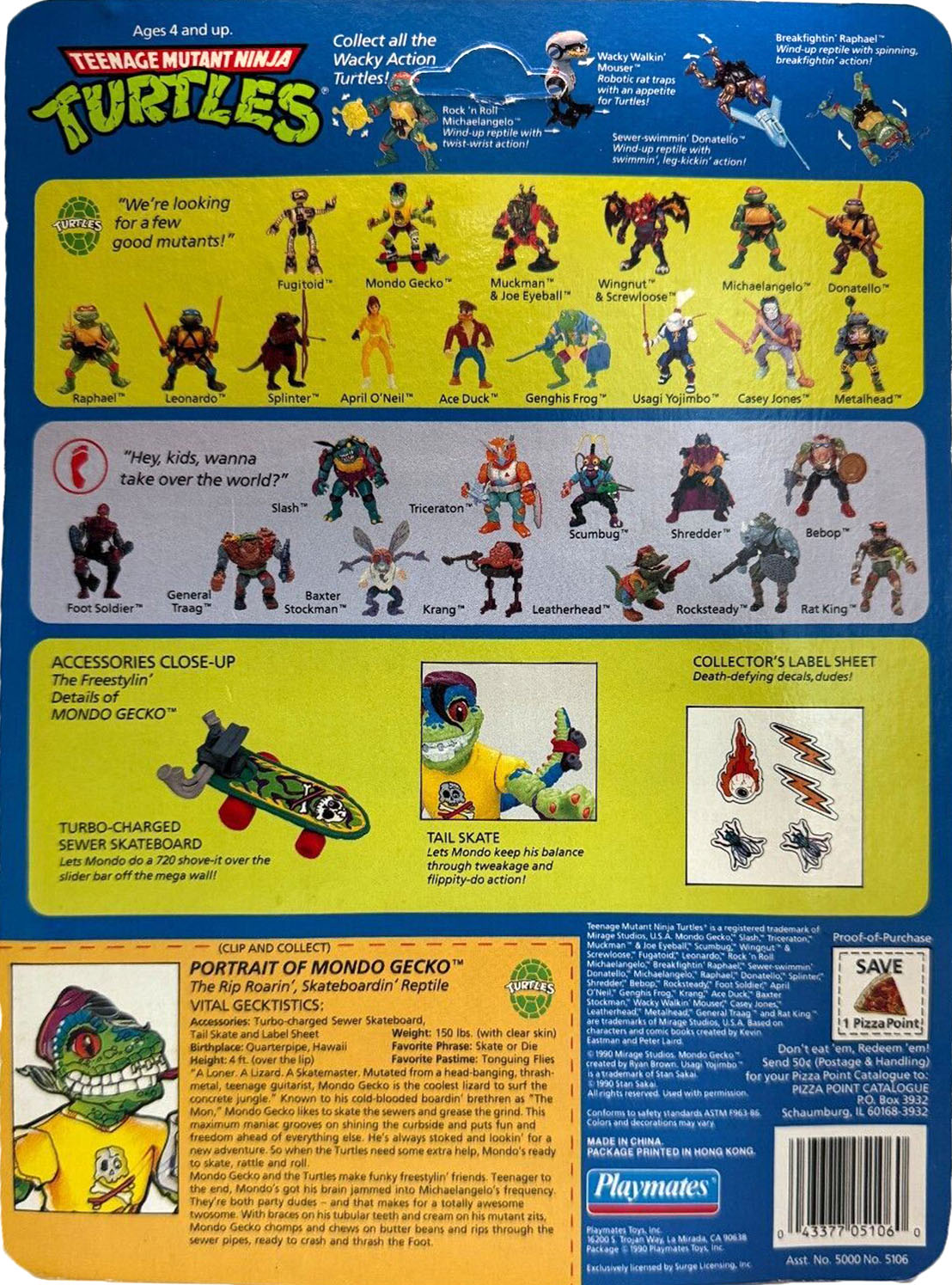Mondo Gecko est apparu au deuxième trimestre de l’année 1990, aux côtés de Wingnut & Screwloose, Muckman & Joe Eyeball et Scumbug, pour la wave 4. Toutefois, détail intéressant, son blister présente 31 figurines, contre 28 pour les trois autres personnages sortis à la même époque. Nous pouvons donc penser que le gecko le plus branché des égouts – ou tout du moins son blister – a été produit un petit peu plus tard par rapport aux autres figurines.