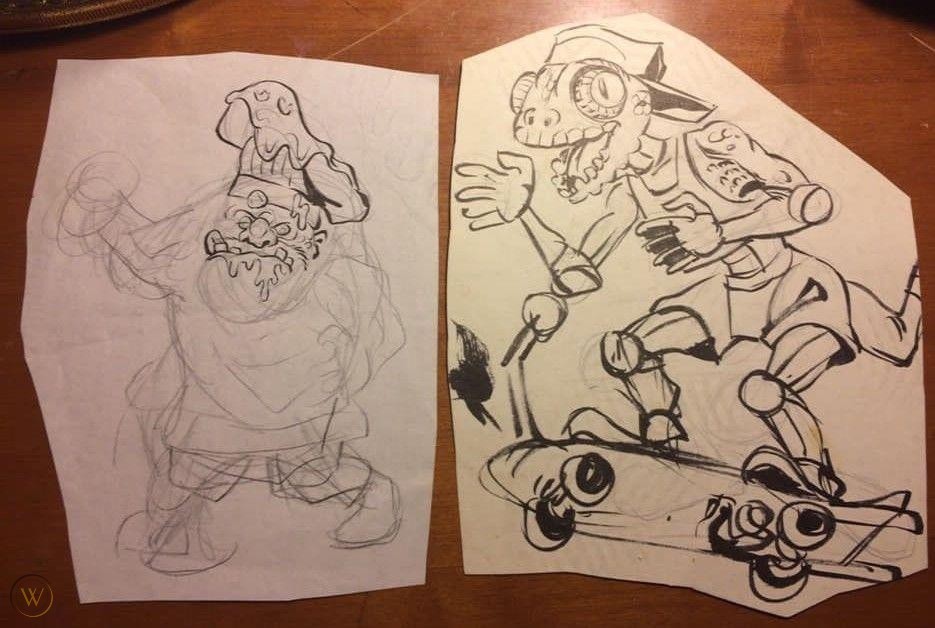 Le skateboard a également beaucoup évolué ; il ressemblait un petit peu plus à un cheapskate à l’origine, avec un arceau à l’arrière. À l’avant se trouvait une tête de mort en bobble head qui est devenu un simple sticker comme décoration de la planche dans la version finale. Rappelons au passage qu’un skateboard avait déjà été imaginé pour Genghis Frog l’année précédente !