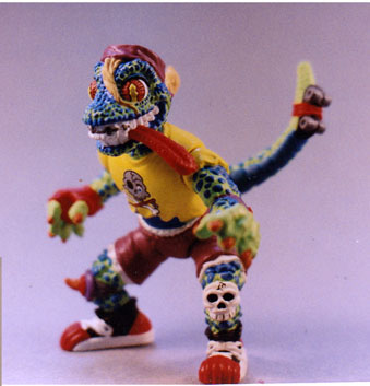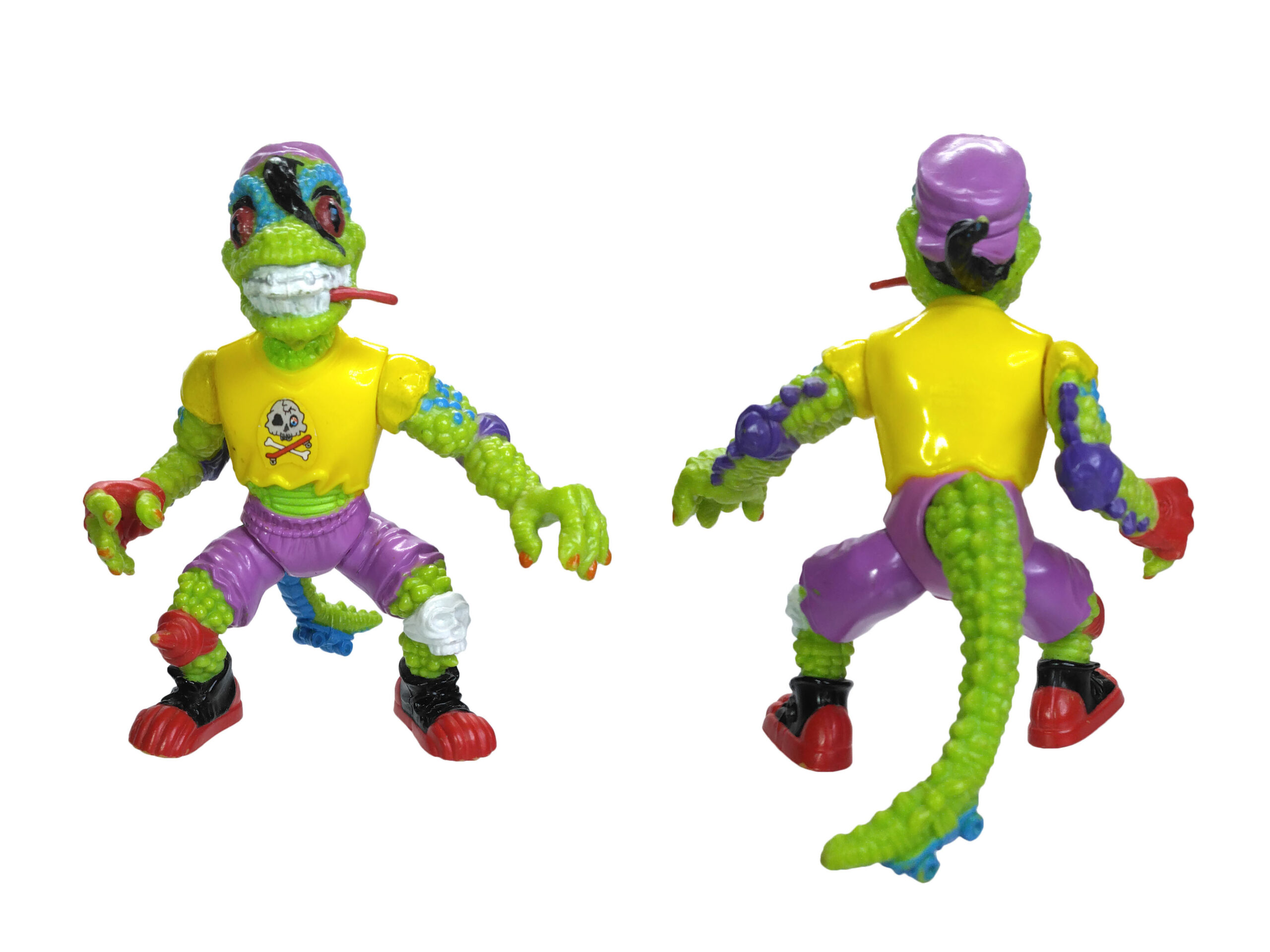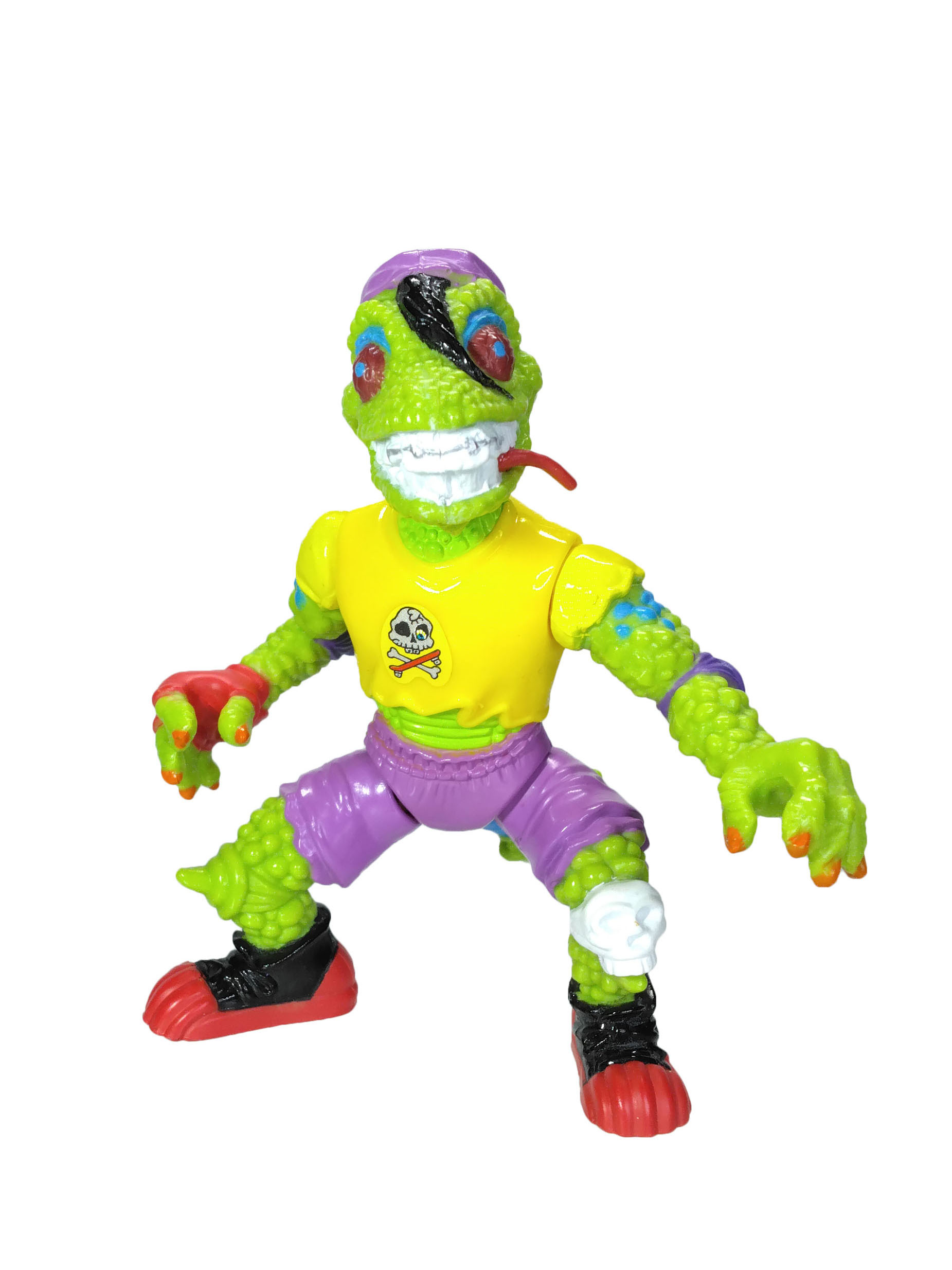 Mondo Gecko and the Turtles make funky freestylin’ friends. Teenager to the end, Mondo’s got his brain jammed into Michaelangelo’s frequency. They’re both party dudes – and that makes for a totally awesome twosome. With braces on his tubular teeth and cream on his mutant zits, Mondo Gecko chomps and chews on butter beans and rips through the sewer pipes, ready to crash and thrash the Foot.