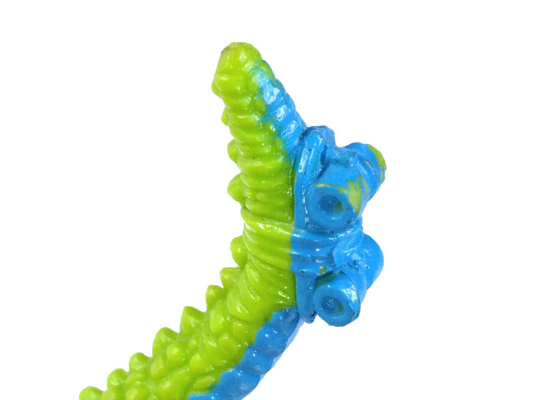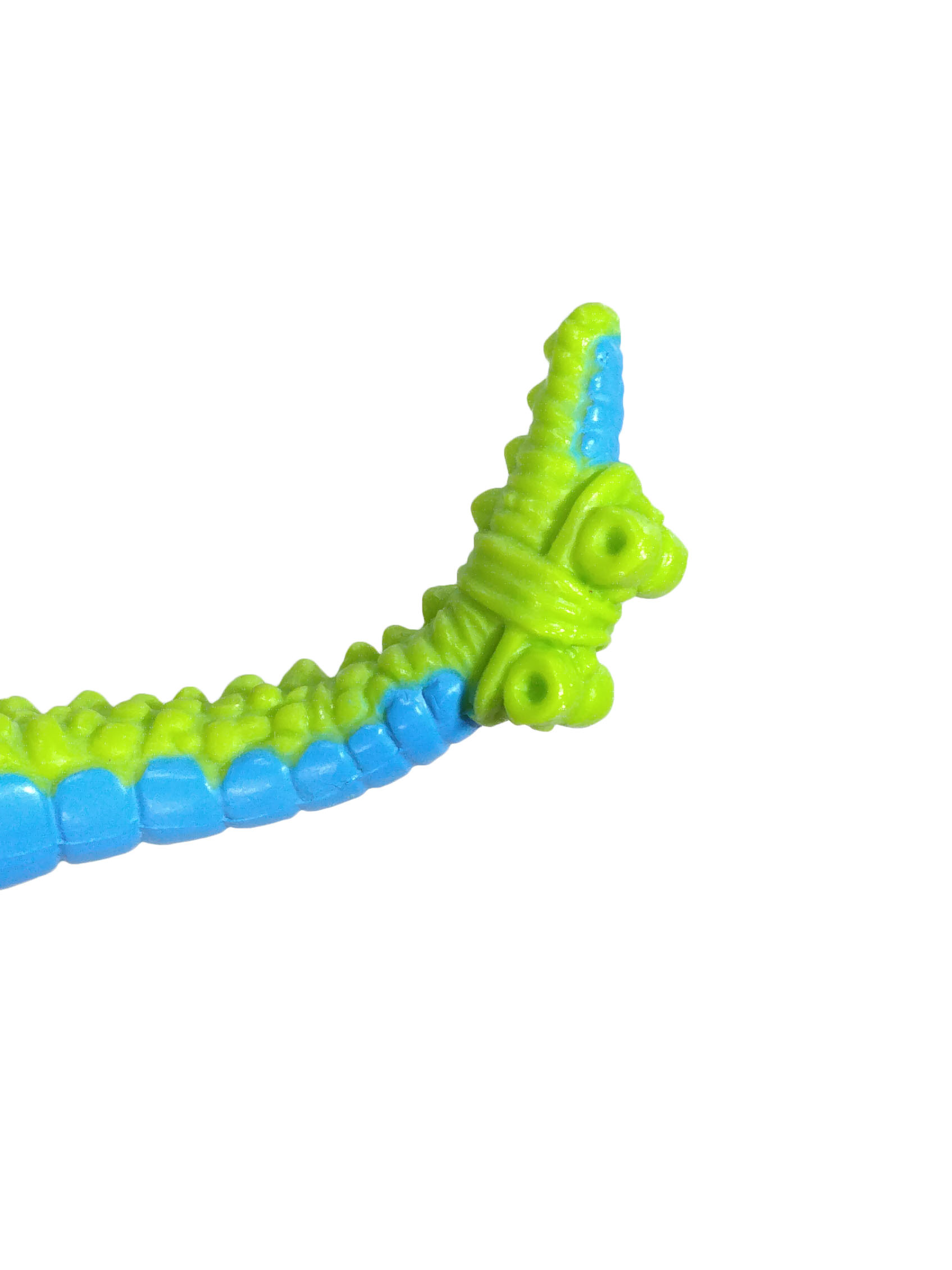 Du côté du visage, nous retrouvons le même traitement du reste de la peau, avec une attention poussée sur les écailles et les reliefs poussés. Notre gecko possède même un appareil dentaire ! Ses grands yeux sont implacablement encrés sous d’imposants sourcils, plus ou moins mis en évidence par la peinture, comme nous allons le voir ci-dessous. Enfin, la queue n’est pas en reste, avec même un patin accroché à l’aide de bandages.