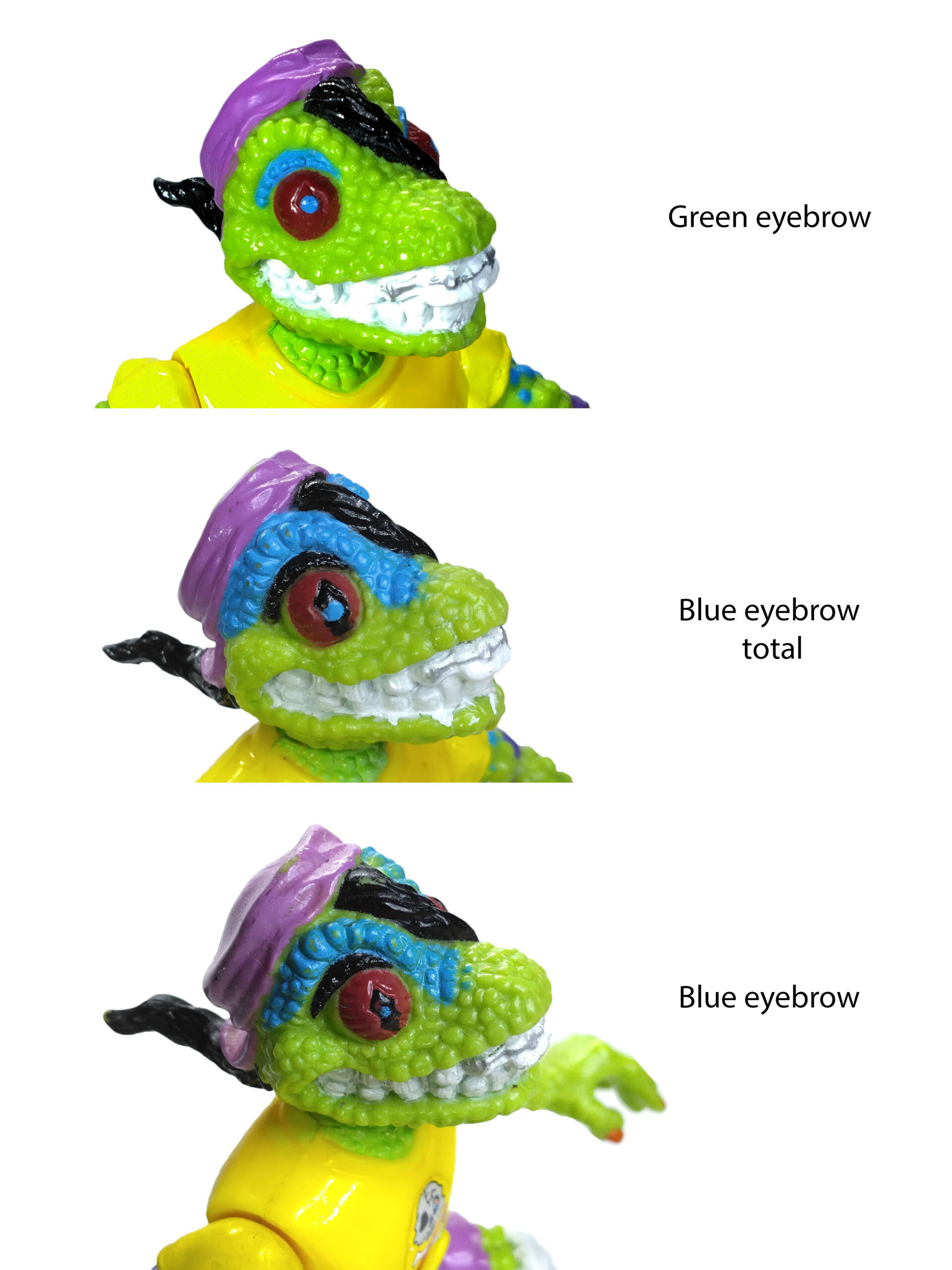 La version blue eyebrow propose beaucoup plus de couleurs sur la figurine. Au niveau des sourcils bien entendu, mais aussi au niveau du patin accroché à sa queue. Sur la version green eyebrow, le patin est généralement laissé de la couleur du plastique, tout comme la genouillère droite, qui n’est pas peinte en rouge. De même, les pupilles du personnage sont uniquement bleues, sans noir au milieu des yeux rouges. Il existe certaines figurines green eyebrow avec un patin bleu. Il s’agit simplement d’une inversion du membre.