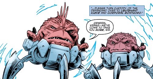 Au cours du procès de Krang, avant de donner son jugement final, le roi Zenter demanda à Ma’Riell son avis sur l’affaire. Ils se mirent d’accord pour que l’utrom soit exilé sur Burnow Island, auprès des siens. Kleve et Montuoro étaient venus en personne pour mettre les menottes à Krang et l’emmener avec eux. Leatherhead, déçu de sa condamnation, se jeta sur le général déchu et le dévora sur le champ. Les deux utroms demandèrent à Zenter de ne pas en parler à Ma’Riell, leur laissant la possibilité de le faire eux-mêmes. De retour à Burnow Island, il n’était pas question d’en avertir leur supérieure. En réalité, Kleve était décidé à retrouver la trace de l’alligator. Les utroms étant des parasites, il savait que le général n’était pas mort (TMNT #100). Ils voulaient également profiter du climat établi pour ramener Ch’Rell à la conscience (TMNT #75).