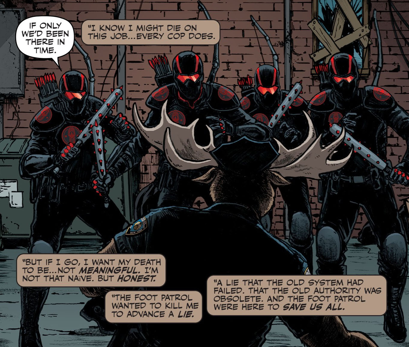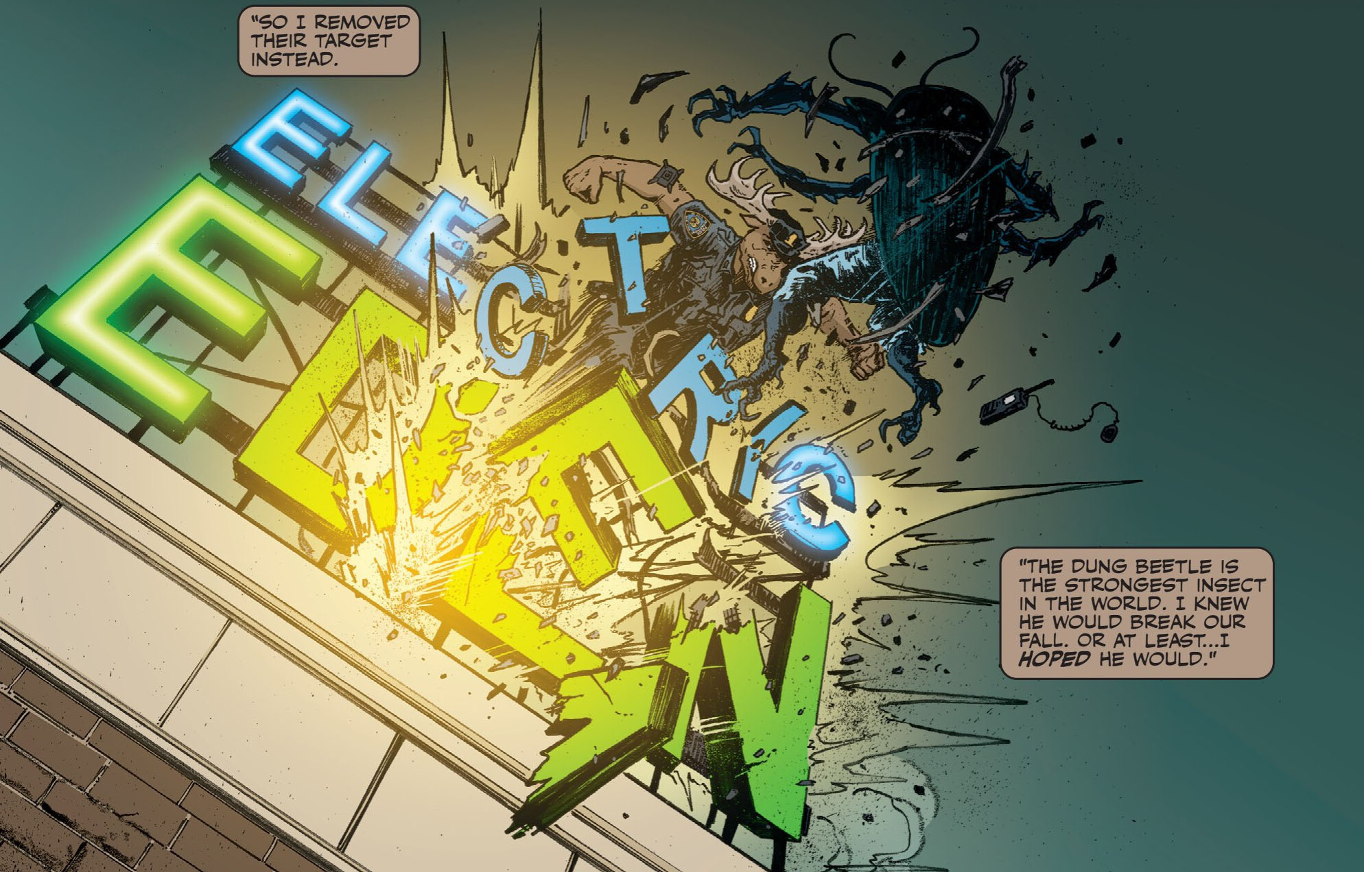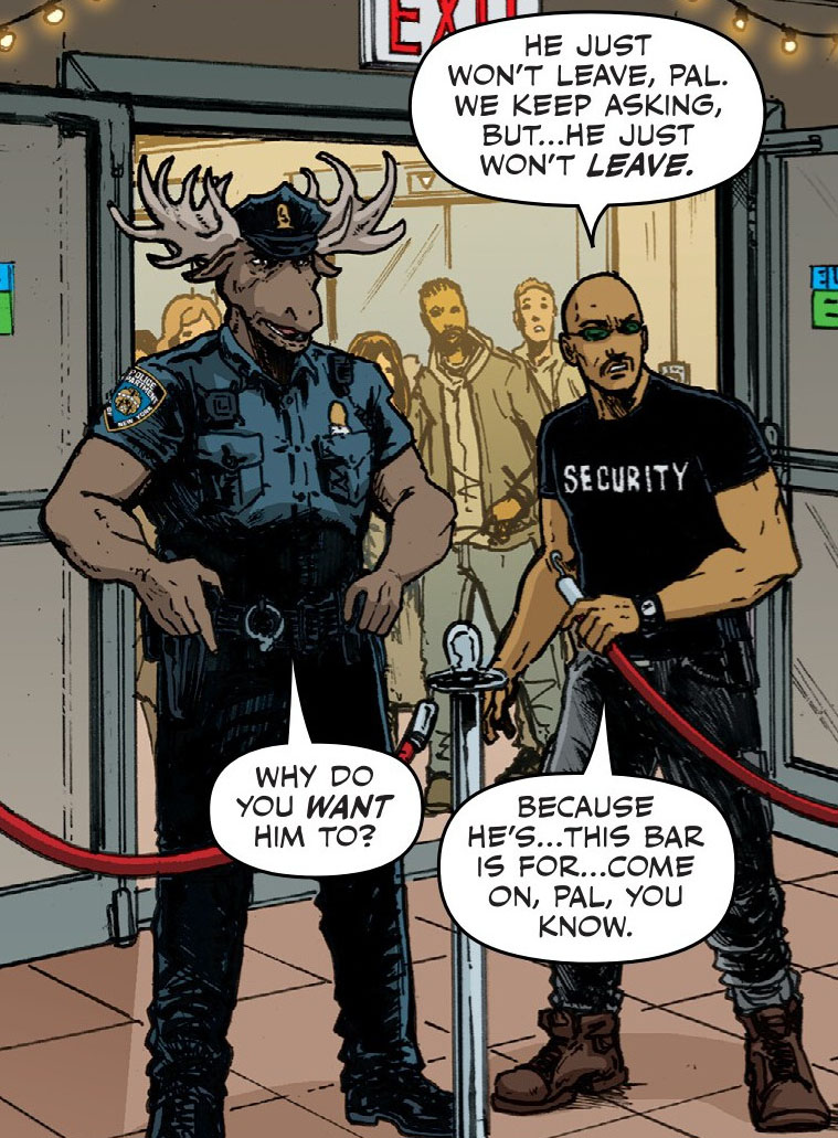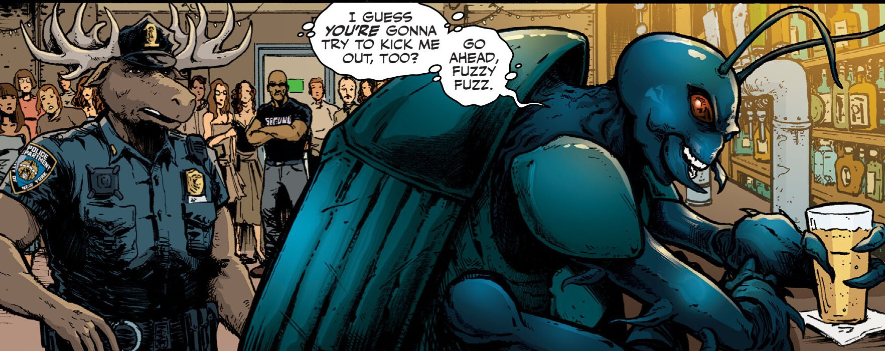 Un soir, Monty fut appelé pour appréhender un bousier mutant qui dérangeait les clients d’un nightclub. Dans un premier temps, l’élan chercha à entamer le dialogue et faire connaissance avec celui qui se nommait Kingston. Plutôt éméché, l’insecte accepta finalement de discuter. Mais au même moment, les Foot patrols arrivèrent et avec la brutalité qui les caractérisait et mirent le souque dans l’établissement. L’officier de police, qui avait appelé des renforts auprès de son équipe, poussa le bousier à s’enfuir pour faire le moins de victimes collatérales et le retrouva dans une ruelle.