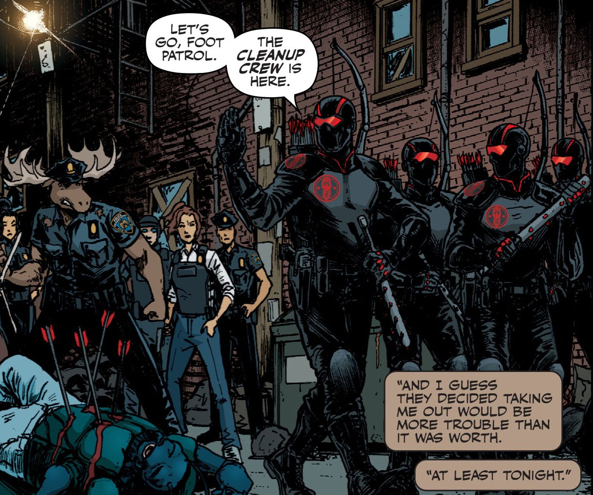 Toujours bien veillant, il faisait partie de l’équipe de Kara Lewis et veillait notamment sur les rues de Mutant Town. Il arrêta un soir Raphael, qui se trouvait sur les lieux d’un crime (TMNT #140). Il empêcha également Jennika par vriller. La jeune mutante se livrait à de nombreux combats dans les rues, parfois extrêmes, contre ceux qui ne toléraient pas la présence des mutants (Nightwatcher #2).
