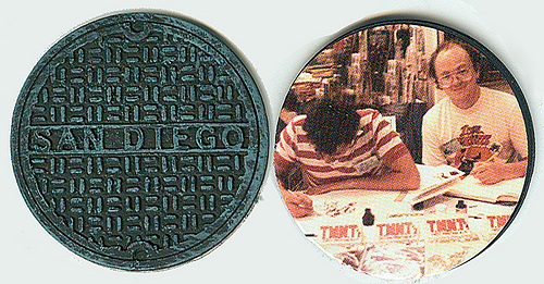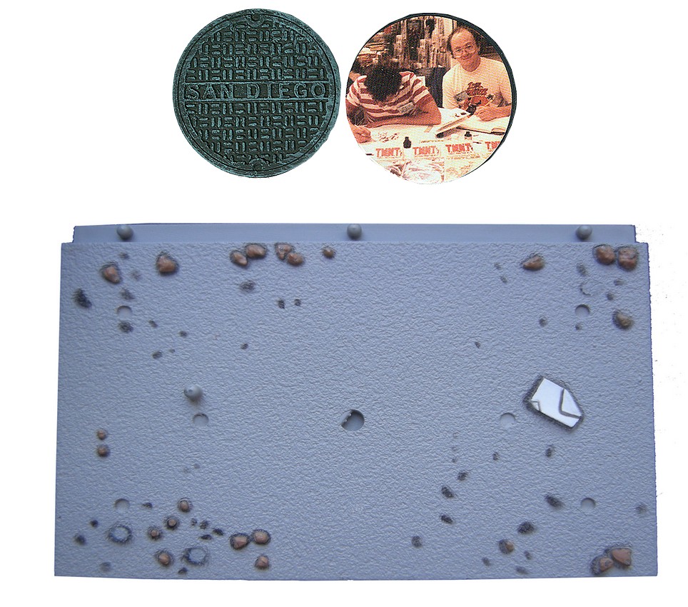 À ce pack s’ajoute également une petite plaque d’égout extrêmement fine et très bien sculptée, où il est écrit sur un côté San Diego, rappelant l’exclusivité de ce pack au salon internationalement réputé. De l’autre côté est collé une petite photo, un véritable instant kodak, présentant d’une séance de dédicaces de Peter Laird et de Kevin Eastman, les deux créateurs des Tortues Ninja. Difficile de savoir exactement de quand elle date, mais nous devinons sur la table le TMNT (Vol. 1) #4, sorti en juin 1985.