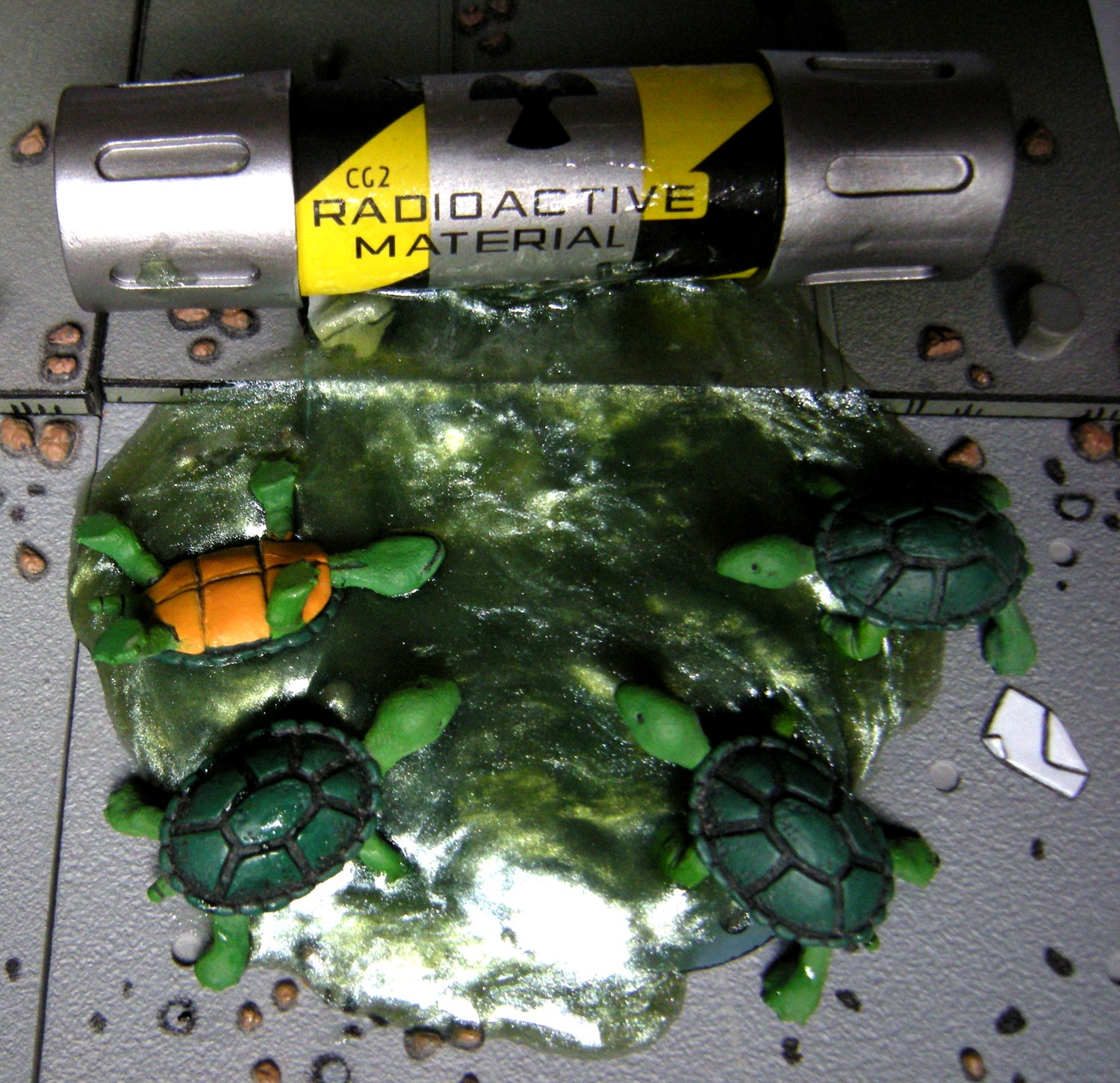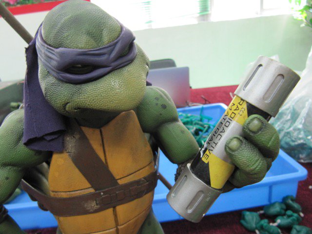 Le bocal de mutagène est un parfait compromis entre clin d’œil à l’univers des TMNT et respect de l’objet de base. Entièrement peint en métallisé, la partie principale est orné par les décorations que l’on pouvait voir sur le bocal dans le film, avec ses bandes jaunes et noires et le message Radioactive Material, surplombé par un symbole de danger d’agent biologique dangereux. La brèche qui éventre le bocal est identique également à celle visible dans le film.