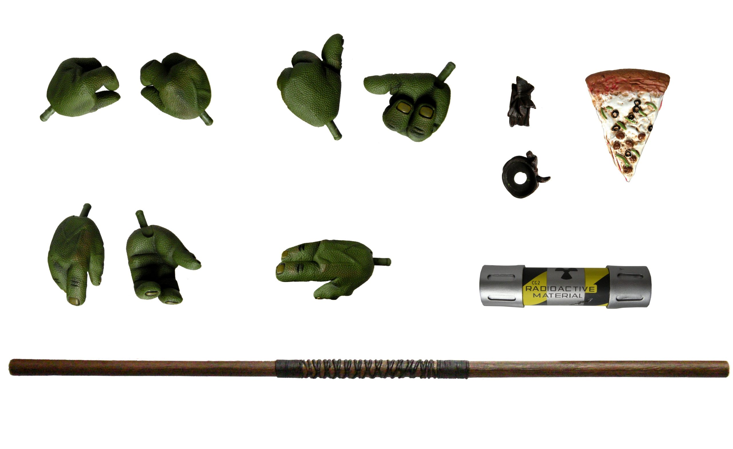 Donatello vient accompagné de sept mains (trois paires et une individuelle), une part de pizza, un bocal de mutagène et son bō. À cela, on peut éventuellement rajouter ses deux bracelets, amovibles lorsque l’on change les mains de la tortue.