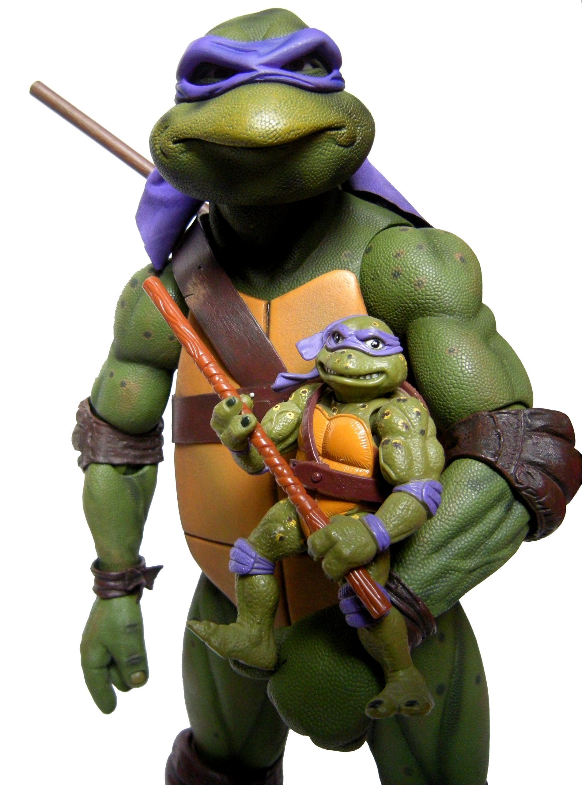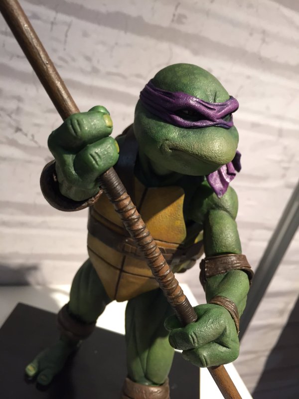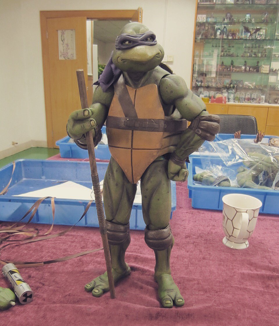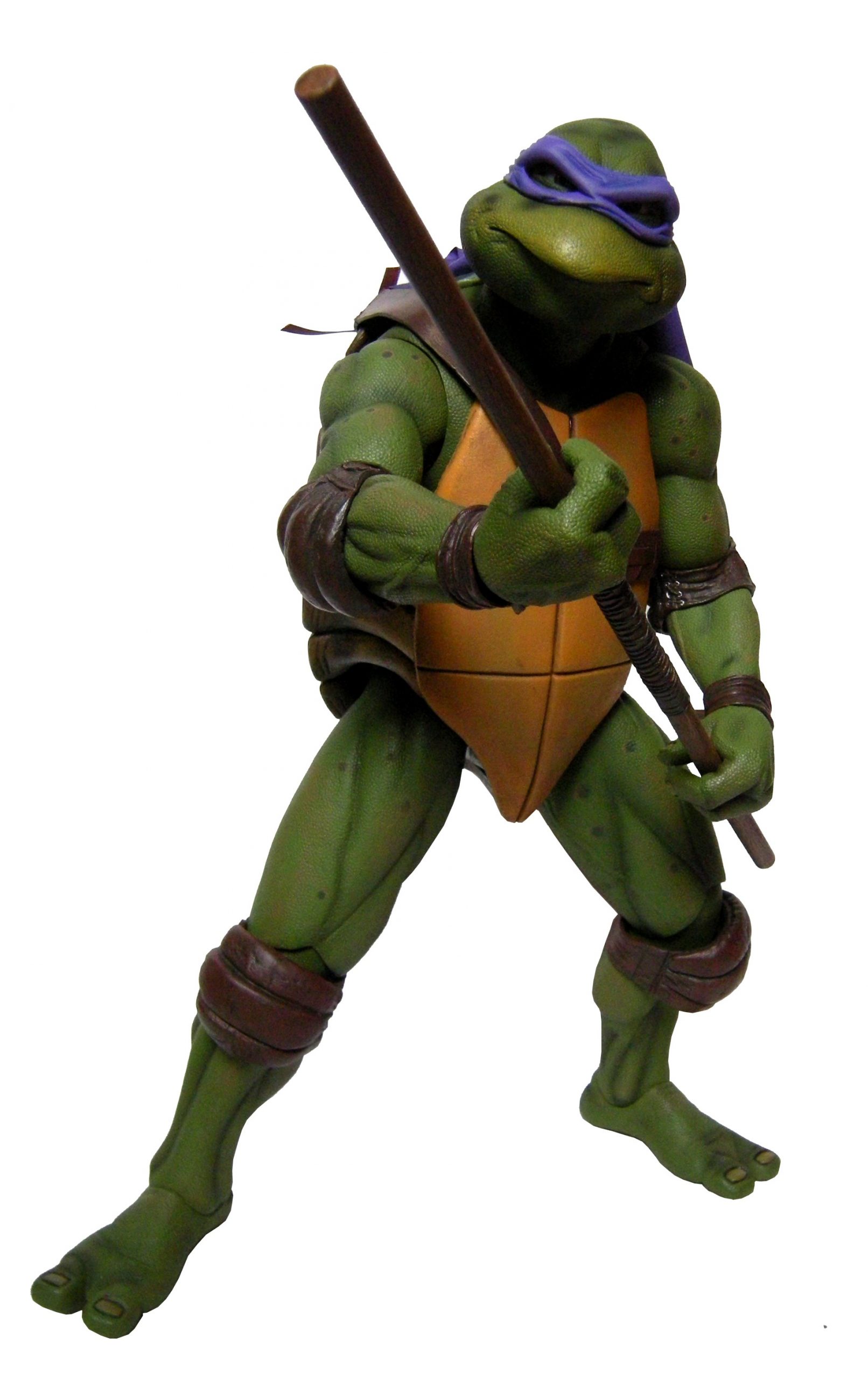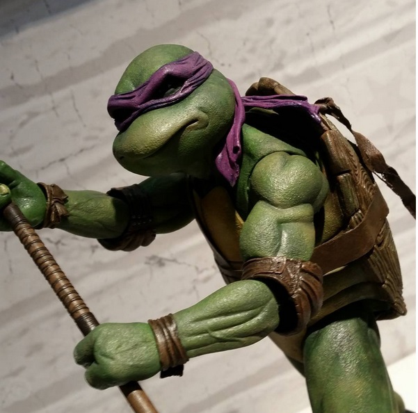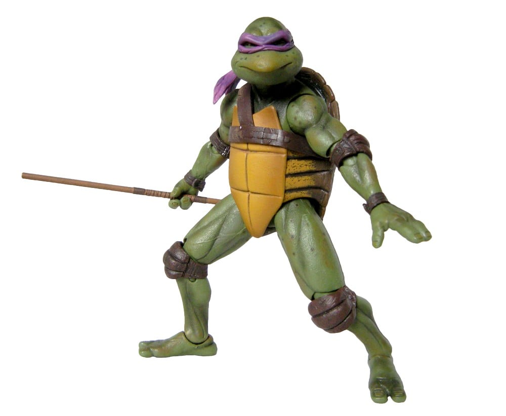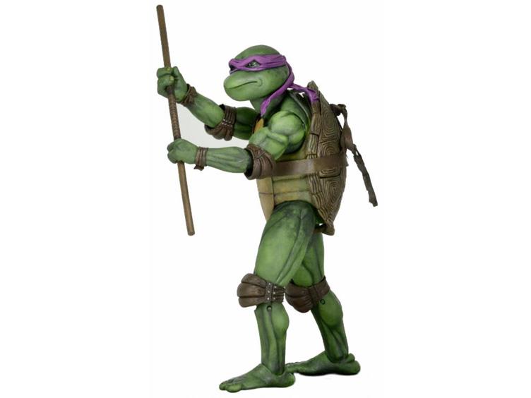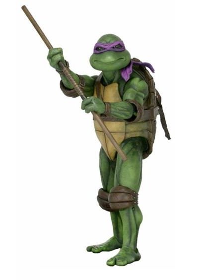 Donatello mesure 42 cm de haut. Cette dimension, si imposante, vient du fait que NECA n’a pas une liberté totale sur sa production de figurines de la licence TMNT. C’était déjà en partie ce qui leur avait fait arrêter en 2009. Dans le contrat signé en 2015 avec Nickelodeon, il est stipulé qu’ils ne peuvent vendre des figurines en dehors des États-Unis et que celles-ci ne peuvent être à l’échelle 7″, en dehors de produits réservés exclusivement aux grands salons, comme le pack de quatre tortues de ce même film, sorti en juillet 2018 à l’occasion du San Diego Comic Con et qui reprennent à l’exactitude ces figurines de 42 cm, à plus petite échelle. Avec l’assouplissement de cet accord, les figurines 7″ purent être vendues aux États-Unis en exclusivité chez Gamestop à partir de septembre 2018, puis à l’automne 2019 en France.