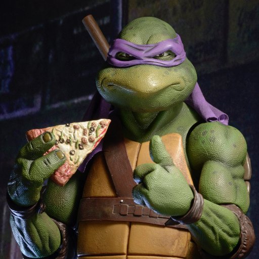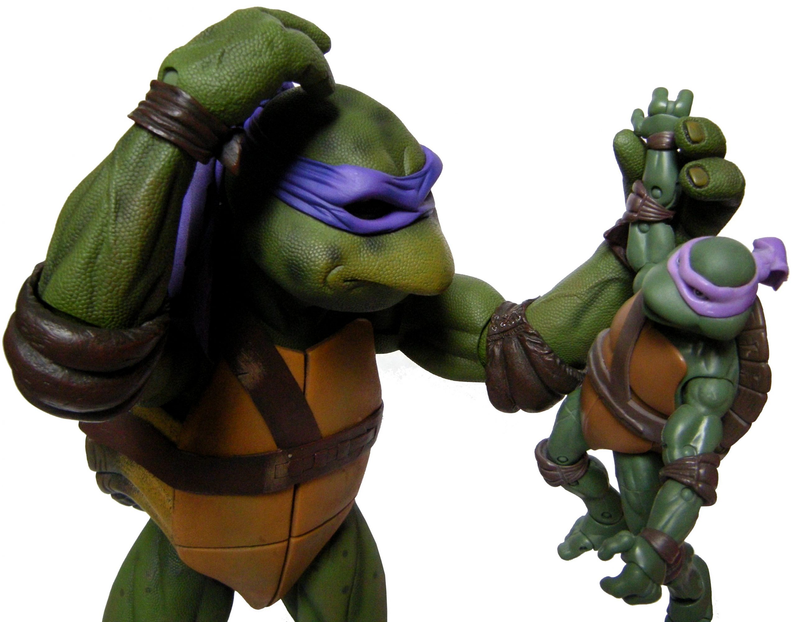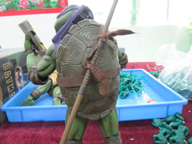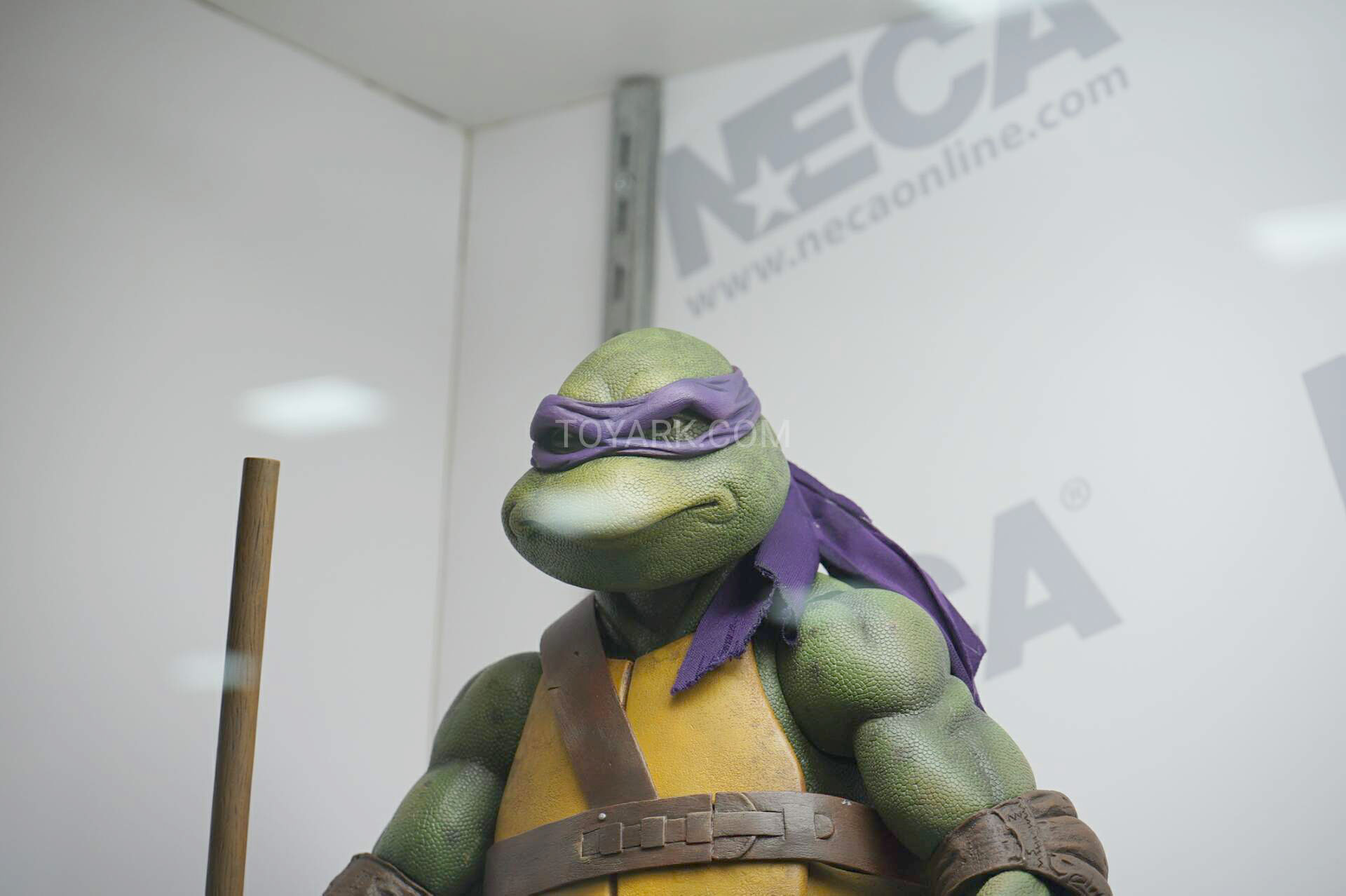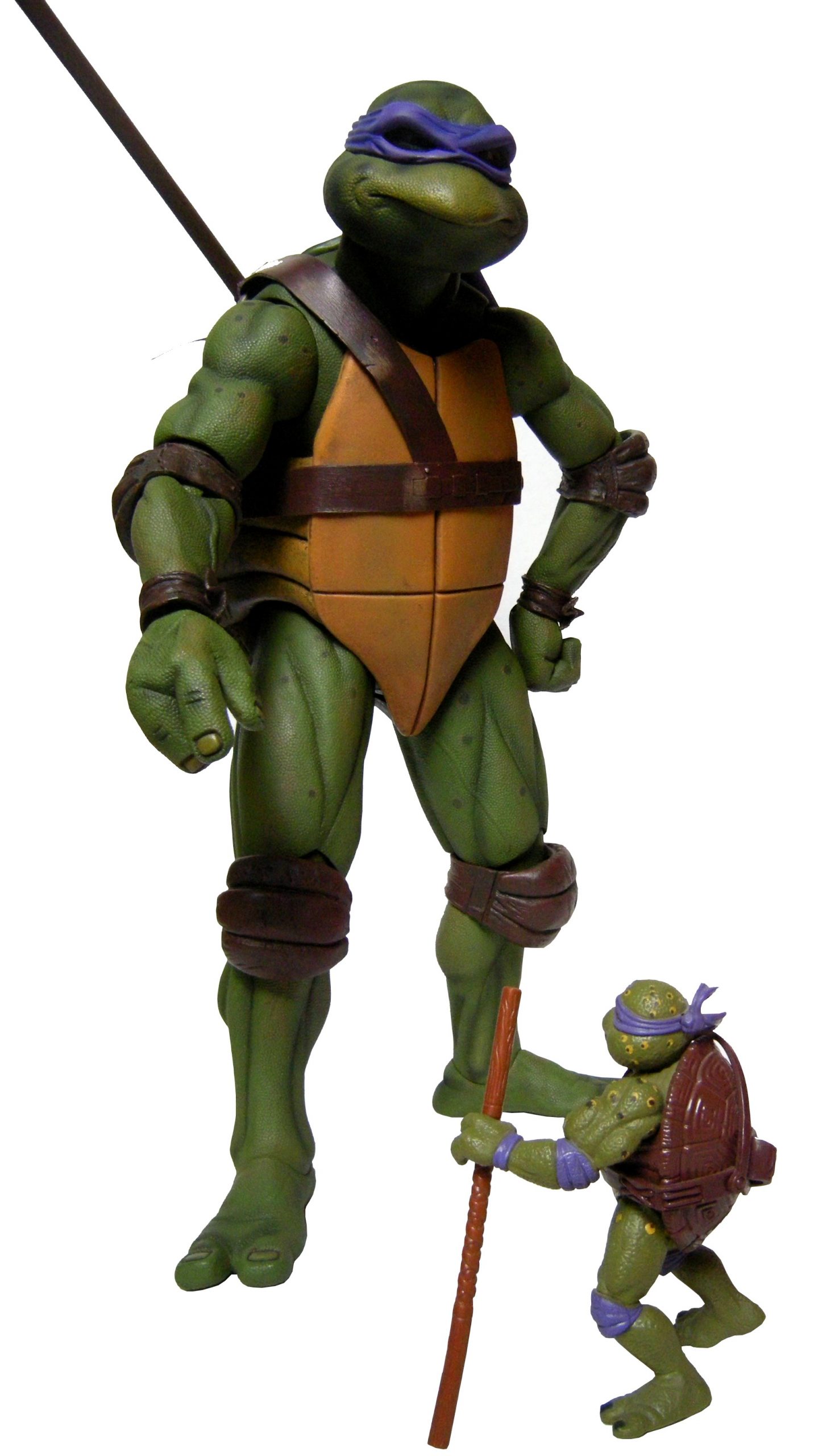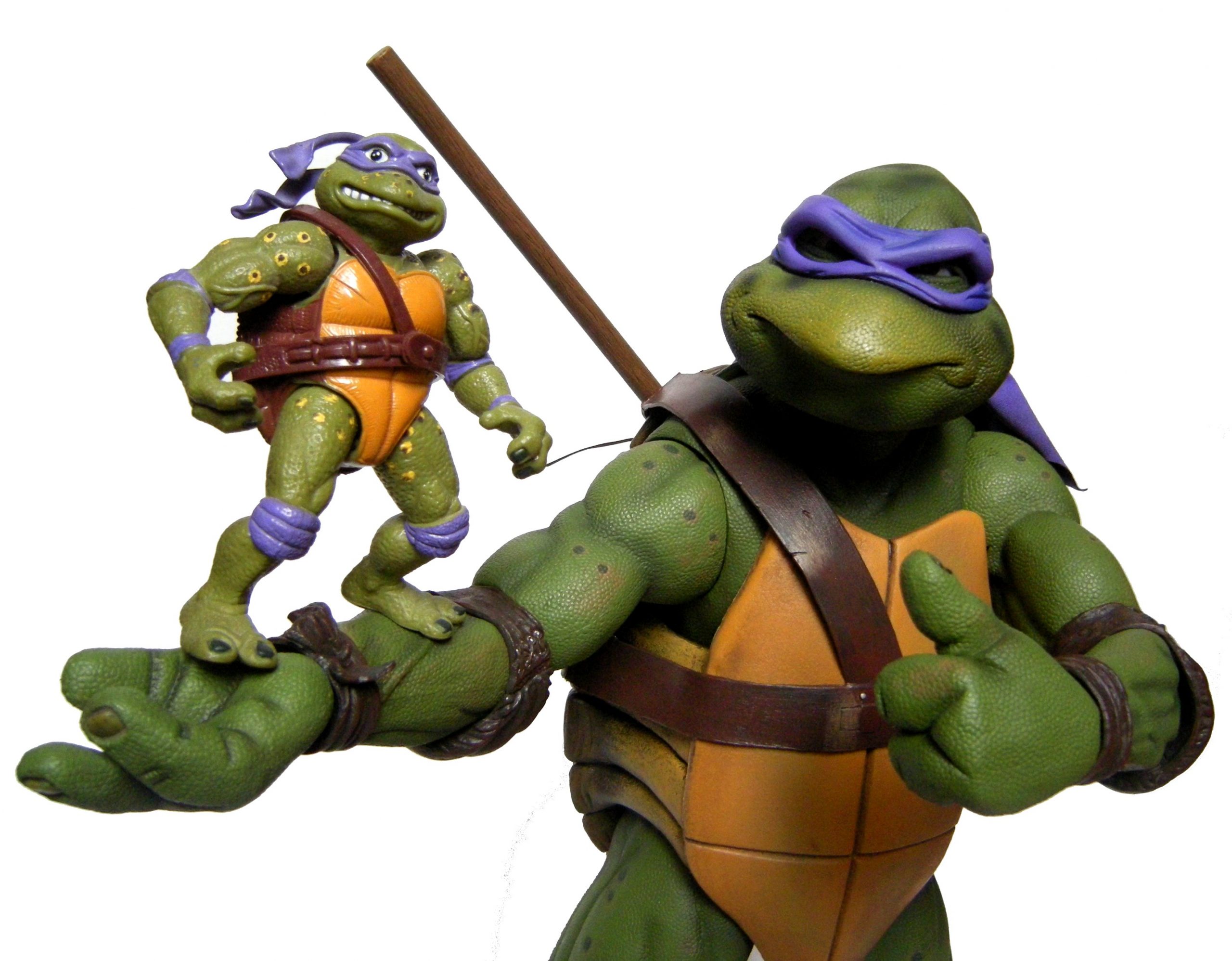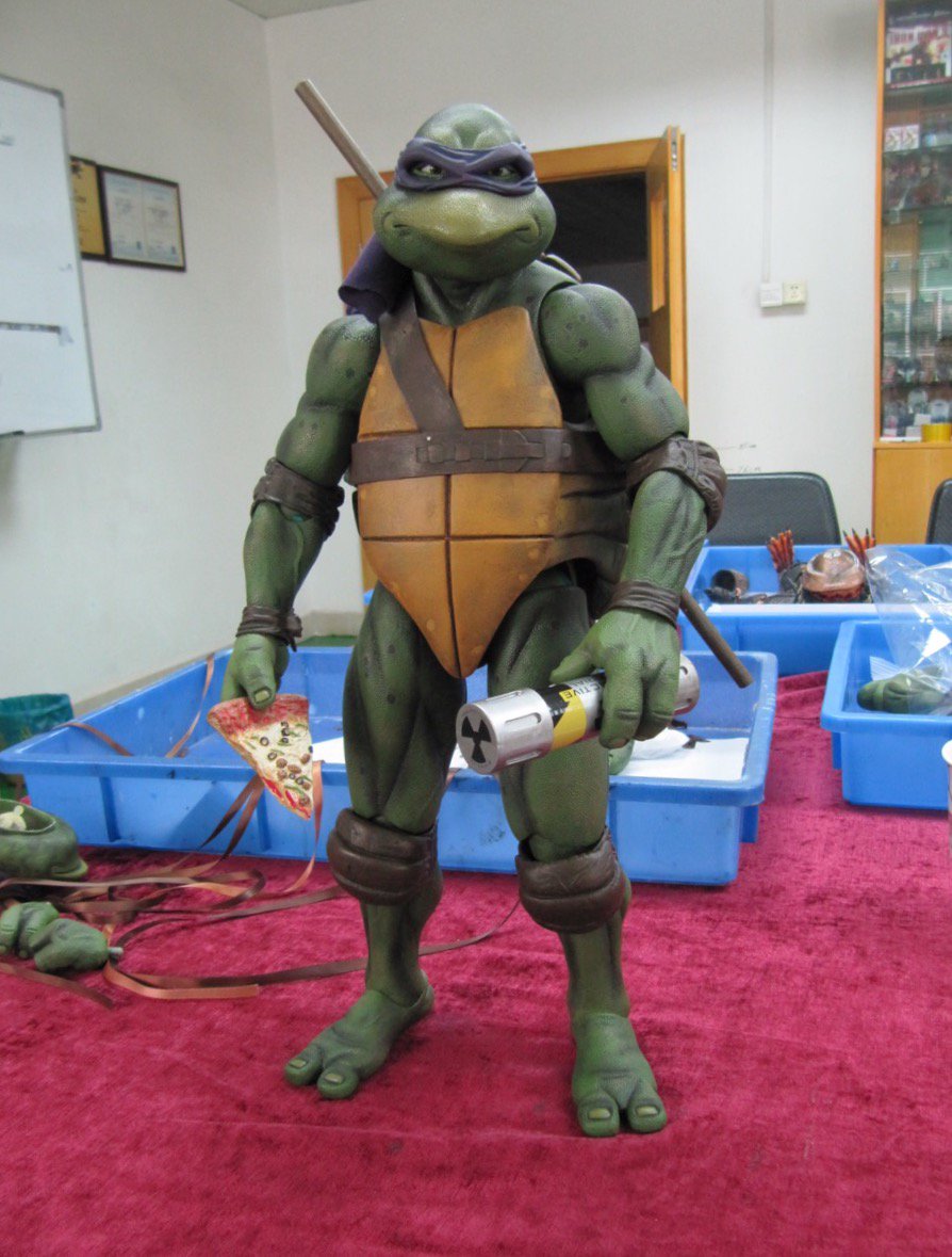 Donatello mesure 42 cm de haut. Cette dimension, si imposante, vient du fait que NECA n’a pas une liberté totale sur sa production de figurines de la licence TMNT. C’était déjà en partie ce qui leur avait fait arrêter en 2009. Dans le contrat signé en 2015 avec Nickelodeon, il est stipulé qu’ils ne peuvent vendre des figurines en dehors des États-Unis et que celles-ci ne peuvent être à l’échelle 7″, en dehors de produits réservés exclusivement aux grands salons, comme le pack de quatre tortues de ce même film, sorti en juillet 2018 à l’occasion du San Diego Comic Con et qui reprennent à l’exactitude ces figurines de 42 cm, à plus petite échelle. Avec l’assouplissement de cet accord, les figurines 7″ purent être vendues aux États-Unis en exclusivité chez Gamestop à partir de septembre 2018, puis à l’automne 2019 en France.