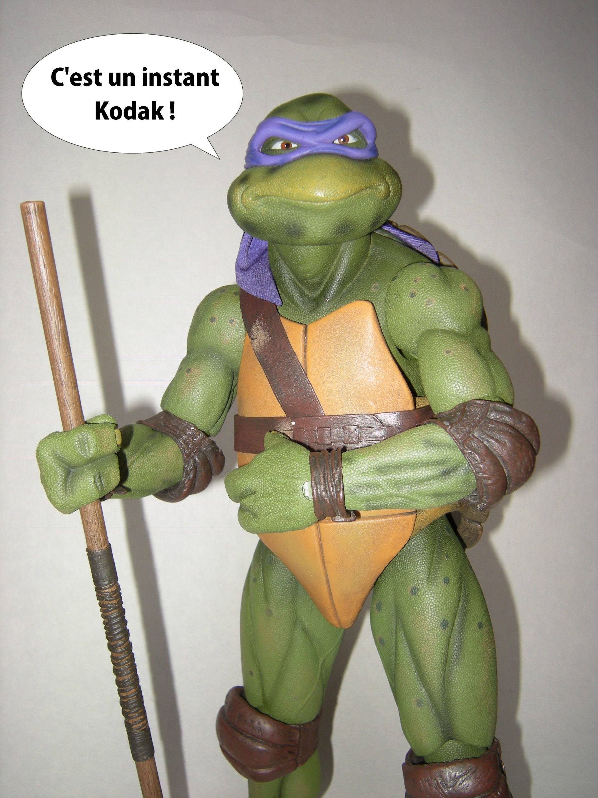 En conclusion, nous avons ici une figurine quasiment parfaite. Quelques défauts certes, des finitions de peinture qui auraient pu être meilleures, des articulations plus poussées. Sur ces dernières, en y réfléchissant bien, NECA a tout simplement trouvé la bonne option pour donner au collectionneur un compromis entre une figurine pouvant adopter quelques positions de base sans pour autant l’en dénaturer. Lorsque l’on regarde le travail médiocre de Playmates Toys sur ses Classic collection du film de 1990, qui rappelons-le, sont destinées à des collectionneurs, nous retrouvons des figurines surchargées en articulations, qui pour la plupart sont inutiles et qui fragilisent l’équilibre de la figurine dans ses postures et polluent son aspect général. Donatello, comme ses frères, est une véritable pièce pour collectionneurs aux mouvements variés et qui est parfaite pour être admirée derrière une vitrine. Le travail du détail est une grande première pour une figurine issue de ce film, trop souvent bâclé, une fois encore, par Playmates et ses soi-disant gammes pour collectionneurs. NECA a su offrir aux fans un bijou rendant parfaitement honneur au costume original du film de 1990. Comment oublier ces nombreux détails pourtant ô combien parfaits, comme le bō, les lanières des ceintures ou encore la personnalisation presque parfaite du visage de la tortue ?