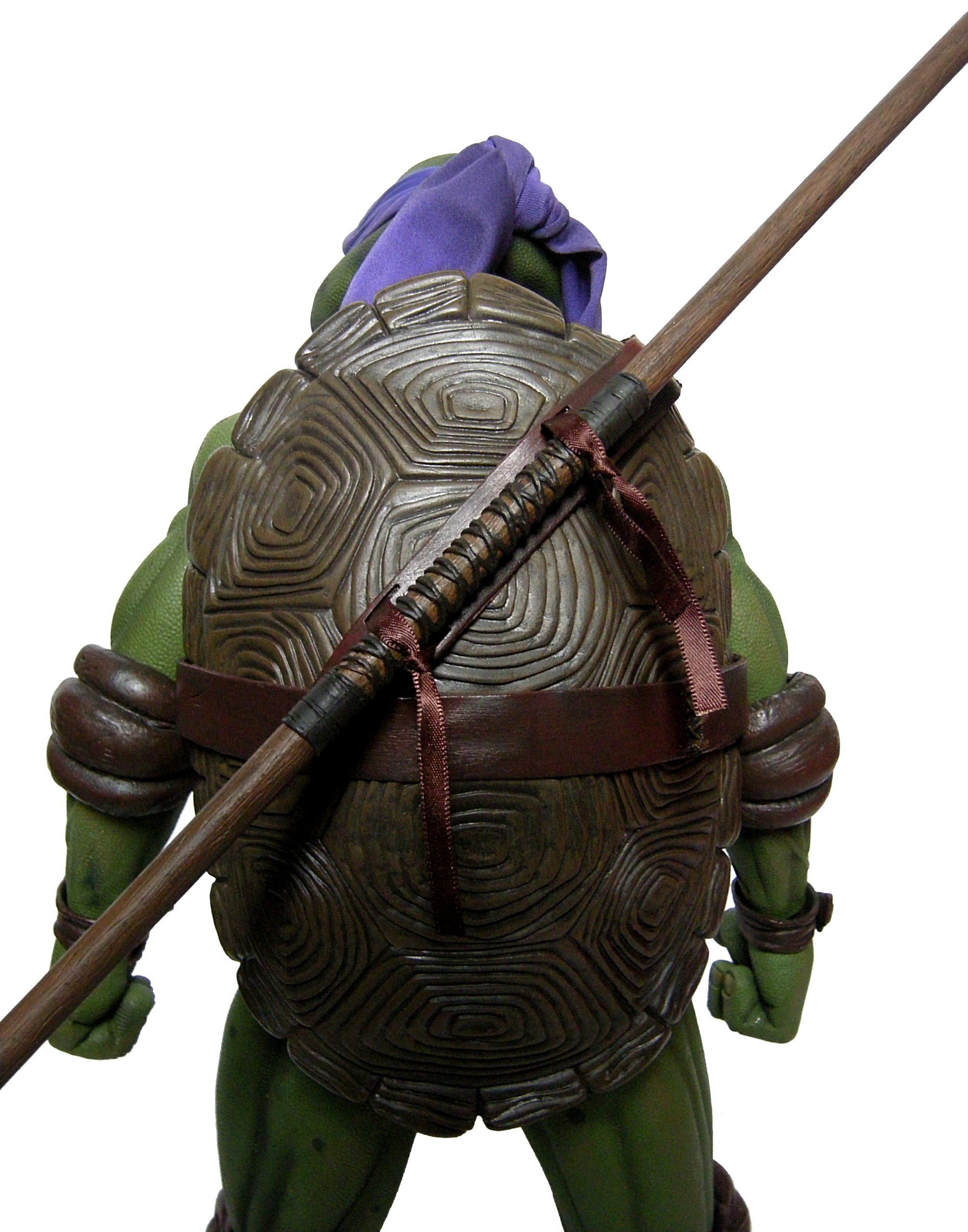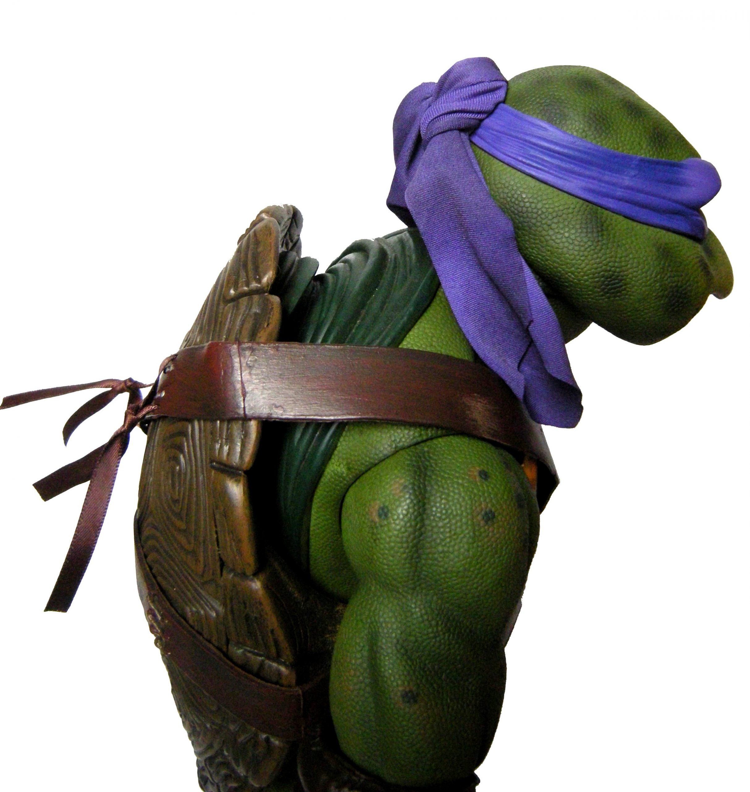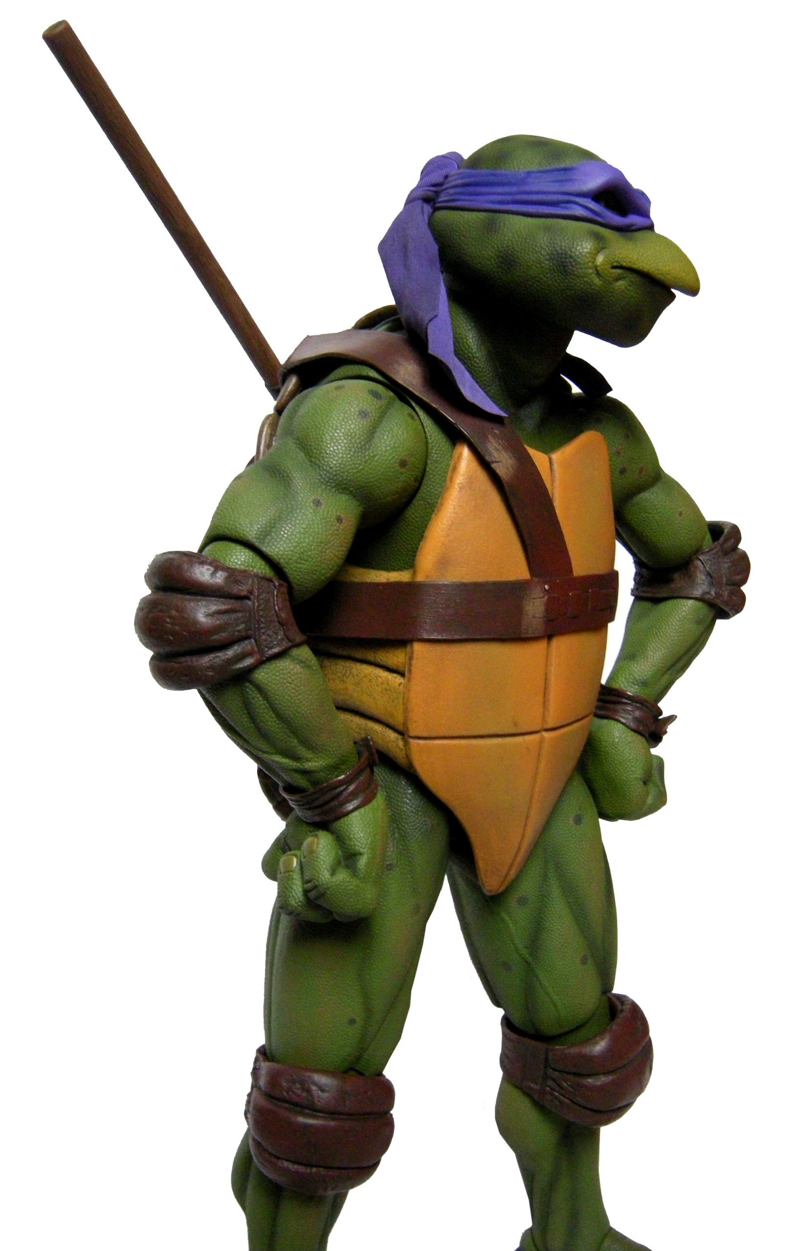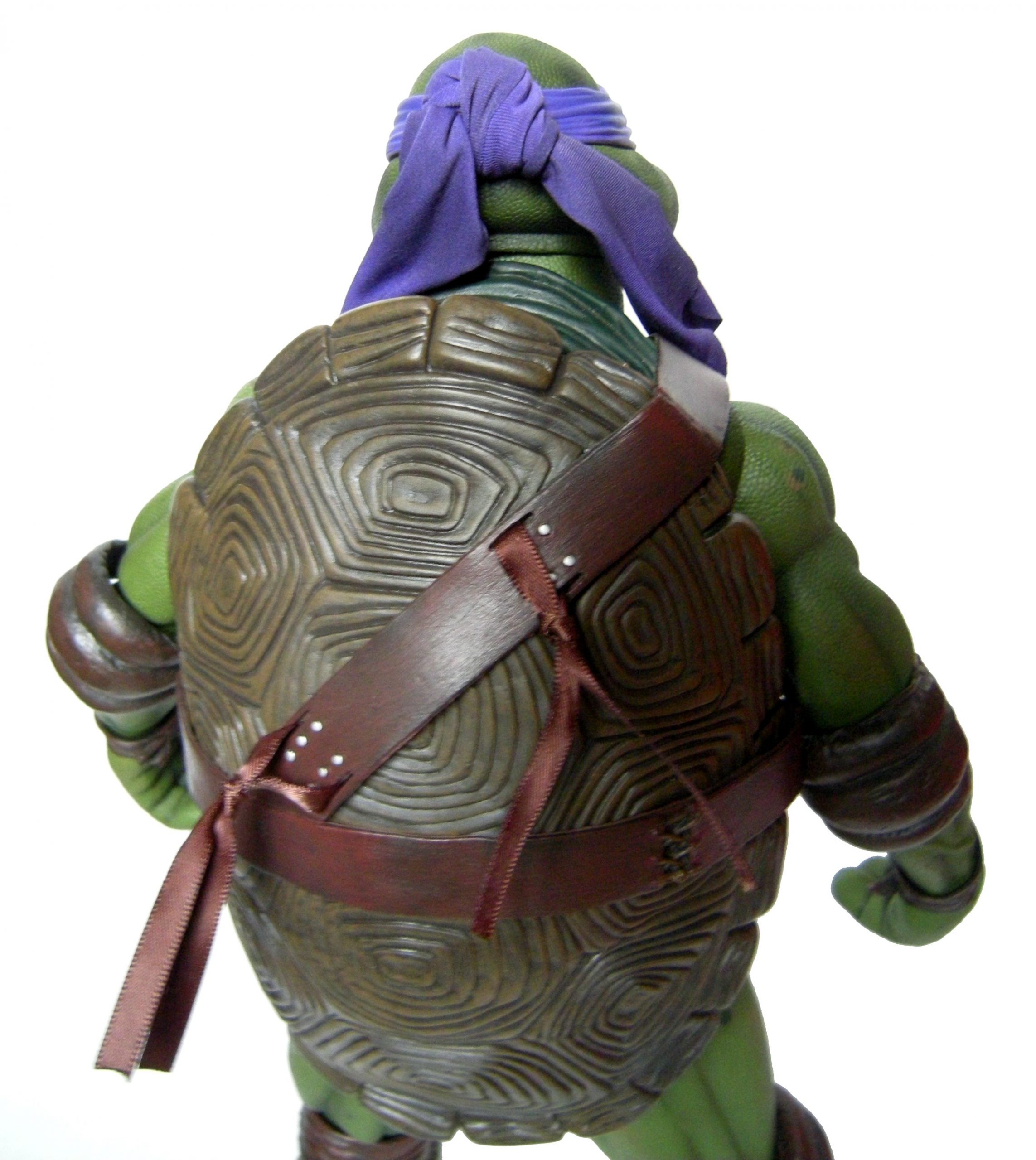La tête de Donatello est certainement la version la plus fidèle à la tortue jamais représentée jusqu’ici, même par la statuette de Prime 1 Studio. Son bec, fréquemment en avant dans le film n’est pas oublié ici. Le bandeau est moulé dans un plastique rigide collé à sa tête. Les extrémités nouées de ce bandeau sont quant à elles faites en tissu souple et rassemblé au niveau du nœud sur un pivot plastique violet. Sur le prototype original, ce bandeau était entièrement de plastique. Sur le second prototype, le tissu employé était plus rigide et épais, rappelant peut-être celui utilisé de la cape du Shredder de 1988 de Playmates Toys. Il fut remplacé par une version plus fine et qui résistera sans doute mieux au temps qu’un tissu qui risquait de s’effilocher, d’autant plus que les extrémités ont tendance à se coincer entre son dos et sa carapace si l’on ne fait pas attention.