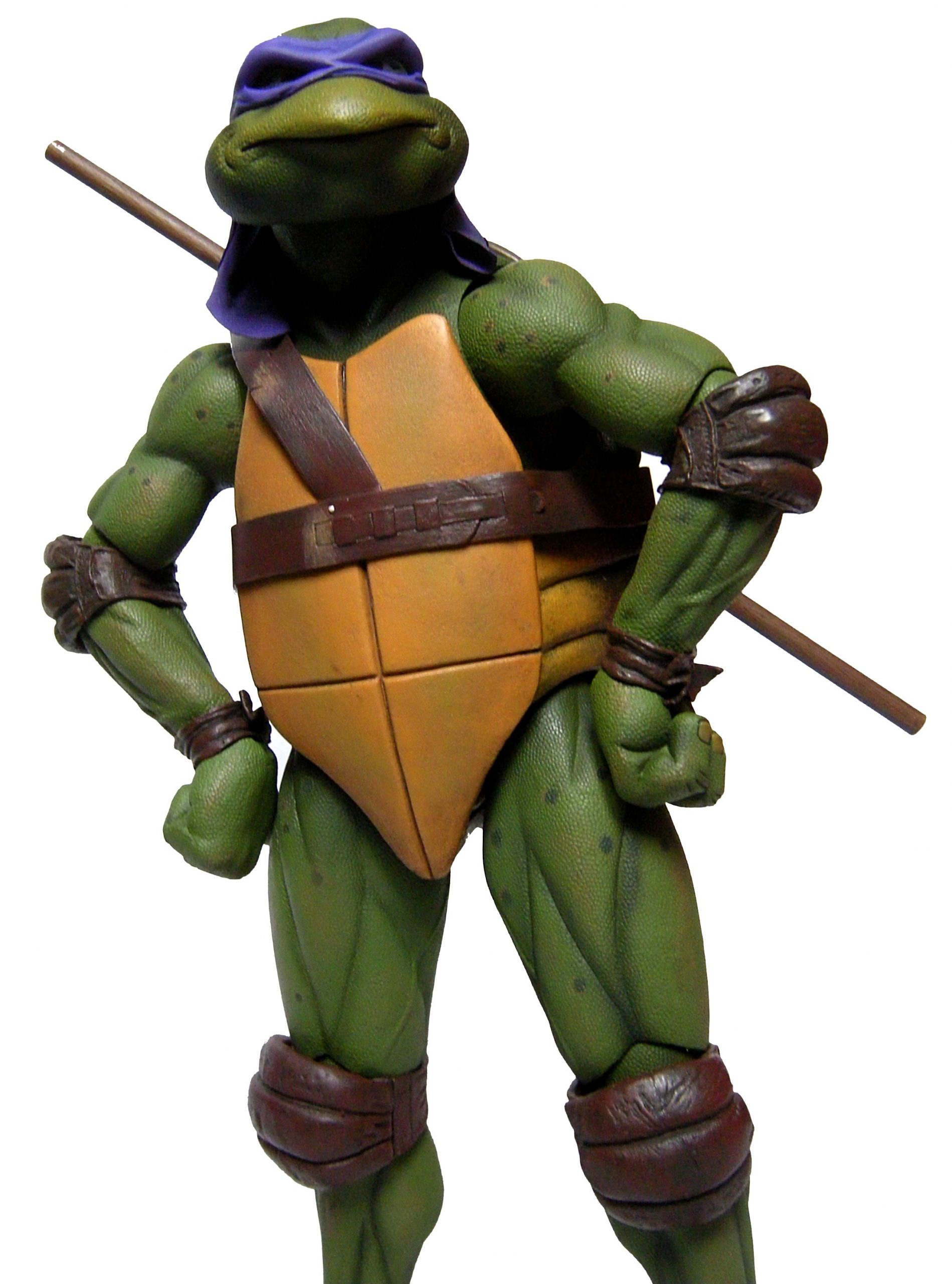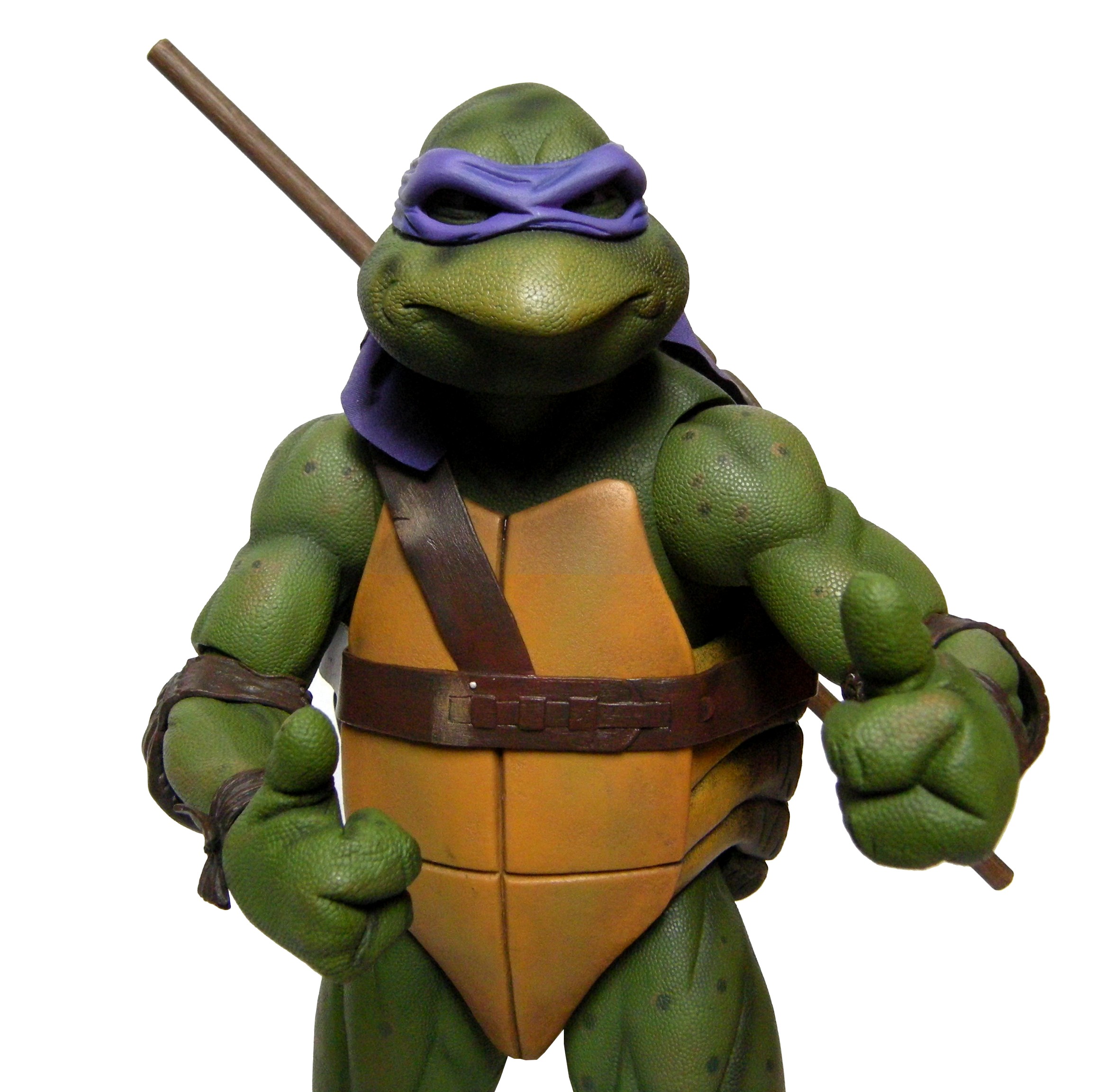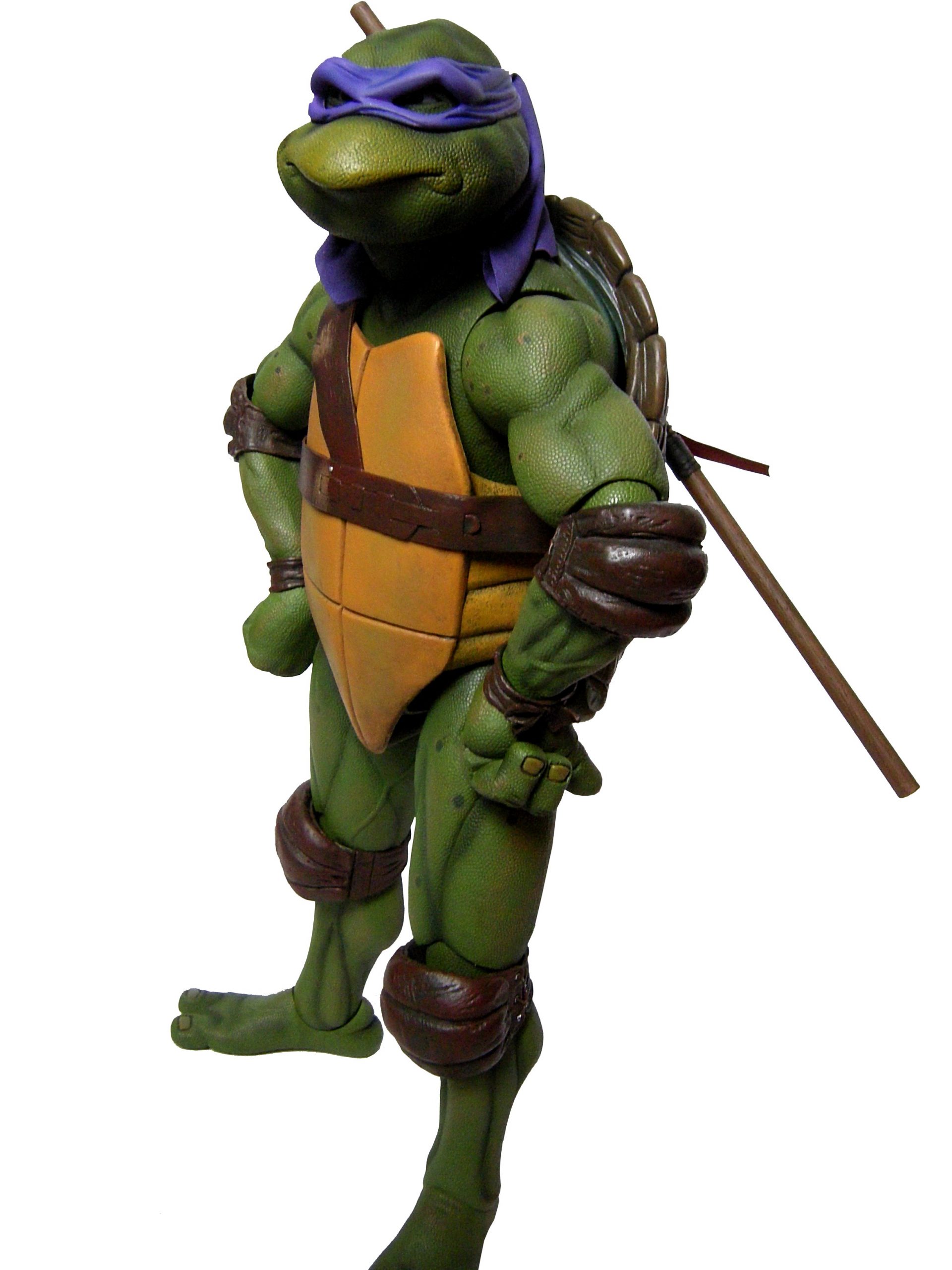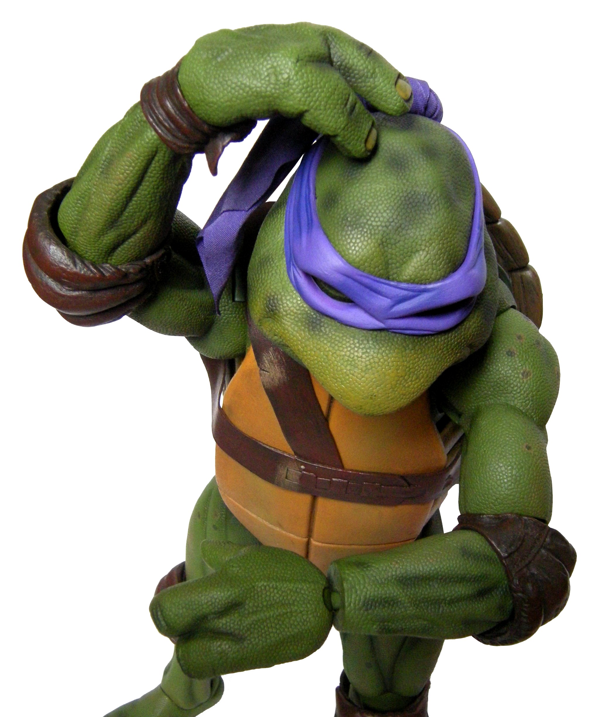 La tête de Donatello est certainement la version la plus fidèle à la tortue jamais représentée jusqu’ici, même par la statuette de Prime 1 Studio. Son bec, fréquemment en avant dans le film n’est pas oublié ici. Le bandeau est moulé dans un plastique rigide collé à sa tête. Les extrémités nouées de ce bandeau sont quant à elles faites en tissu souple et rassemblé au niveau du nœud sur un pivot plastique violet. Sur le prototype original, ce bandeau était entièrement de plastique. Sur le second prototype, le tissu employé était plus rigide et épais, rappelant peut-être celui utilisé de la cape du Shredder de 1988 de Playmates Toys. Il fut remplacé par une version plus fine et qui résistera sans doute mieux au temps qu’un tissu qui risquait de s’effilocher, d’autant plus que les extrémités ont tendance à se coincer entre son dos et sa carapace si l’on ne fait pas attention.