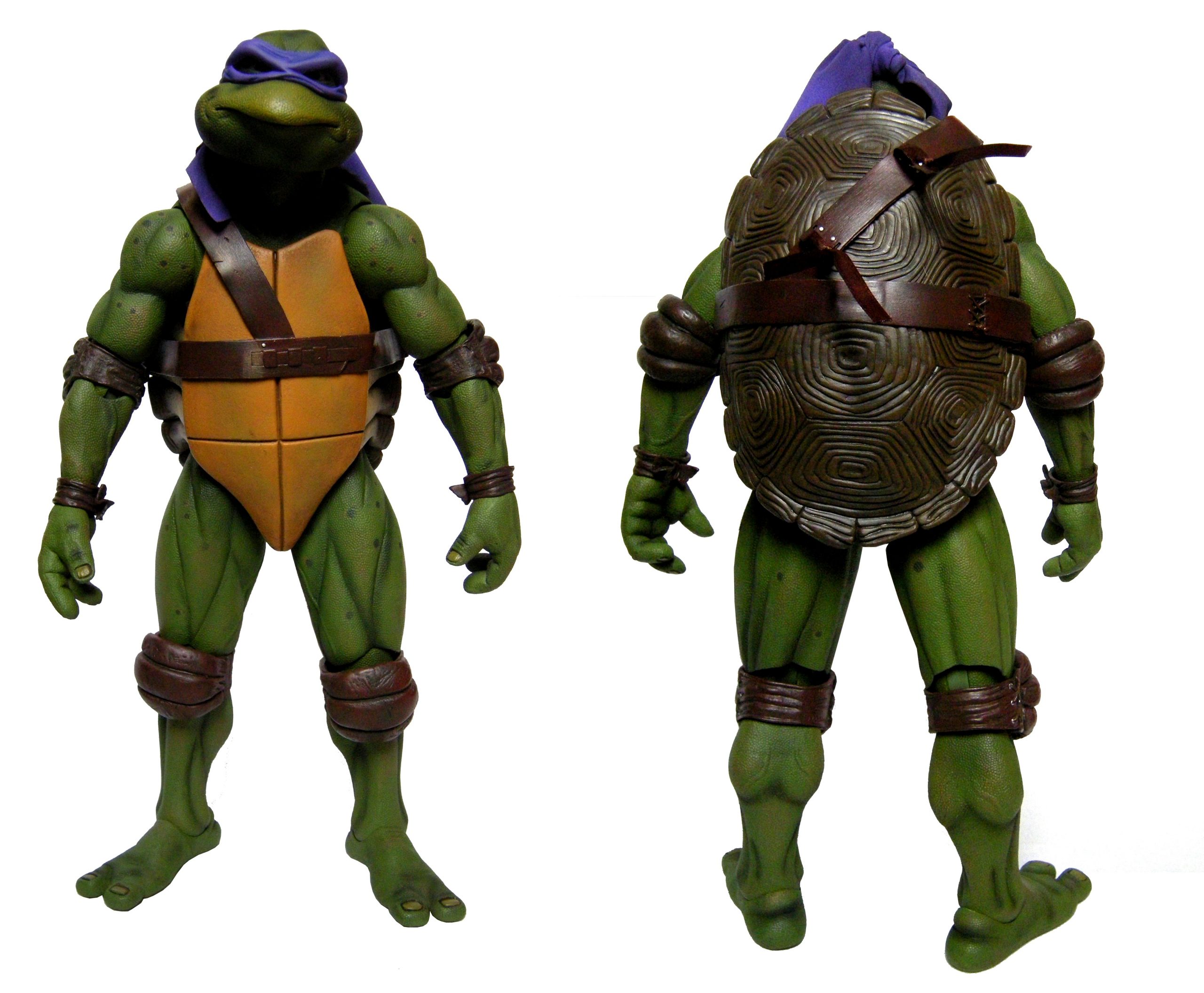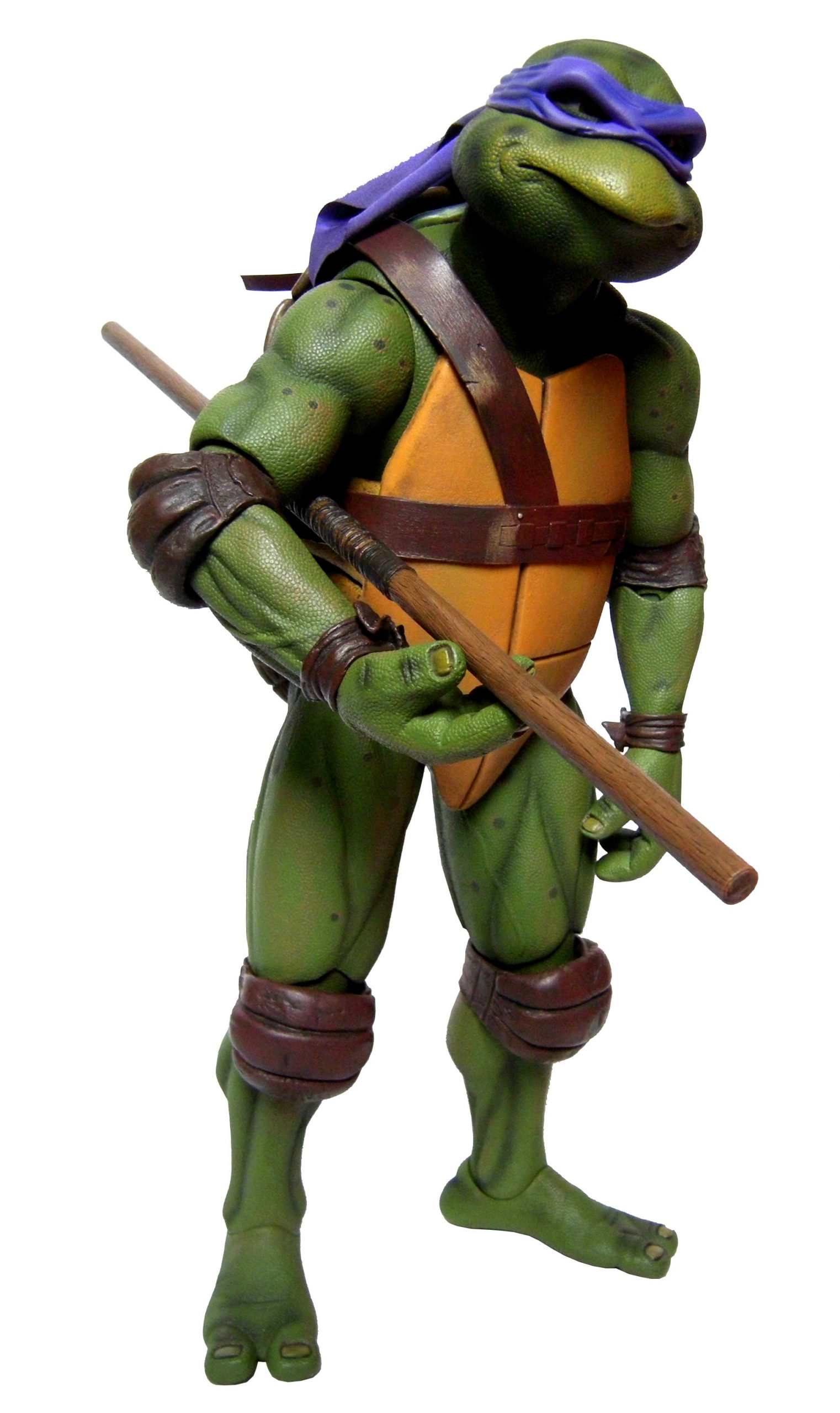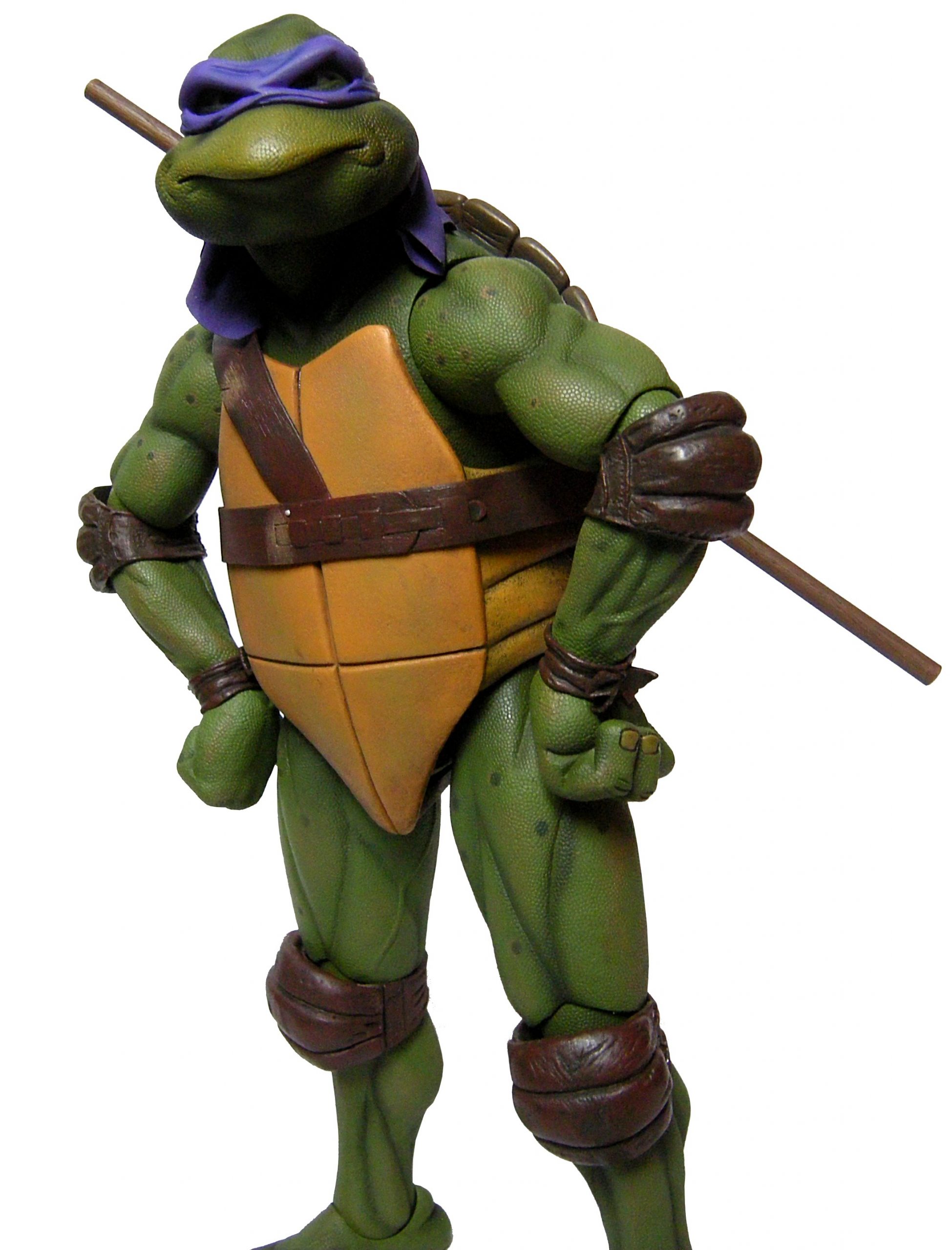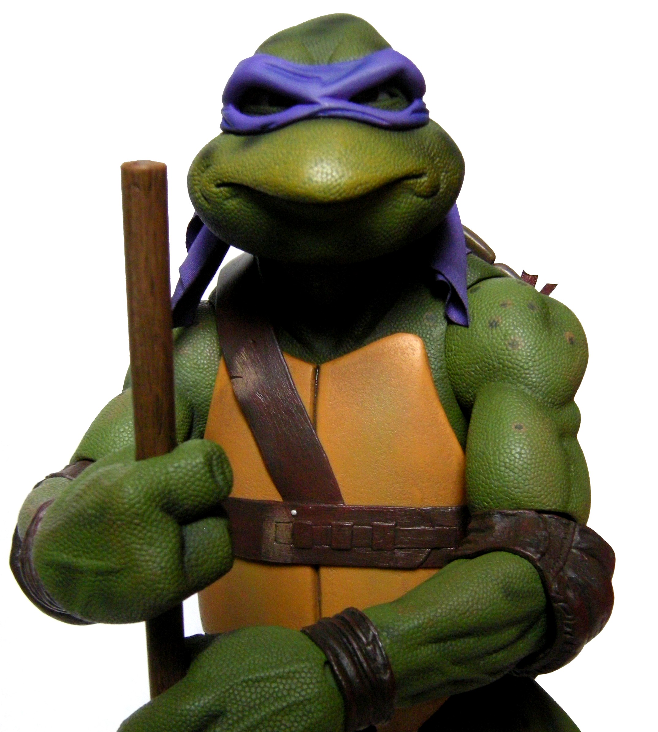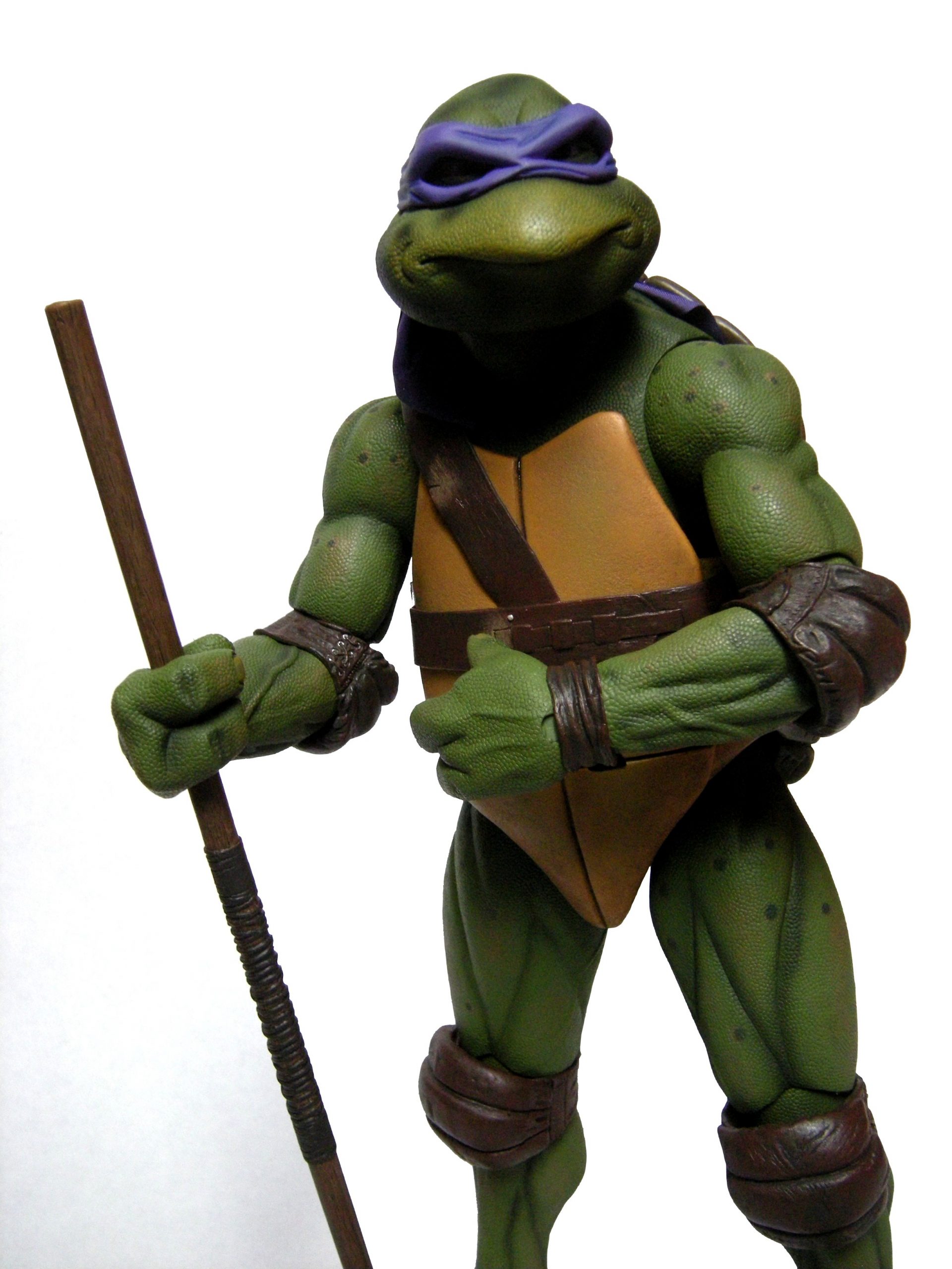 La tête de Donatello est certainement la version la plus fidèle à la tortue jamais représentée jusqu’ici, même par la statuette de Prime 1 Studio. Son bec, fréquemment en avant dans le film n’est pas oublié ici. Le bandeau est moulé dans un plastique rigide collé à sa tête. Les extrémités nouées de ce bandeau sont quant à elles faites en tissu souple et rassemblé au niveau du nœud sur un pivot plastique violet. Sur le prototype original, ce bandeau était entièrement de plastique. Sur le second prototype, le tissu employé était plus rigide et épais, rappelant peut-être celui utilisé de la cape du Shredder de 1988 de Playmates Toys. Il fut remplacé par une version plus fine et qui résistera sans doute mieux au temps qu’un tissu qui risquait de s’effilocher, d’autant plus que les extrémités ont tendance à se coincer entre son dos et sa carapace si l’on ne fait pas attention.