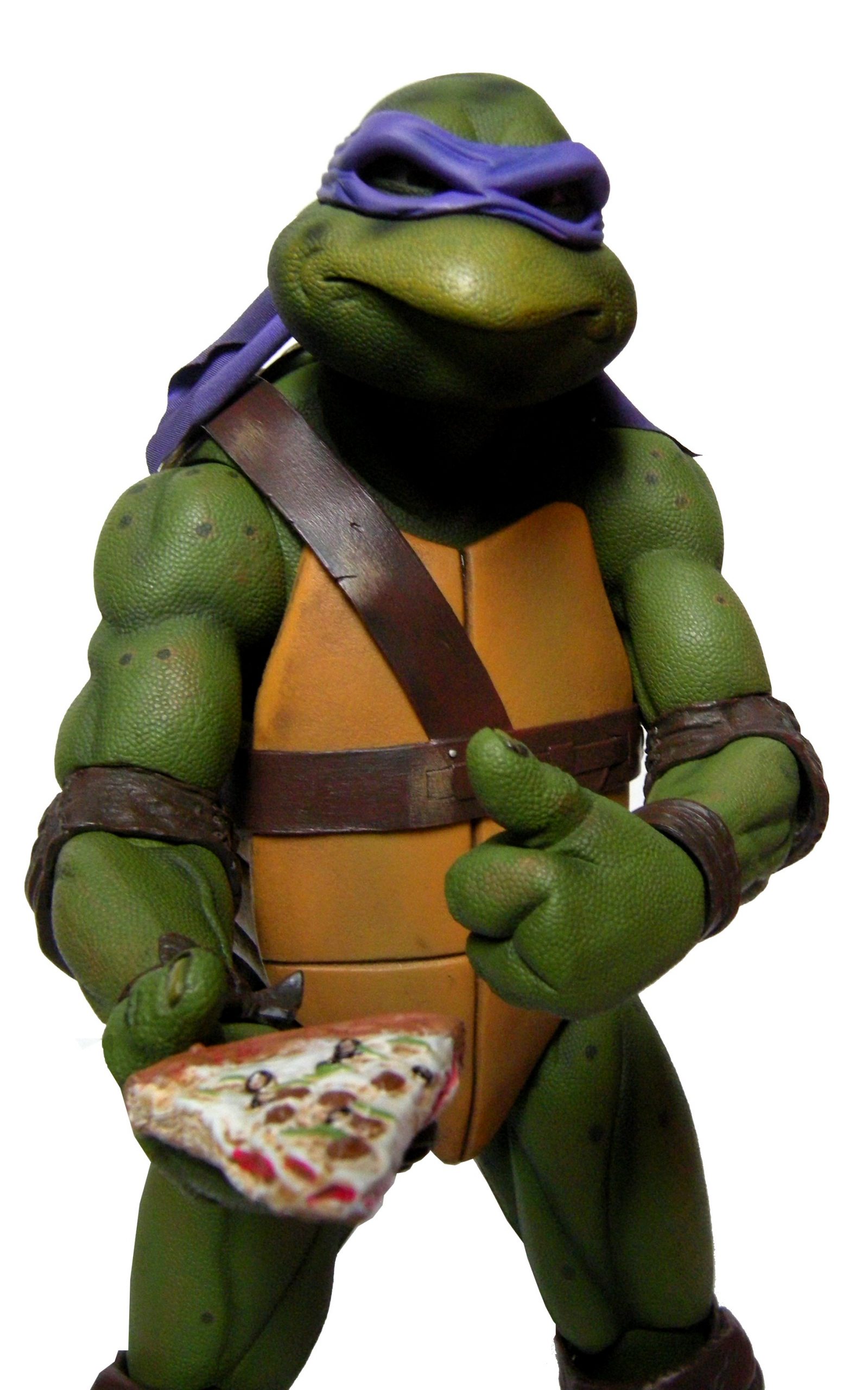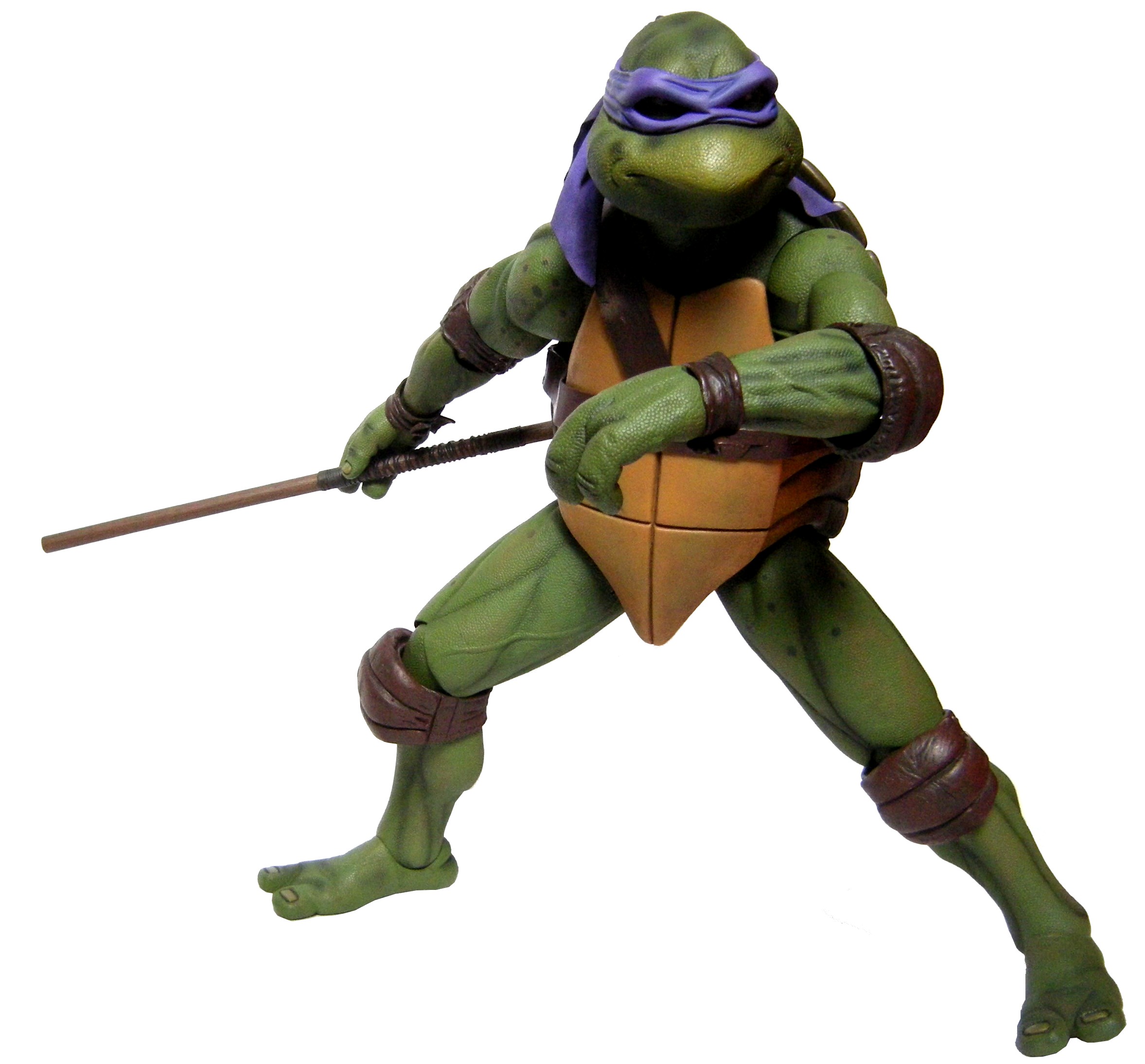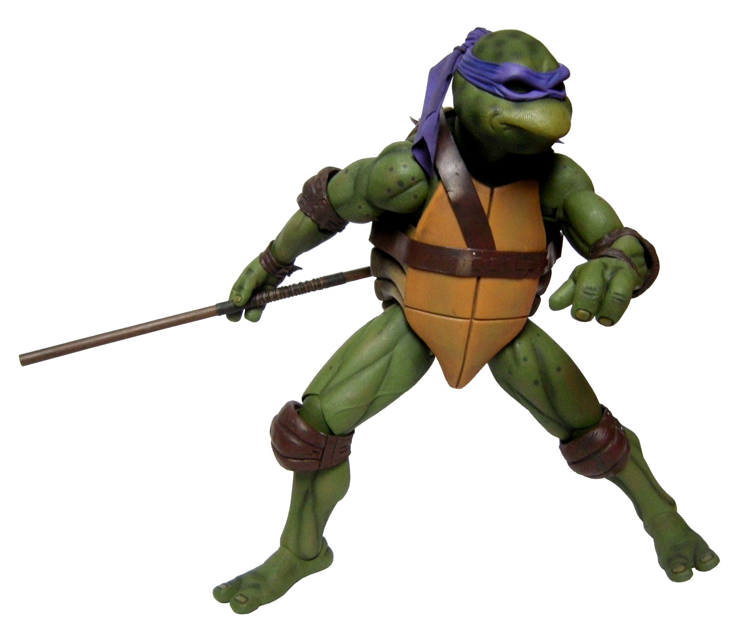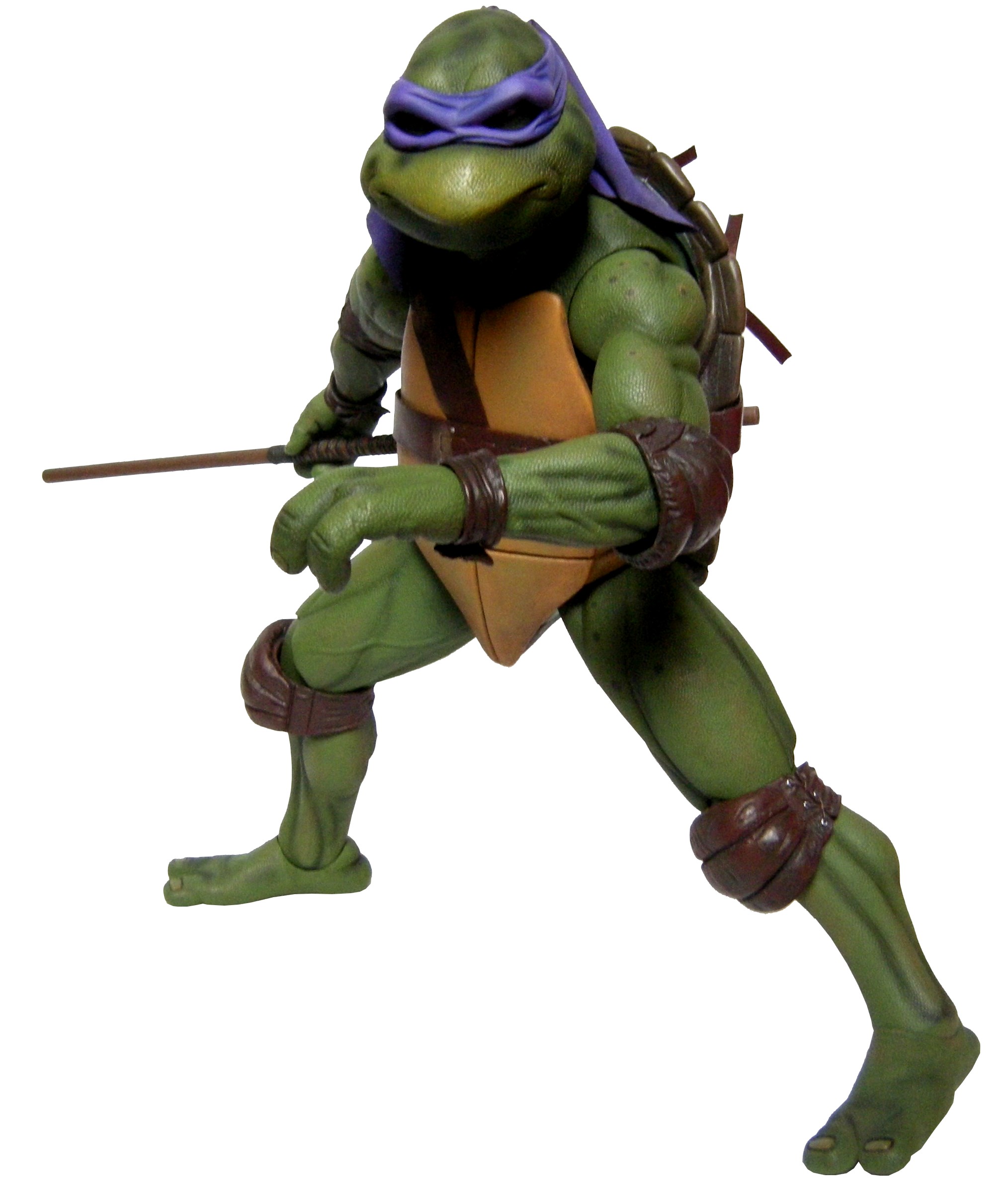La tête de Donatello est certainement la version la plus fidèle à la tortue jamais représentée jusqu’ici, même par la statuette de Prime 1 Studio. Son bec, fréquemment en avant dans le film n’est pas oublié ici. Le bandeau est moulé dans un plastique rigide collé à sa tête. Les extrémités nouées de ce bandeau sont quant à elles faites en tissu souple et rassemblé au niveau du nœud sur un pivot plastique violet. Sur le prototype original, ce bandeau était entièrement de plastique. Sur le second prototype, le tissu employé était plus rigide et épais, rappelant peut-être celui utilisé de la cape du Shredder de 1988 de Playmates Toys. Il fut remplacé par une version plus fine et qui résistera sans doute mieux au temps qu’un tissu qui risquait de s’effilocher, d’autant plus que les extrémités ont tendance à se coincer entre son dos et sa carapace si l’on ne fait pas attention.