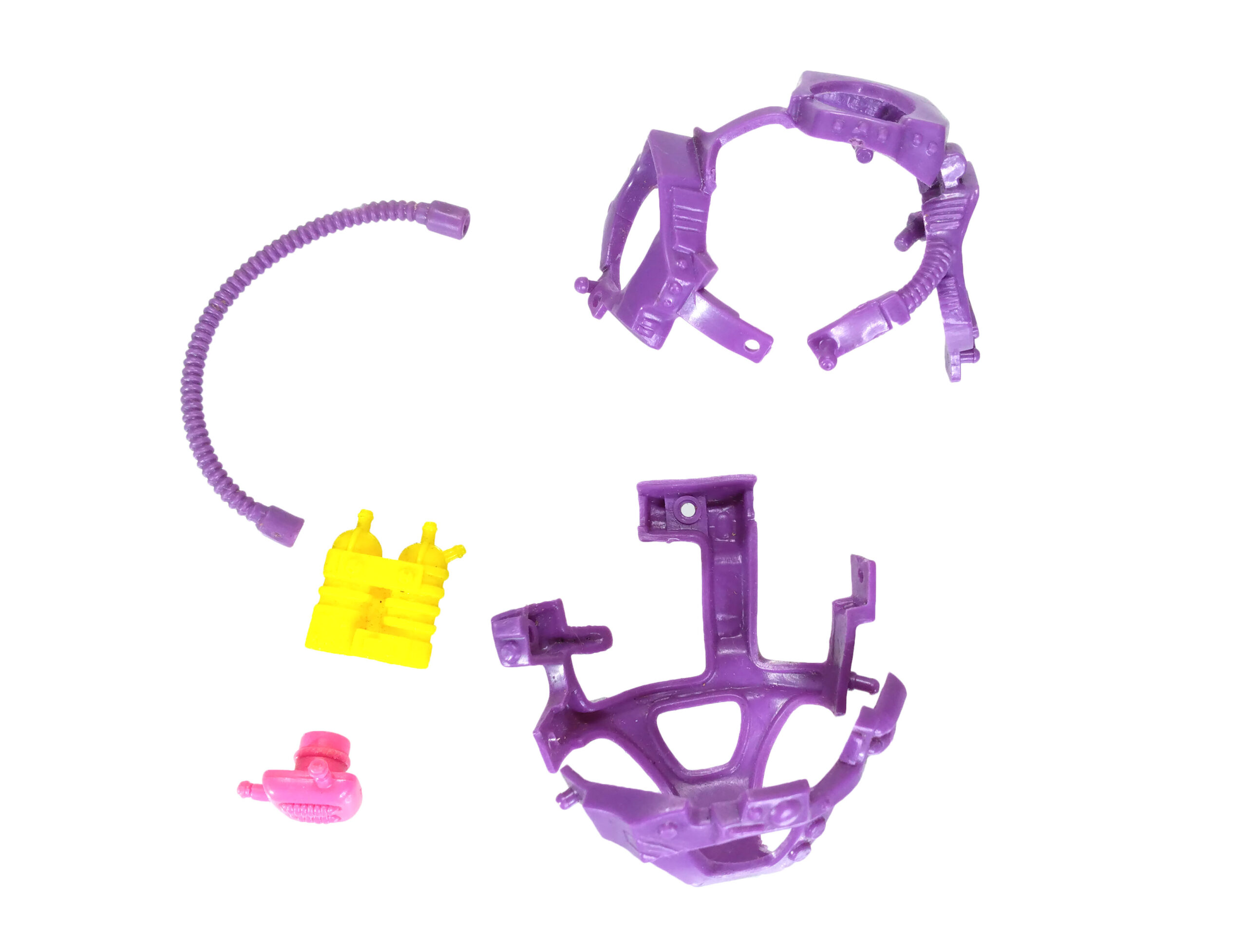 Pour ficeler tout cela, Mutagen Man possède tout un équipement qui maintient son scaphandre. Réalisé en plastique souple, à l’instar des ceintures des autres personnages, cet harnachement se compose en deux parties. La partie haute se détache grâce à des pegs sous les bras, qui eux-mêmes permettent de fixer celui du bas de la même manière.