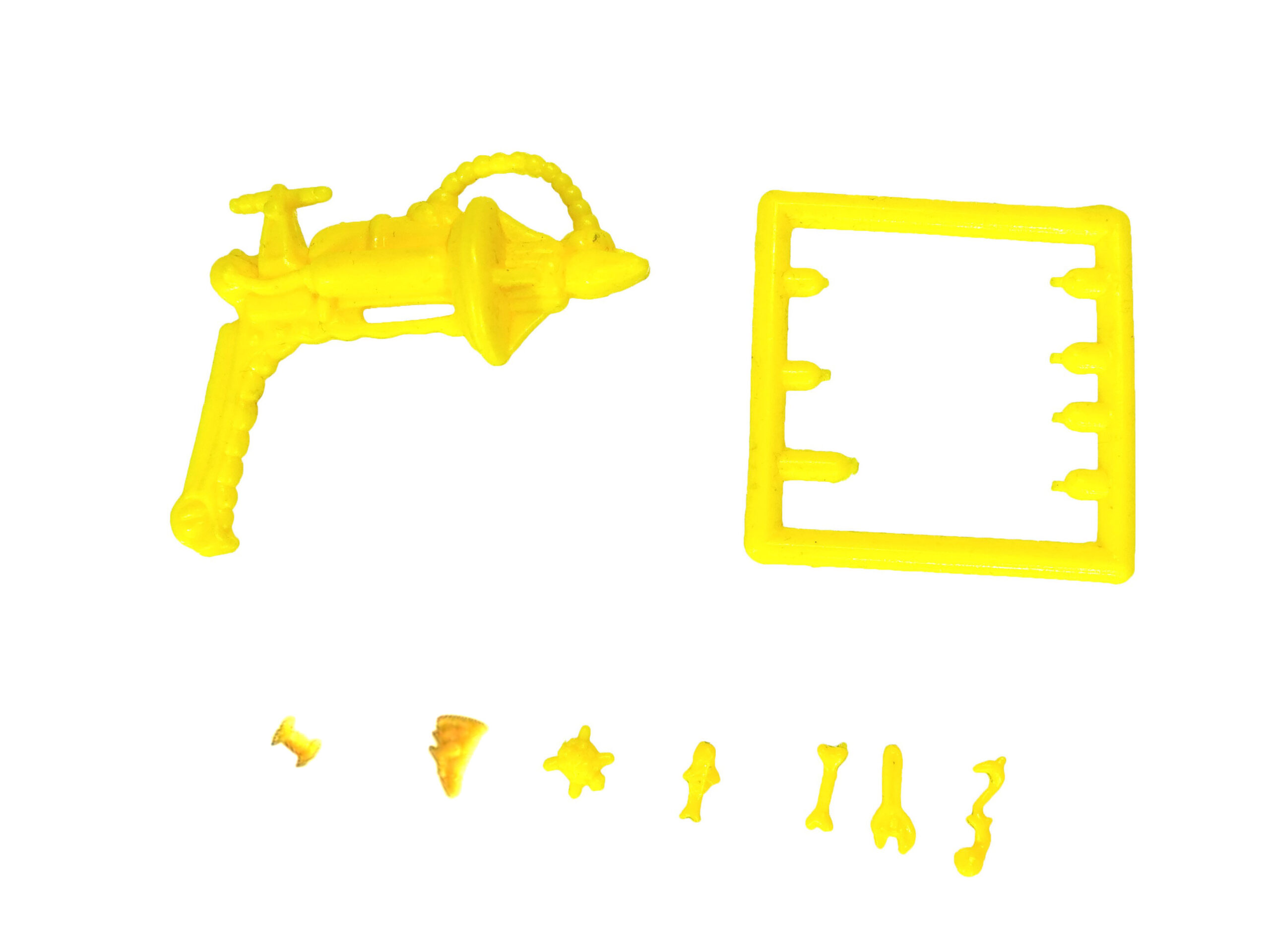 Le pistolet mutagène est très gros par rapport aux autres armes proposées généralement par Playmates. Celui-ci n’est pas raccordé au corps du personnage. Curieusement, il en existe plusieurs couleurs (jaune, rouge, argenté), mais la plus courante est le jaune.
