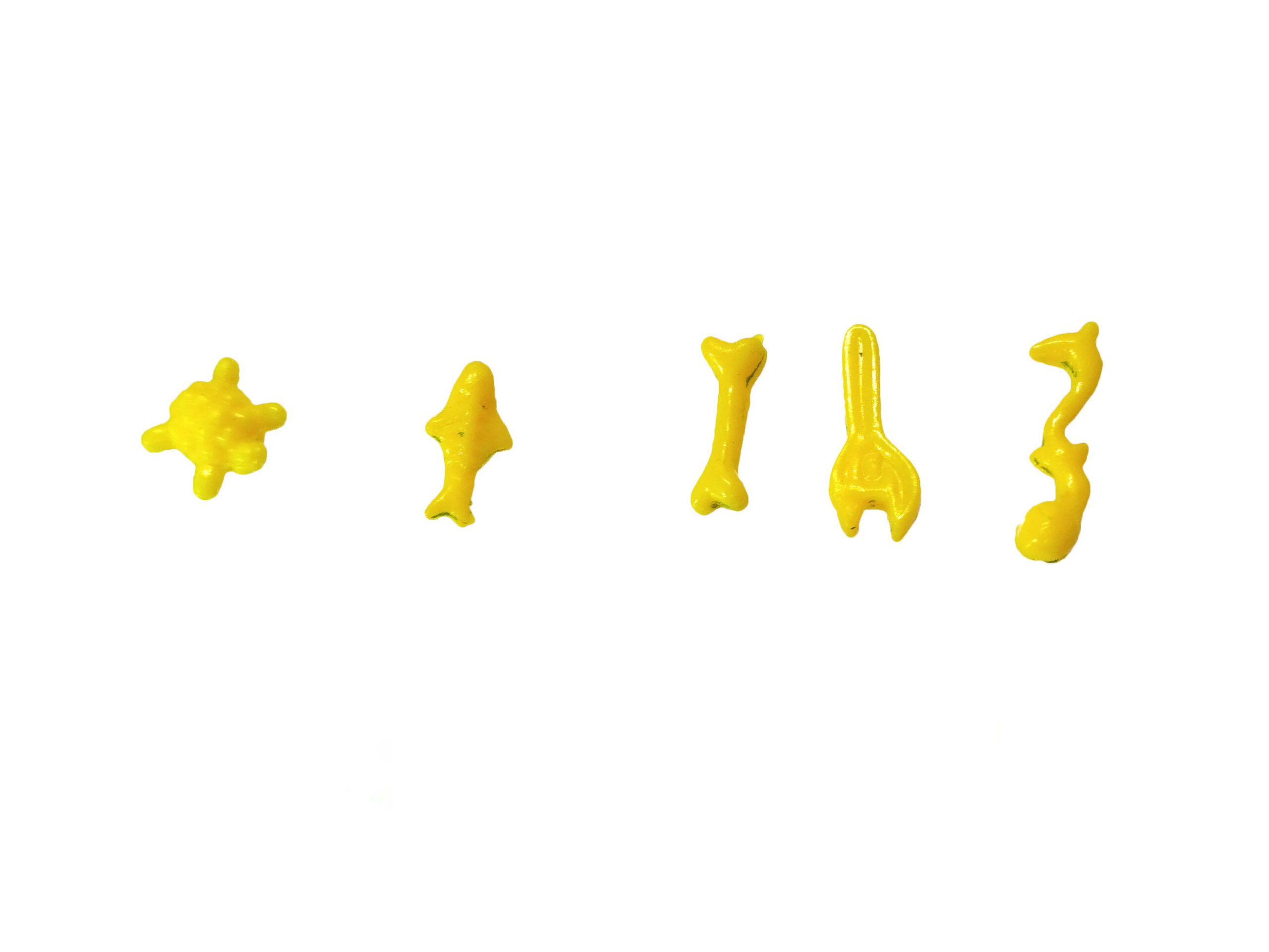 C’est la seule fois en 1990 que Playmates réitère la méthode de la grappe d’accessoires – et la dernière fois pour cette gamme. La raison est très simple, il s’agit de tout petits accessoires, à déposer à l’intérieur de Mutagen Man : part de pizza, morceau de poisson, trognon de pomme, os de poulet, anguille, clé. Ces petits accessoires sont destinés à flotter dans le ventre du mutant peu ragoutant. Dans les rééditions des années 2000, ces accessoires sont déjà prédécoupés.