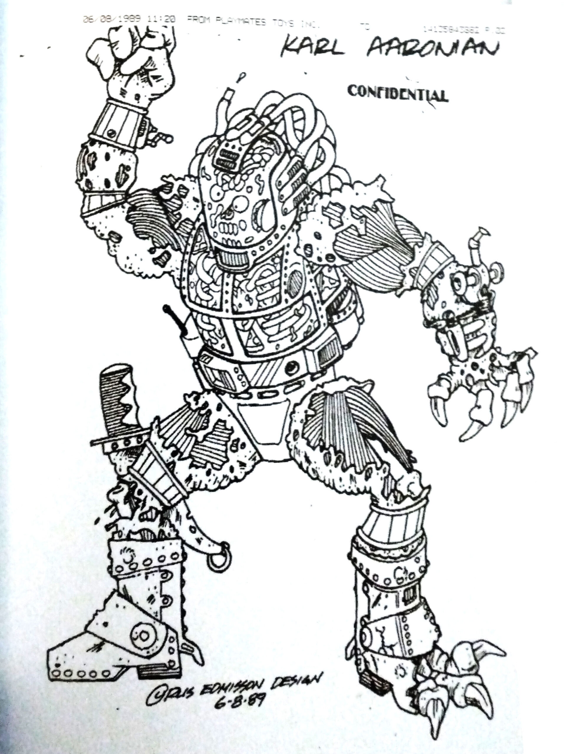 En juin 1989, le projet a suffisamment évolué pour obtenir l’aval de Playmates Toys. Mutagen Man, toujours sous le nom de The Unkown, est redessiné par l’artiste Rus Edmisson. Le personnage commence alors à ressembler à sa version finale, laissant totalement de côté sa part animale en faveur de celle d’un monstre en putréfaction (Fig. 3). Dans le livre Rad Plastic se trouve un échange de fax très intéressant entre Mirage et Karl Aaronian, en charge de la production des figurines. Ce dernier revient sur certains points approuvés du monstre, d’autres à corriger. Mais se trouve là surtout une volonté d’édulcorer le personnage en vue de l’adapter éventuellement pour le dessin animé.