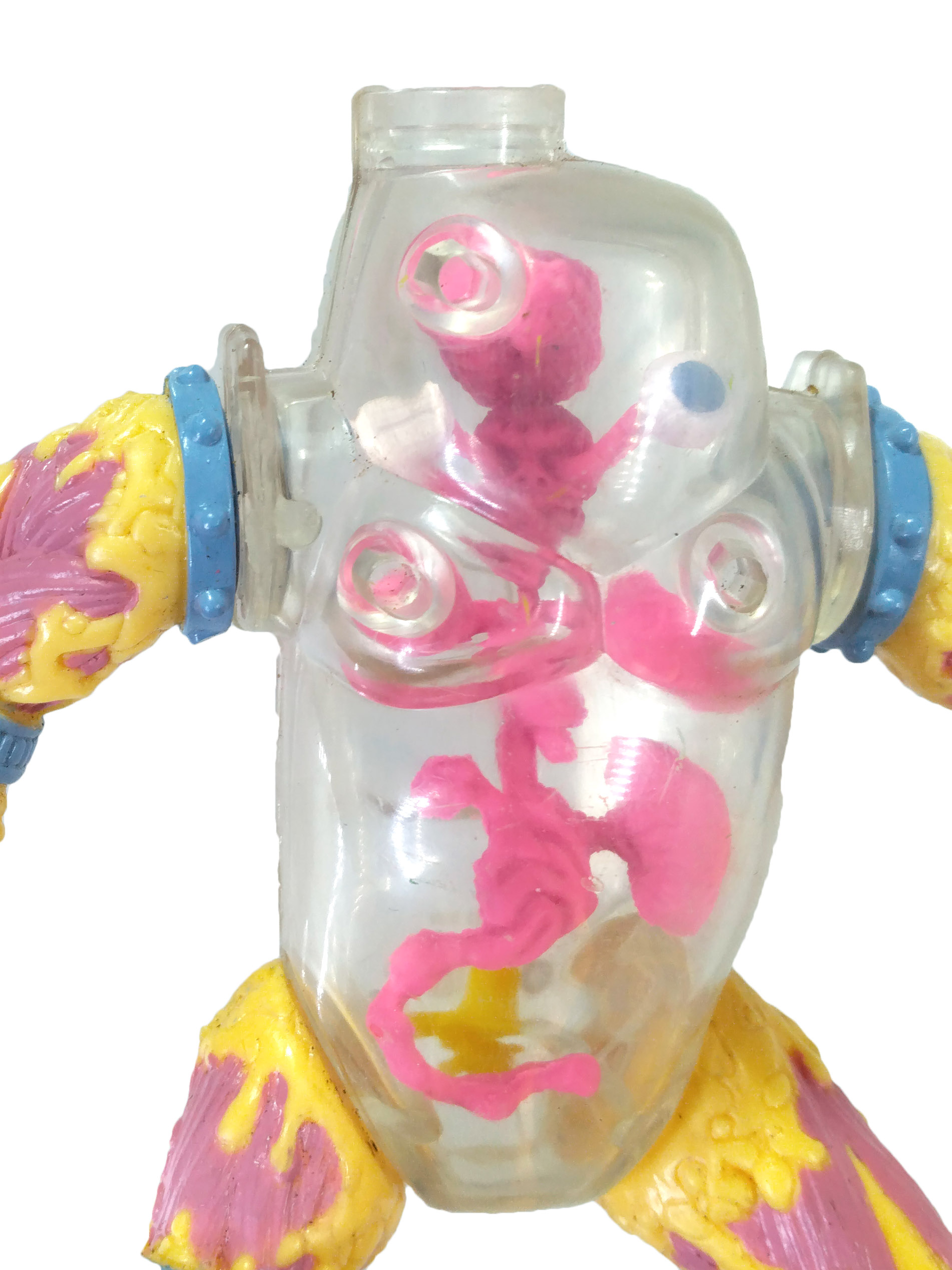 figurine de Mutagen Man est très singulière et se distingue largement des autres personnages de la gamme par son concept. Nous retrouvons un personnage composé d’un bocal de plastique transparent, dans lequel se trouvent des organes formés par une seule pièce sinueuse, maintenue contre les parois.