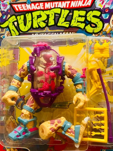 Mutagen Man est sorti lors de la cinquième wave de figurines Tortues Ninja, à l’automne 1990. Au dos, ce sont 37 personnages qui sont représentés, dont la totalité des Wacky action, les nouveaux Napoleon Bonafrog, Panda Khan et Ray Fillet, qui verra le jour un petit peu plus tard.