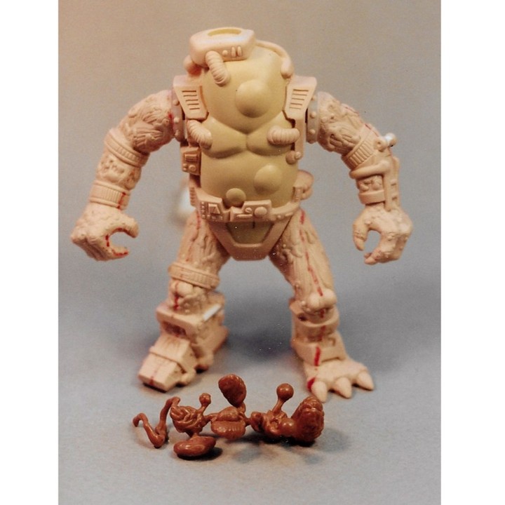 Le prototype a été sculpté par Scott Hensey (corps du personnage) et David Arshawsky (tripes). Il présente quelques détails qui n’ont pas été conservés dans la version finale (Fig. 4). Le personnage est très similaire à la figurine définitive, hormis des petites lentilles situées sur la poitrine afin de grossir certains organes comme les yeux ou l’estomac de Mutagen Man. Ce détail a été supprimé extrêmement tard dans la production. En effet, Mutagen Man disposait encore de ces verres grossissants à travers le modèle utilisé pour la publicité de la figurine (voir vidéo en fin de dossier) ! Si d’ordinaire un modèle hard copy est utilisé pour les promotions, avec un plastique spécial, celui de cette publicité est légèrement différent. Avec l’inclusion du bocal transparent, il s’agit plus probablement d’un mélange entre hard copy (membres) et plastique basique (bocal).