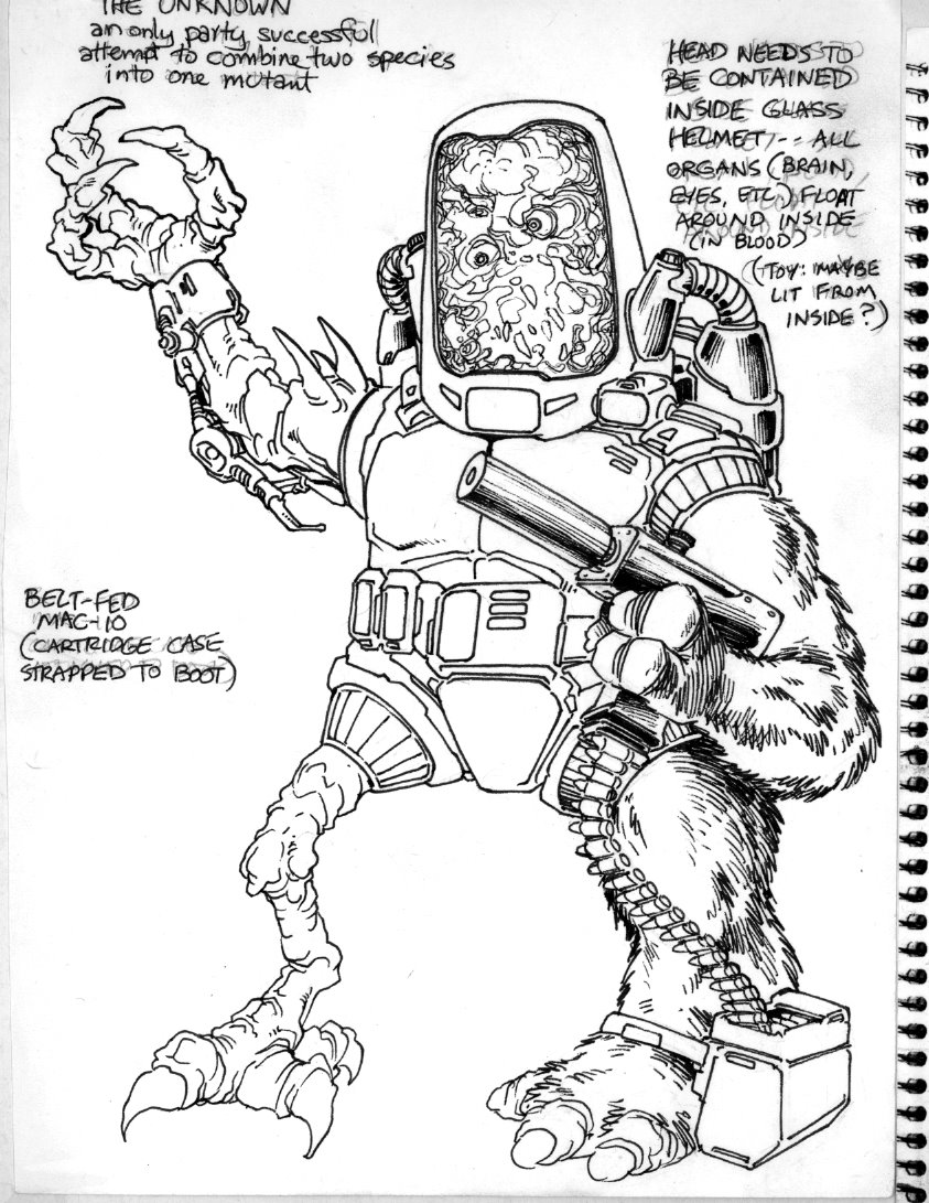 Le personnage de Mutagen Man a beaucoup évolué avant de devenir la figurine que nous connaissons. Né d’une idée de Peter Laird au premier semestre 1989, le cocréateur des Tortues Ninja l’imaginait comme une bête hybride entre un animal et un humain (Fig. 1). Comme il l’explique sur son blog, cette expérience de croisement n’aurait que partiellement fonctionné, contraignant les organes de cette créatures à être conservés dans un bocal. Laird aimait particulièrement l’idée d’avoir un mutant avec ses organes visibles et des déchets flottants autour.