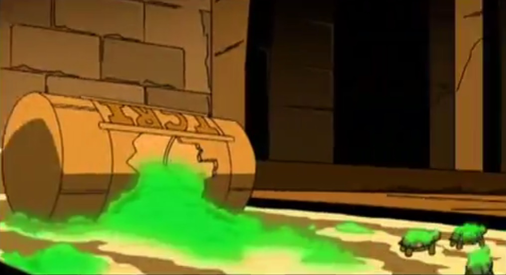 Au XXe siècle, les Utroms se sont établis à New York, dans la tour T.C.R.I., où ils mènent secrètement des expériences pour parvenir à leurs fins. Il résulte de leurs expériences ce mutagène. Voulant un jour s’en débarrasser, ils le stockent dans un camion qui évite un passant dans la ville. La porte arrière s’ouvre, et le mutagène tombe dans les égouts, en même temps que le bocal de quatre tortues. Contrairement aux autres dessin-animés, seuls Splinter, les quatre tortues et Leatherhead sont touchés par ce produit au cours de la série principale. Le mutagène n’est pas à confondre avec ce qu’utilisent les Foot pour créer des monstres et habiter les souterrains.