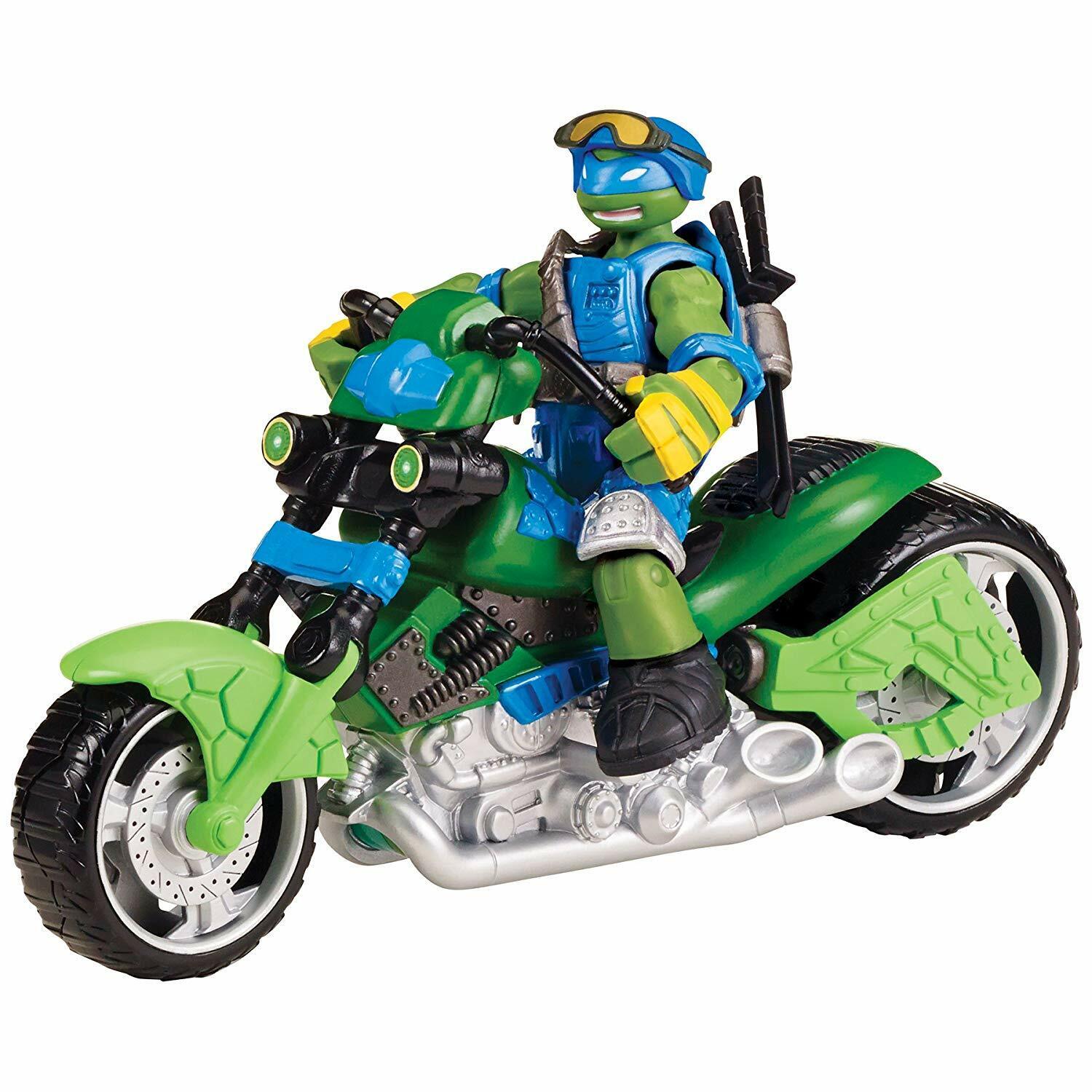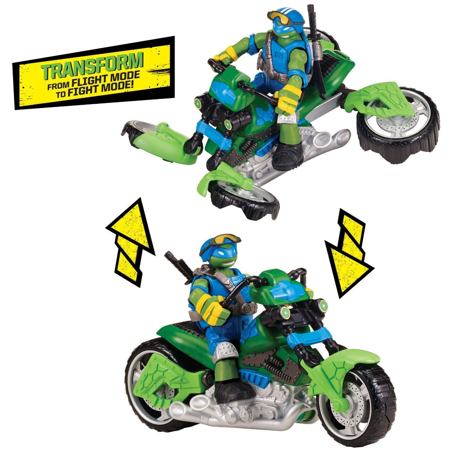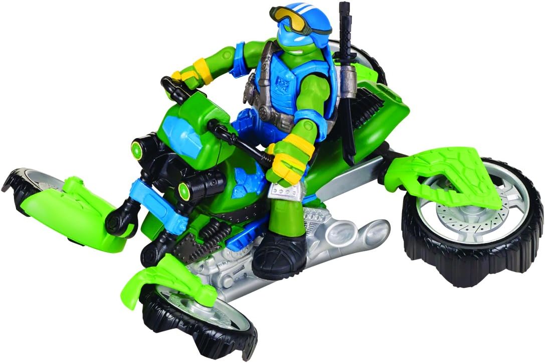 Du côté des véhicules, deux sont sortis, celui-ci et le Tri-flyer avec Raphael. Le principe très simple est d’offrir à l’enfant un véhicule à la transformation basique, avec la possibilité d’écarter les roues pour passer d’un mode moto à celui d’un drone. La figurine de Leonardo est exclusive à ce pack, et reprend la sculpture du Stealth tech Donatello sorti en 2013. Le rangement des sabres se fait bien par le fourreau du bâton dans le dos !