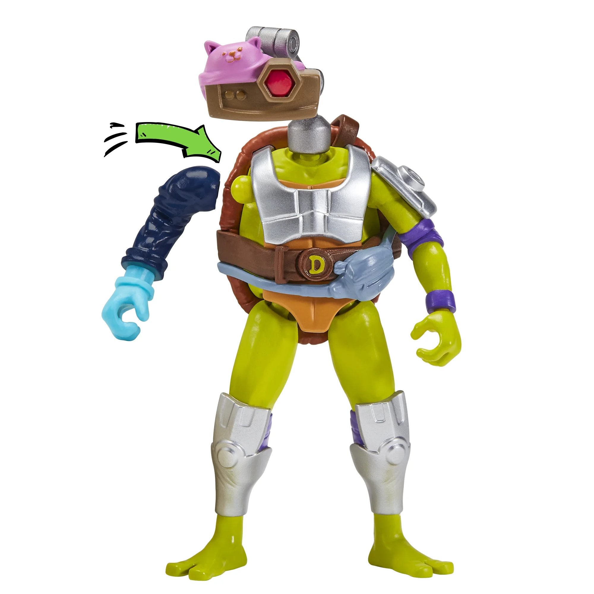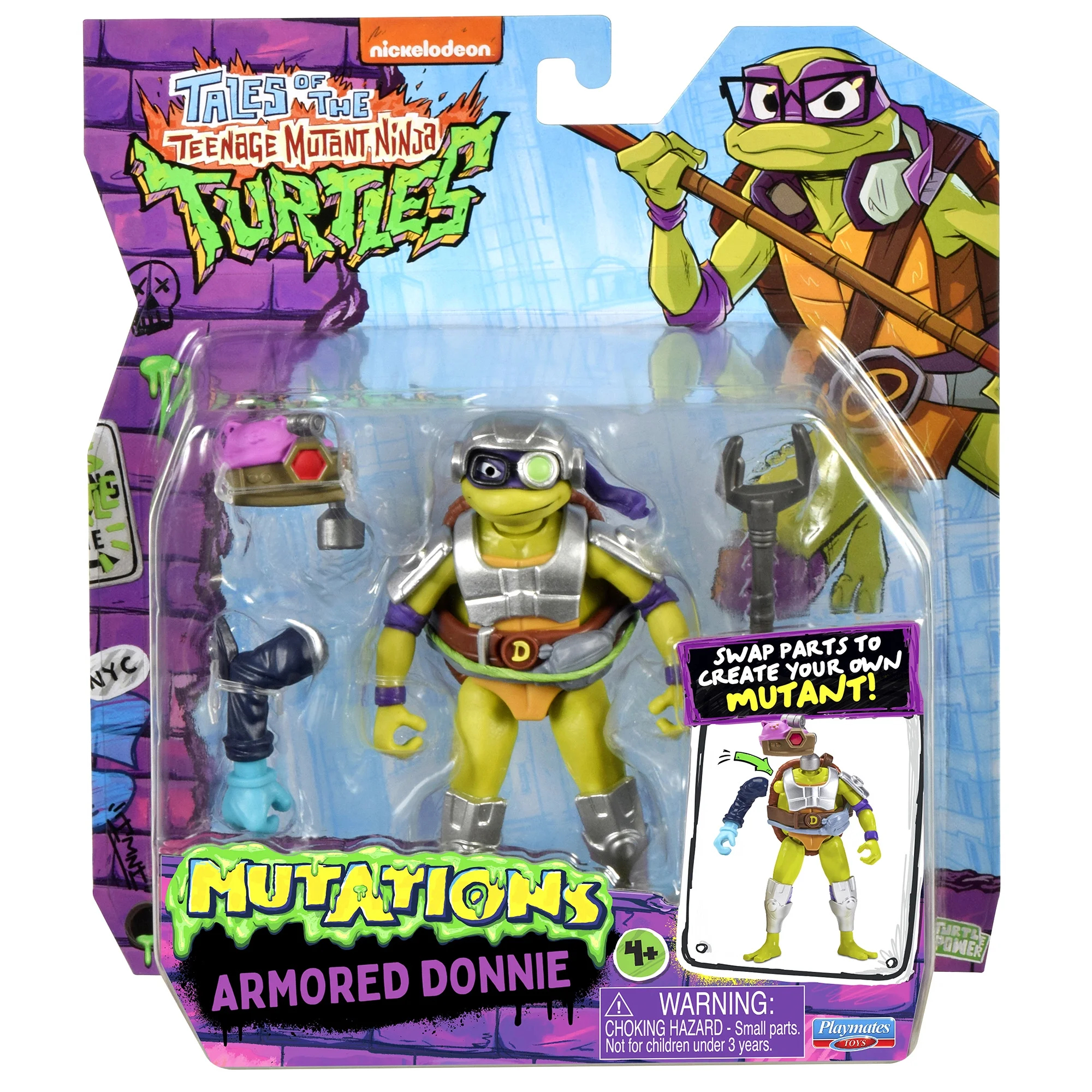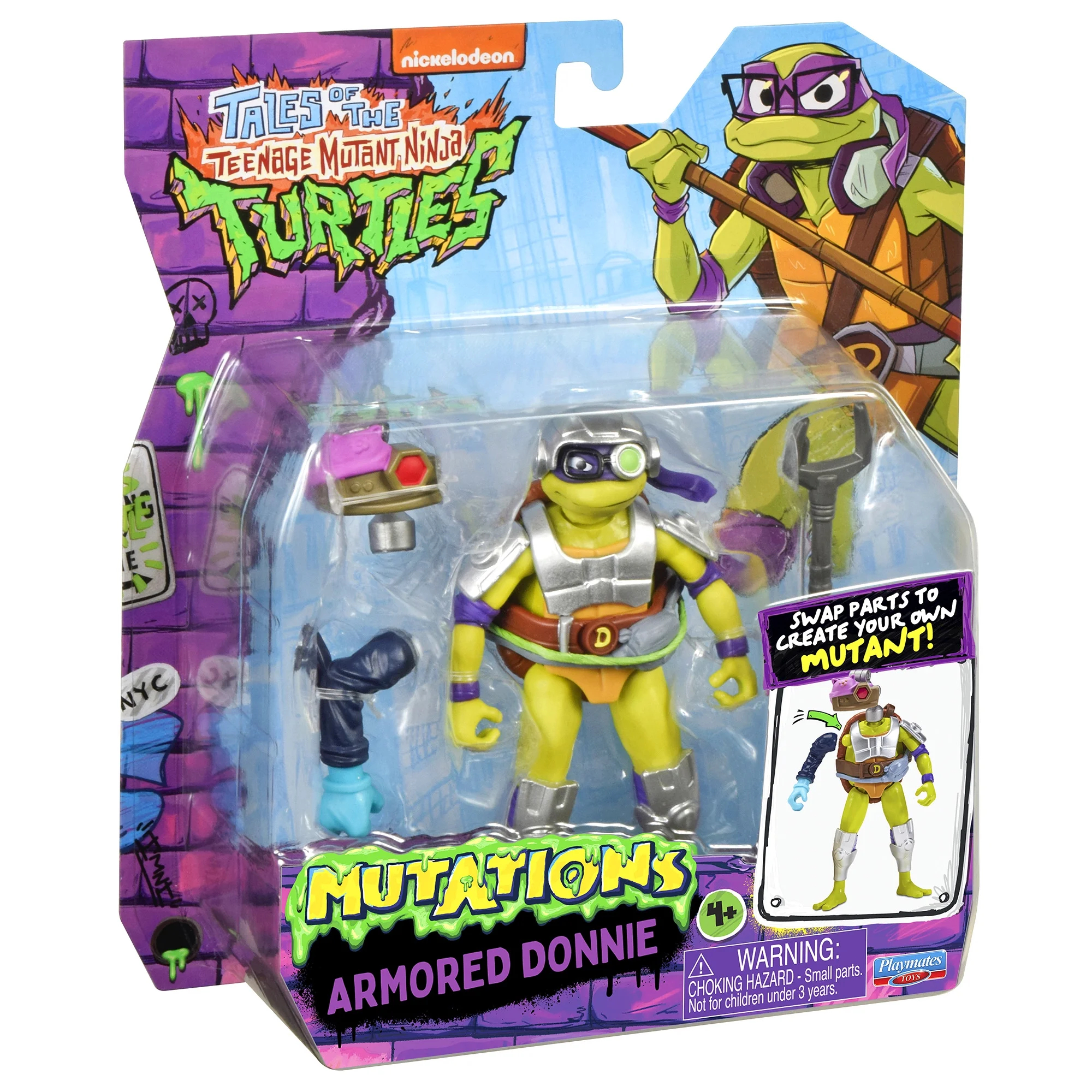 Détail particulier, Playmates Toys a édité dès le début de la production deux types de blisters pour les trois autres tortues. L’un mentionne la figurine dans la série Mix N’ Match, l’autre non. Donatello n’a jamais eu la mention Mix N’ Match sur aucun de ses blisters.
