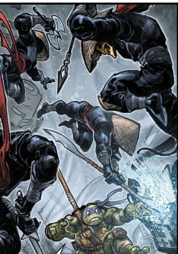 Particulièrement expérimentés, ces ninjas étaient ceux qui opposaient le plus de résistance aux tortues. Donatello était le plus préoccupé par cela, n’ayant pas développé les capacités suffisantes au combat pour en venir à bout. C’est ce qui l’amena à vouloir être formé par Batman, à la fois fin détective et guerrier redoutable. Cela permit à Bane d’arriver à New York pour conquérir la ville (Batman / TMNT II, part. 1). Bien décidé à les vaincre et mettre un terme aux agissements du colosse, Donatello alla jusqu’à s’injecter du Venom pour devenir comme lui. Cela lui permit de vaincre enfin les ninjas Foot d’élite (Batman / TMNT II, part. 4).