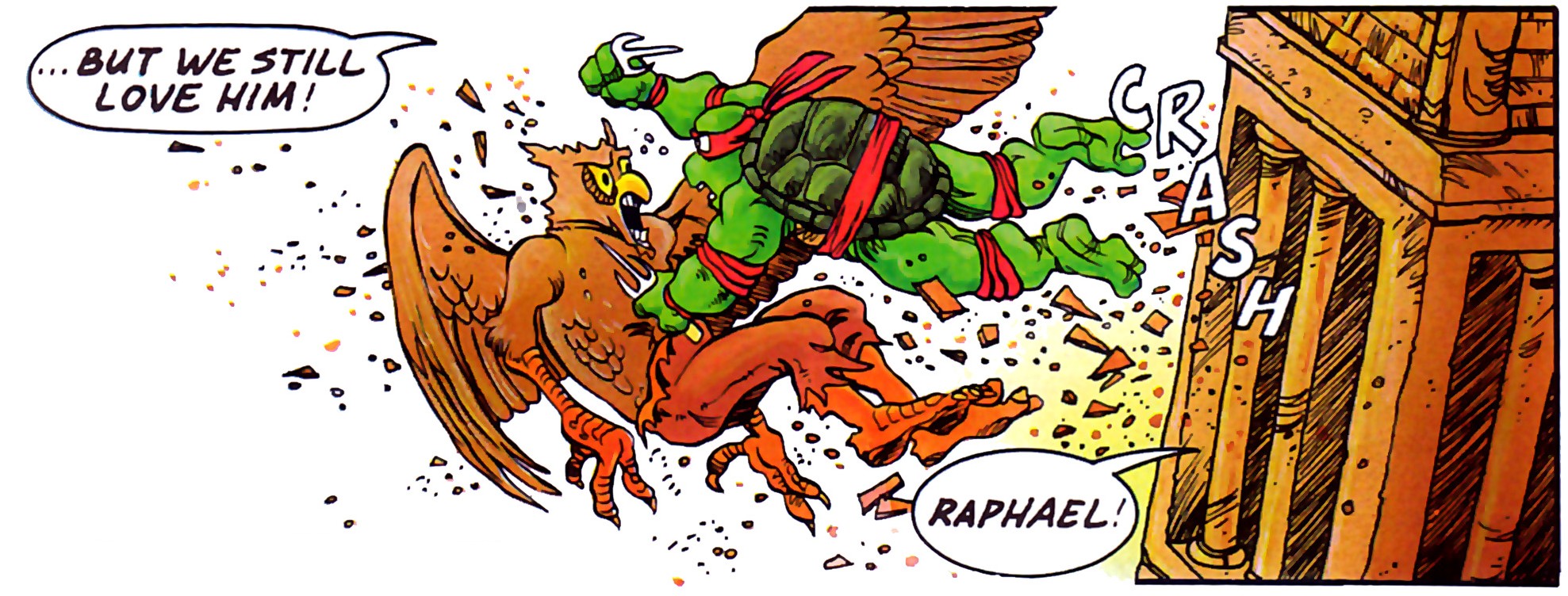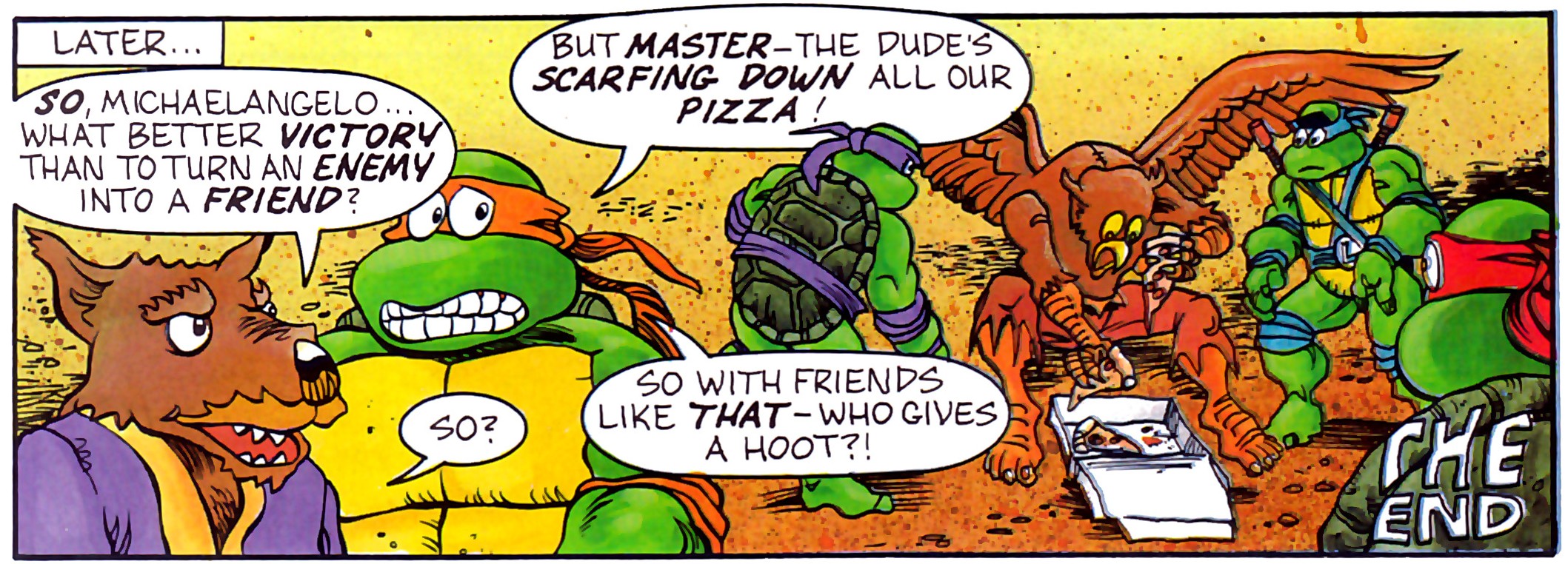 Un soir, il captura Splinter, ravi d’avoir un gros rat à dévorer. Les tortues, qui attendaient leur maître pour un repas de minuit dans les rues, s’inquiétèrent et le retrouvèrent ligoté à une cloche. Dans le combat contre Nocturno, Raphael le poussa hors du clocher. Dans sa chute, le hibou finit dans les pizzas que portait Michaelangelo. Découvrant ce délicieux met, bien meilleur que les souris et les rats du clocher, il décida de les manger avec les tortues (TMNT Magazine #3).