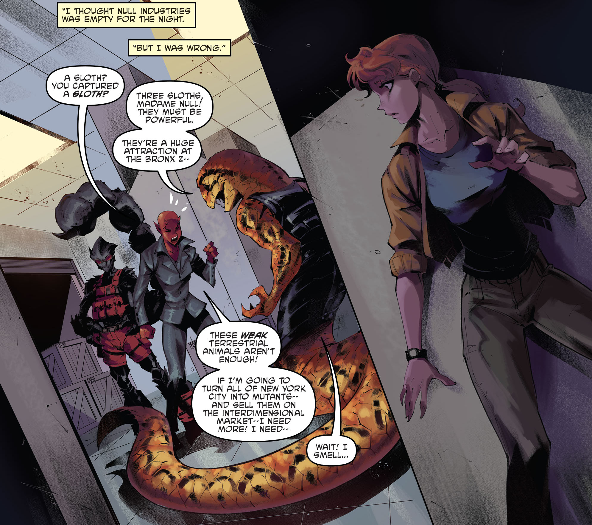 Les évènements qui avaient conduits un quartier de Manhattan à devenir Mutant Town arrangeait les affaires de Null. Si la femme d’affaires craignait la question des droits des mutants, elle voulait malgré tout poursuivre ses recherches pour la conception de mutants parfaits pouvant être vendus aux entreprises pour améliorer leurs productivités, à l’échelle de la galaxie. Pour tester le sérum qui serait capable de transformer les mutants, elle avait envoyé Zodi se servir des habitants des souterrains de New York comme cobayes.