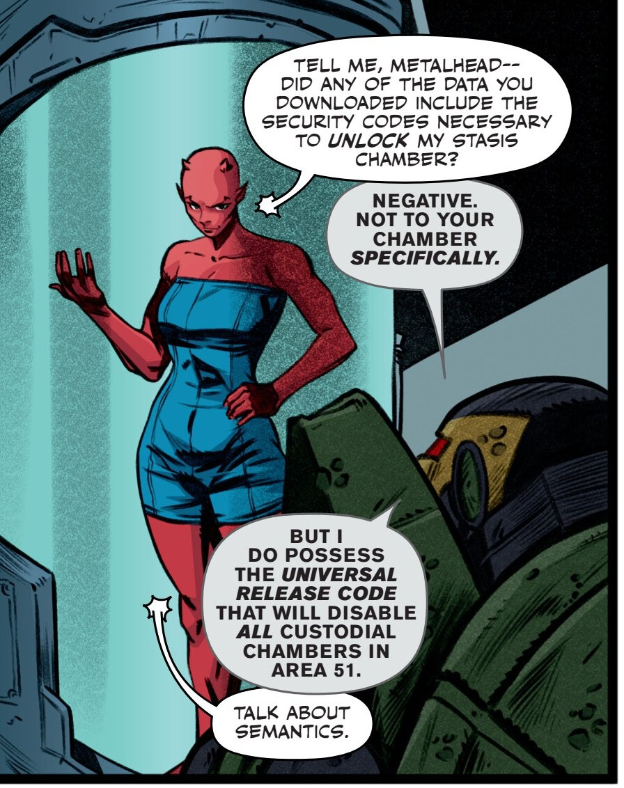 La femme lui proposa de la délivrer de là. En échange, elle le conduisait sur sa planète pour lui offrir bien plus de connaissances qu’il n’en aurait sur Terre. Ainsi, Metalhead déroba un vaisseau triceraton et prit la fuite avec la femme au teint rouge en direction de l’espace (Mutant Nation #4).