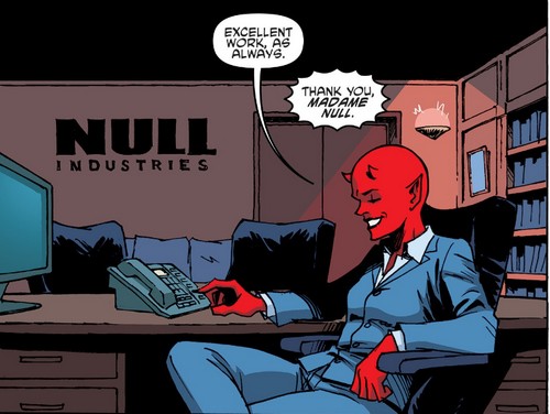 Saisissant un de ses soldats à la gorge, elle le vida de son énergie avant de le lâcher au sol, desséché. C’était tout réfléchit pour la scientifique, qui ne voulait qu’une chose, sortir de ce cauchemar où même Jillian Amante lui mentait (Mutanimals, part. 3). Old Hob et les siens déclarèrent une ultime guerre à madame Null en l’attaquant directement dans sa tour. Tandis que les Mutanimals réglaient leur compte aux soldats en guise de diversion, Hob rendait une petite visite à la présidente de l’entreprise, dans son bureau. Entendant les bruits de combats, Null comprit ce qu’il se passait et saisit Hob à la gorge pour le tuer. Il répliqua par un coup de griffes sur son visage avant d’ouvrir la porte et laisser Mutagen Man achever le travail ; il tira une roquette sur la femme. Immortelle, elle bougeait encore, bien que grièvement blessée. Pensant que personne ne pourrait la vaincre, quelle ne fut pas sa surprise lorsqu’Old Hob lui montra le véritable but de sa venue ? Lindsey et Jillian avaient effacé toutes les données du laboratoire, ramenant leur niveau de connaissances à des années en arrière. Les vidéos de leurs expériences, notamment sur des animaux, allaient être envoyées à la presse. Si Null s’avisait de recommencer, ils continueraient inlassablement leur guerre (Mutanimals, part. 4).