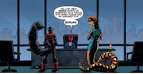 Les plans du Rat King étaient également menacés par Karai, qui s’était entourée de personnes désireuses de mettre un terme à l’Armageddon Game de manière plus discrète. Depuis plusieurs semaines, l’agent Kara Lewis et Alex Winter avaient de gros doutes sur le maire Stockman. Ils l’avaient surpris en train d’échanger avec madame Null (The Armageddon Game #5). April était parvenue à infiltrer Null Industries afin de récolter les preuves nécessaires pour faire tomber le maire de New York et mettre Null sous les barreaux (The Armageddon Game – The alliance #5).