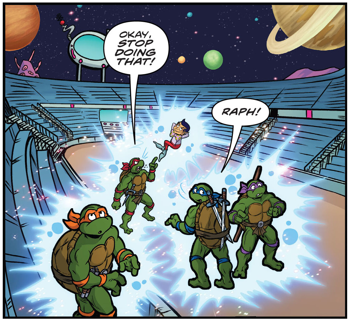 La première était de vaincre un dragon dans une grotte. Impossible de venir à bout de la créature géante. Seul Michelangelo eut l’idée de danser pour le distraire et lui infliger un puissant coup de poing. Ogg était stupéfait de cette victoire. Il emportait les tortues dans une arène pour qu’elles affrontent d’autres adversaires. Cette fois, il s’agirait de tortues d’autres univers (TMNT SMA #12).