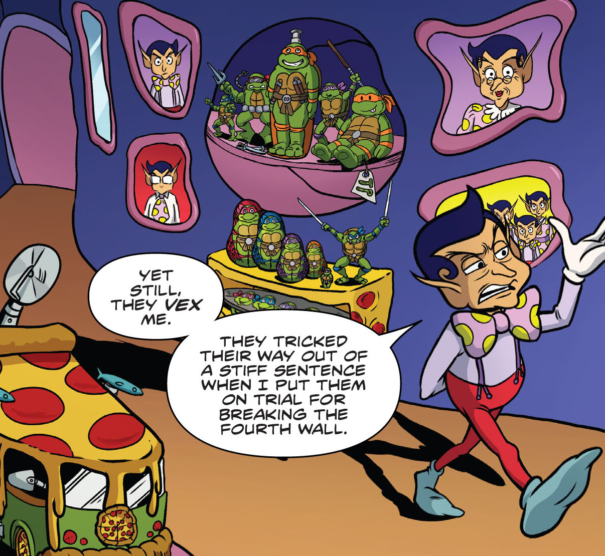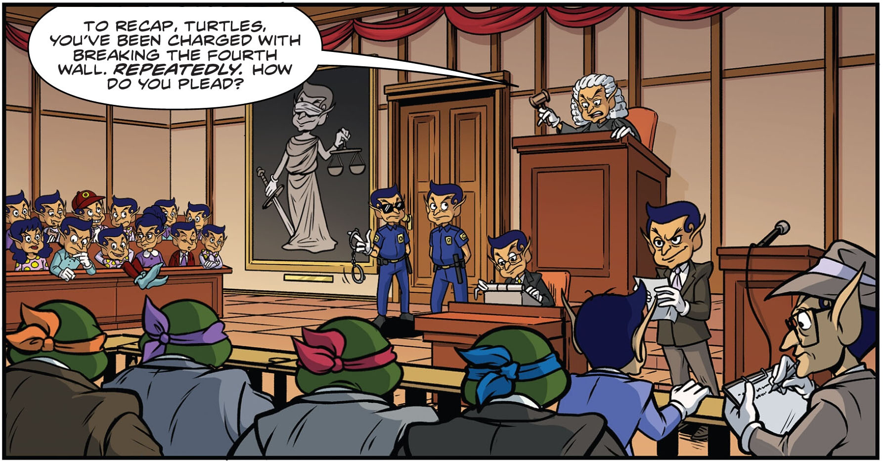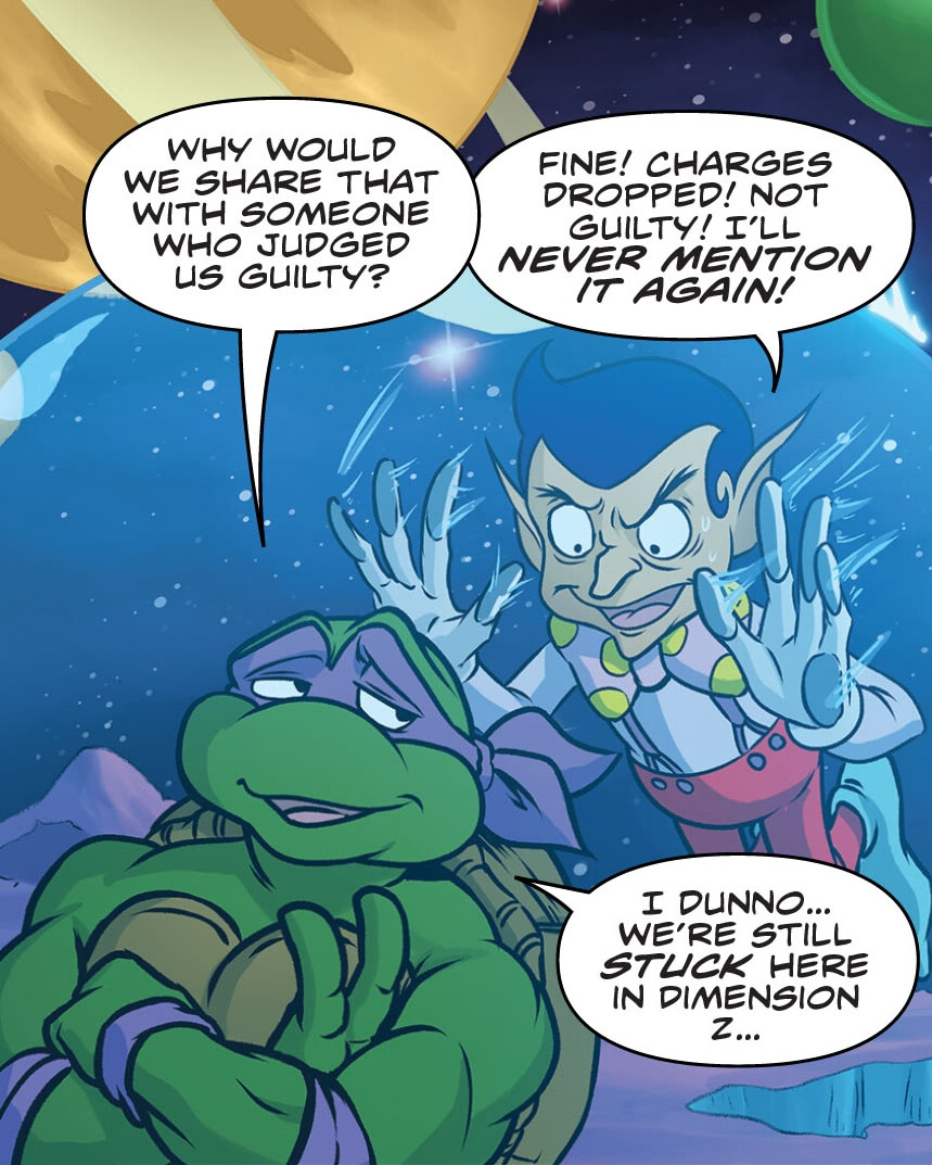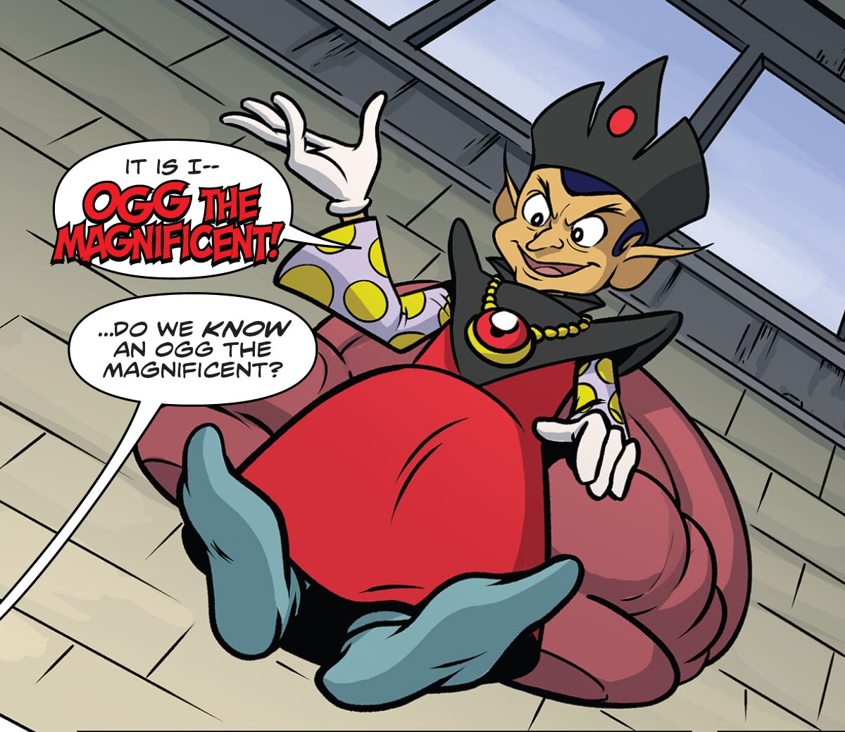 Trompé puis vaincu par les Tortues Ninja, M. Ogg n’avait pas dit son dernier mot ! Celui-ci revint pour se venger des tortues en les condamnant pour avoir brisé bien trop de fois le quatrième mur. Il transporta les quatre frères dans un tribunal entièrement tenu par des M. Ogg. Face à cette farce et un avocat peu convaincant, Raphael sauta sur le juge, ce qui les transporta directement en Dimension Z, dans une bulle. Donatello eut l’idée de tromper une fois encore le petit bonhomme en lui proposant un remède contre son pire problème, l’ennui ! Terriblement intéressé, M. Ogg suppliait la tortue de lui révéler son secret. En échange, il les délivrerait et leur promettait de ne jamais plus essayer de leur faire du mal. Une fois libéré, Donatello lui disait simplement de se laisser aller à l’imprévu. C’était sa planification qui gâchait tout. Furieux, Ogg promettait de se venger un jour (TMNT SMA #8).