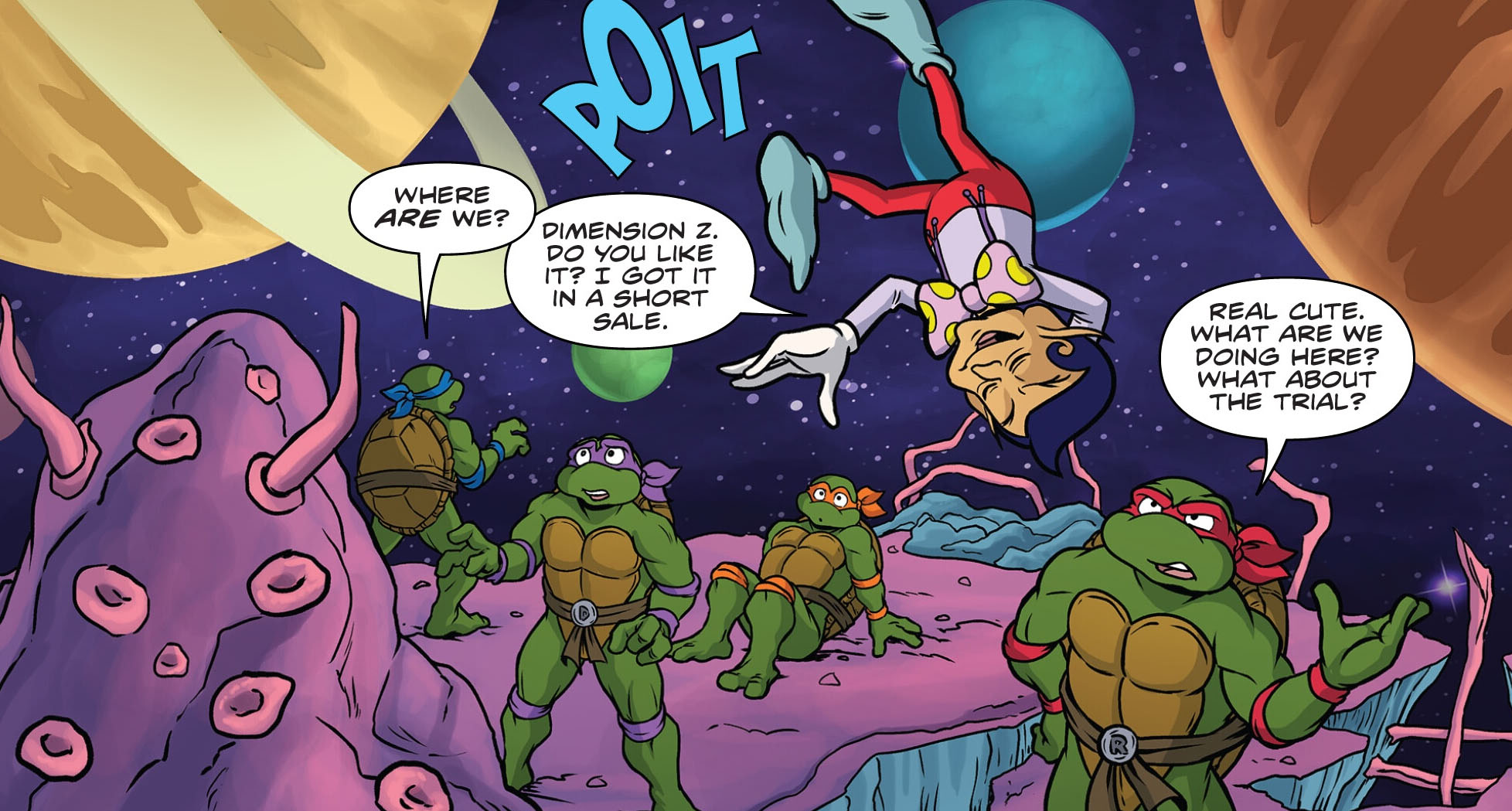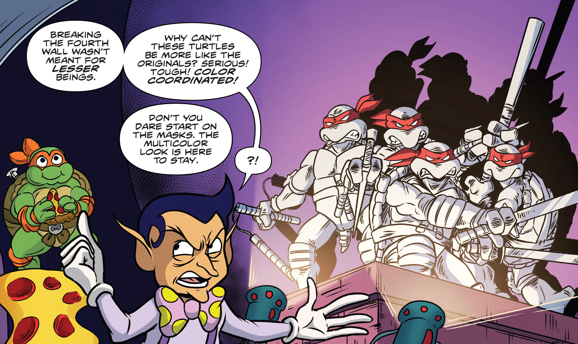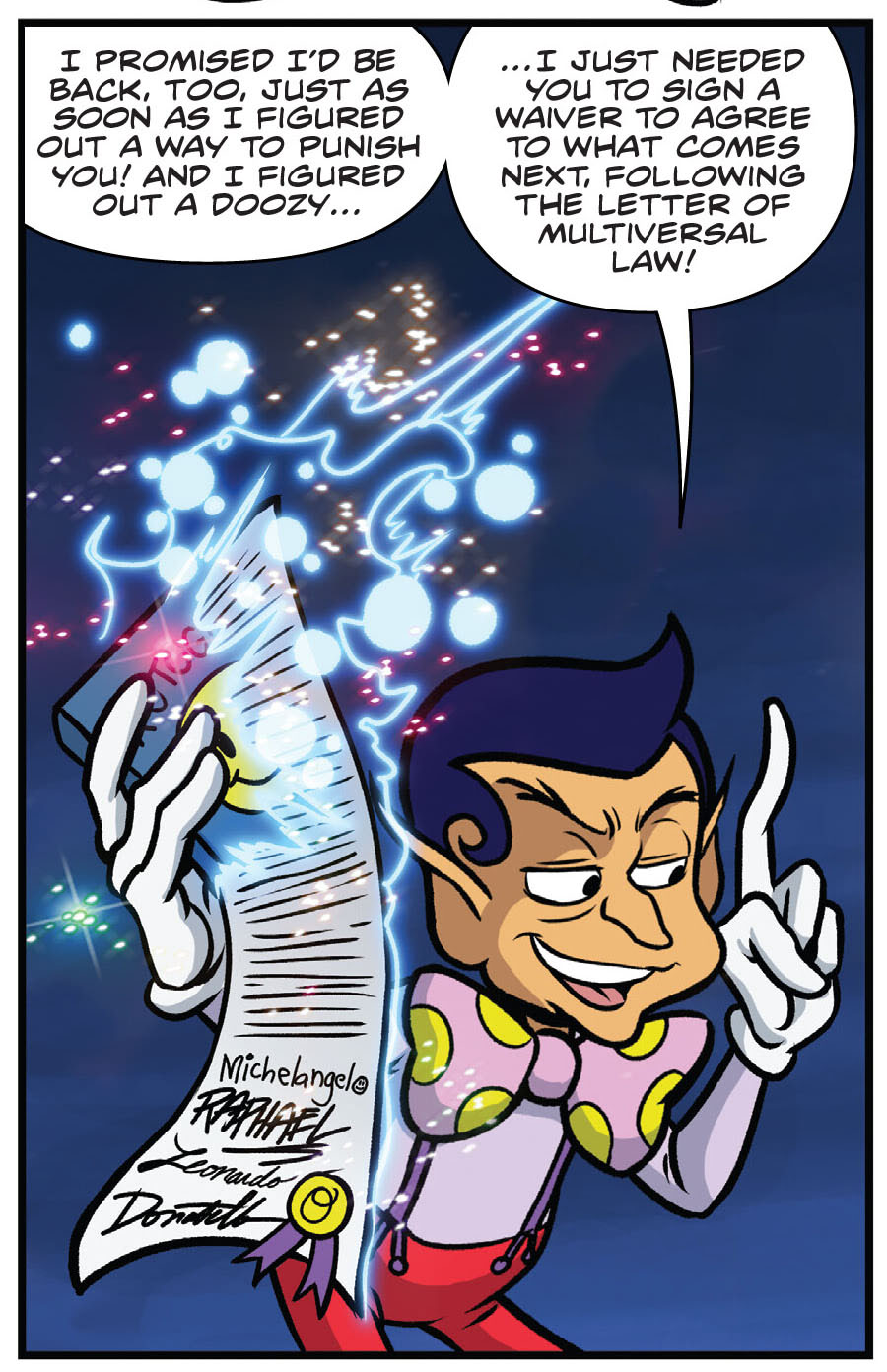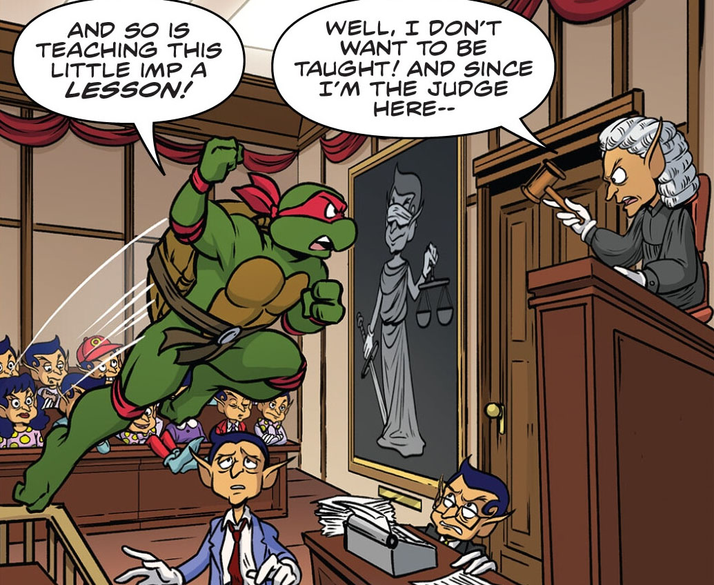 Trompé puis vaincu par les Tortues Ninja, M. Ogg n’avait pas dit son dernier mot ! Celui-ci revint pour se venger des tortues en les condamnant pour avoir brisé bien trop de fois le quatrième mur. Il transporta les quatre frères dans un tribunal entièrement tenu par des M. Ogg. Face à cette farce et un avocat peu convaincant, Raphael sauta sur le juge, ce qui les transporta directement en Dimension Z, dans une bulle. Donatello eut l’idée de tromper une fois encore le petit bonhomme en lui proposant un remède contre son pire problème, l’ennui ! Terriblement intéressé, M. Ogg suppliait la tortue de lui révéler son secret. En échange, il les délivrerait et leur promettait de ne jamais plus essayer de leur faire du mal. Une fois libéré, Donatello lui disait simplement de se laisser aller à l’imprévu. C’était sa planification qui gâchait tout. Furieux, Ogg promettait de se venger un jour (TMNT SMA #8).