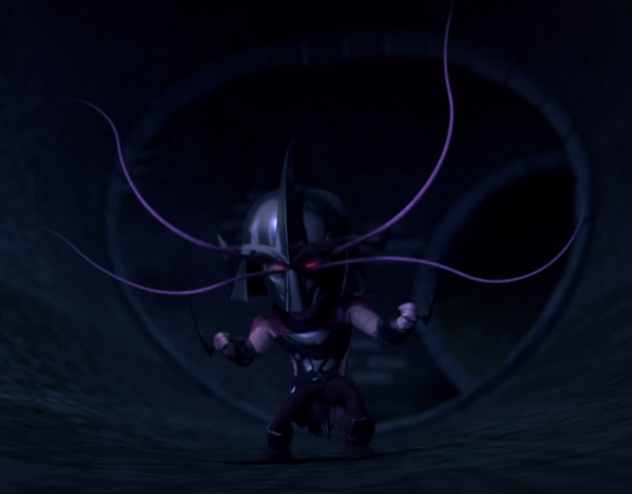 Des pics sortirent du corps de Shredder, qui eut à peine le temps de poser son casque sur le visage. Il se transforma avec ce qui restait de son armure et put enfin quitter son lit. Il était devenu une créature repoussante, mais à même de vaincre ses ennemis. Tiger Claw eut même peur de son apparence, mais celle-ci convenait parfaitement à son propriétaire. Il partit avec ses bras droits pour son ancien quartier général afin de capturer Karai et tendre un piège à son vieux rival dans les égouts.