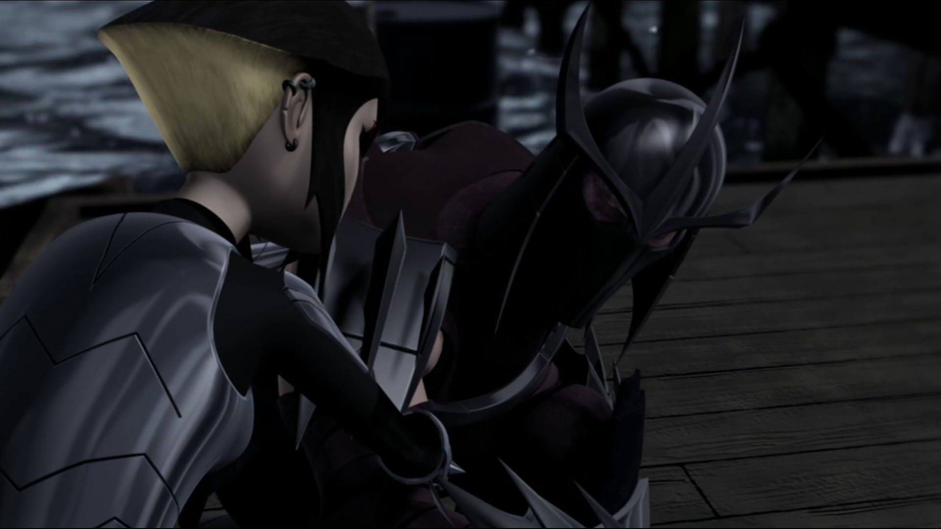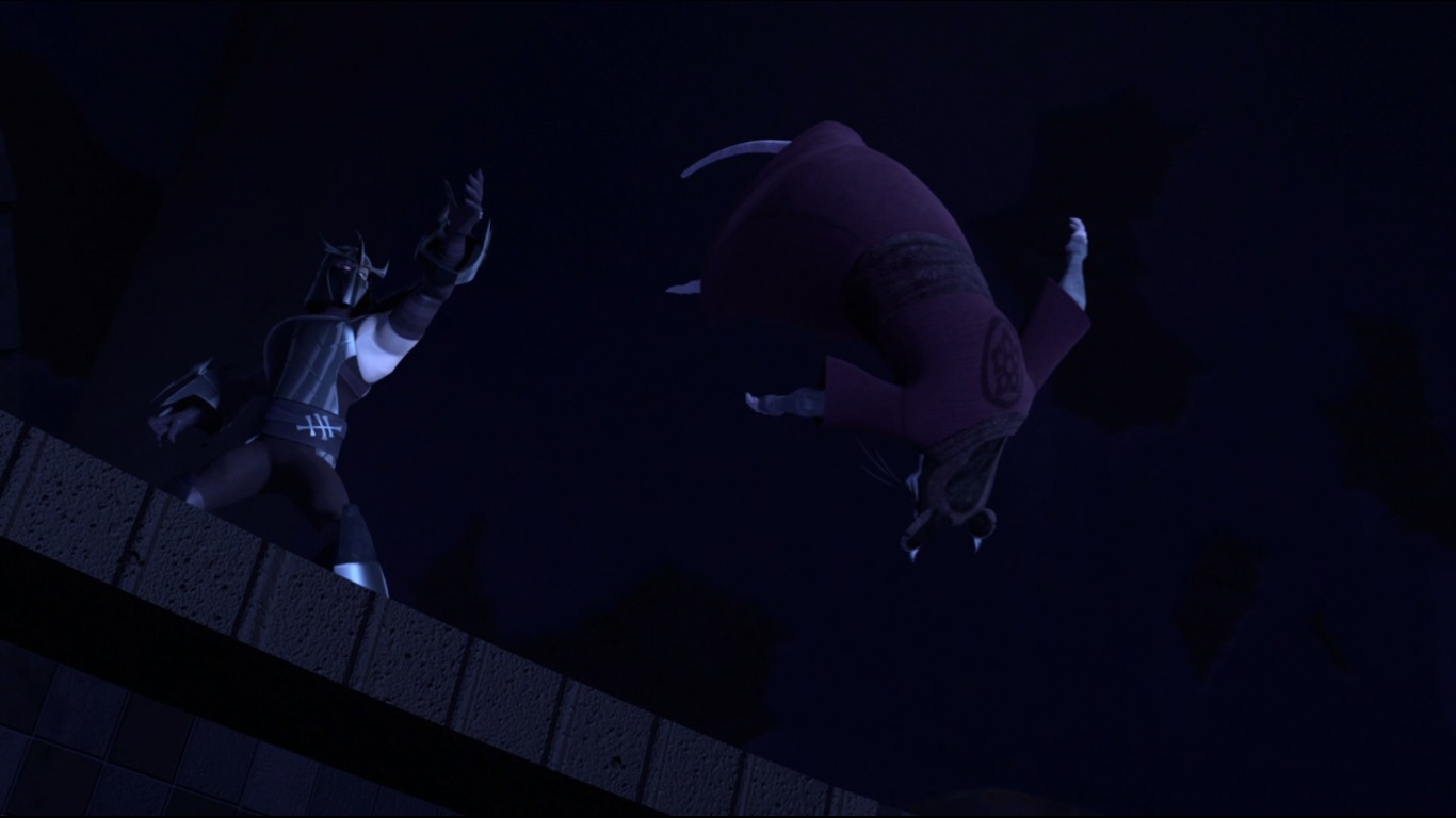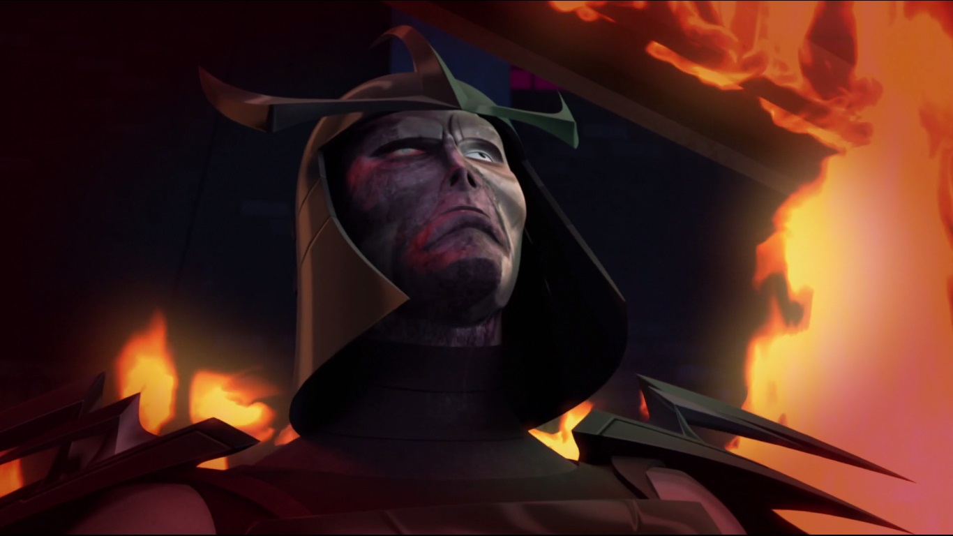 Furieux, Splinter jeta son adversaire à terre. Alors qu’il s’apprêtait à l’exécuter, Miwa interrompit la lame qui s’abattait sur celui qu’elle prenait pour son père depuis plus de quinze ans. Le mutant comprit que sa bataille était perdue d’avance et préféra battre en retraite. Shredder était vaincu, au sol et sans casque. Il avait dévoilé son visage meurtri par les flammes qui avaient embrasées le dojo lors de leur combat précédent (L’affrontement, part. 2, S1 E26).