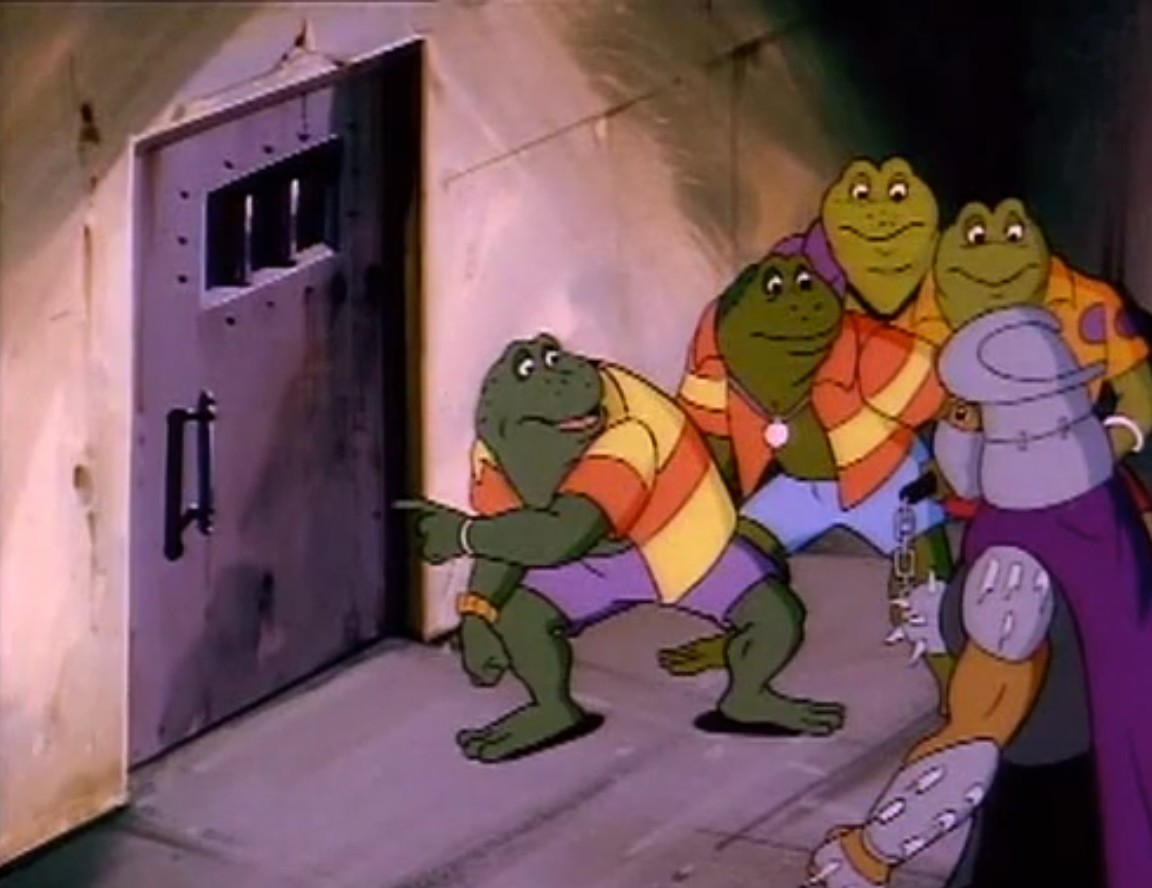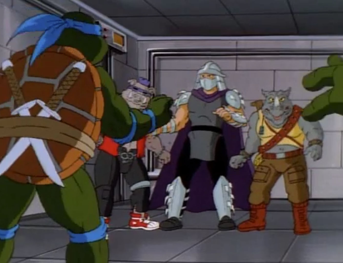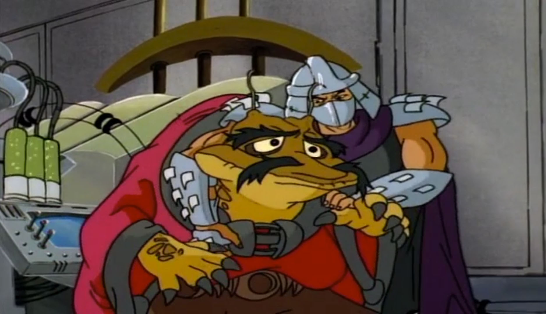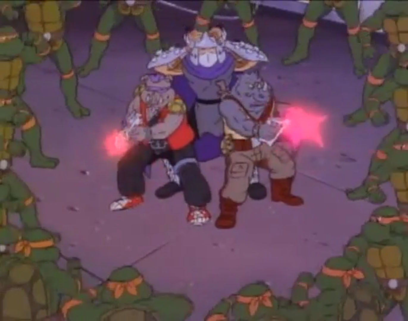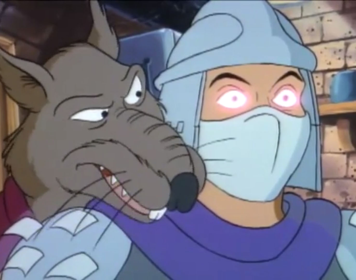 Shredder parvint à capturer Splinter et à s’en servir comme appât pour attirer les tortues. Séduit par leur talent au combat, il leur proposa de le rejoindre, en vain. Face à ce refus, l’homme lança ses deux nouveaux mutants, qui trop stupides, ne parvinrent à rien (À la recherche du Technodrome, S1 E2).