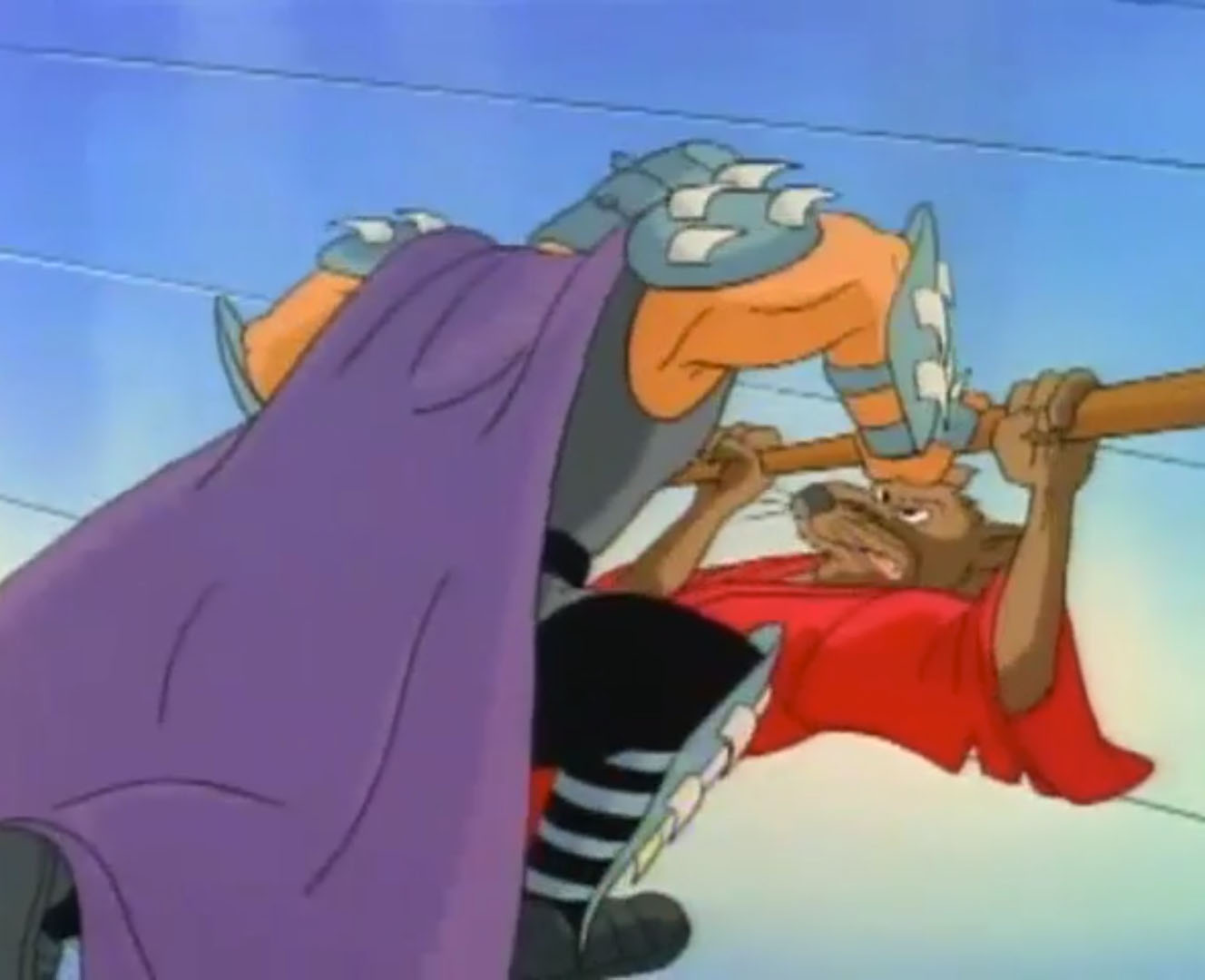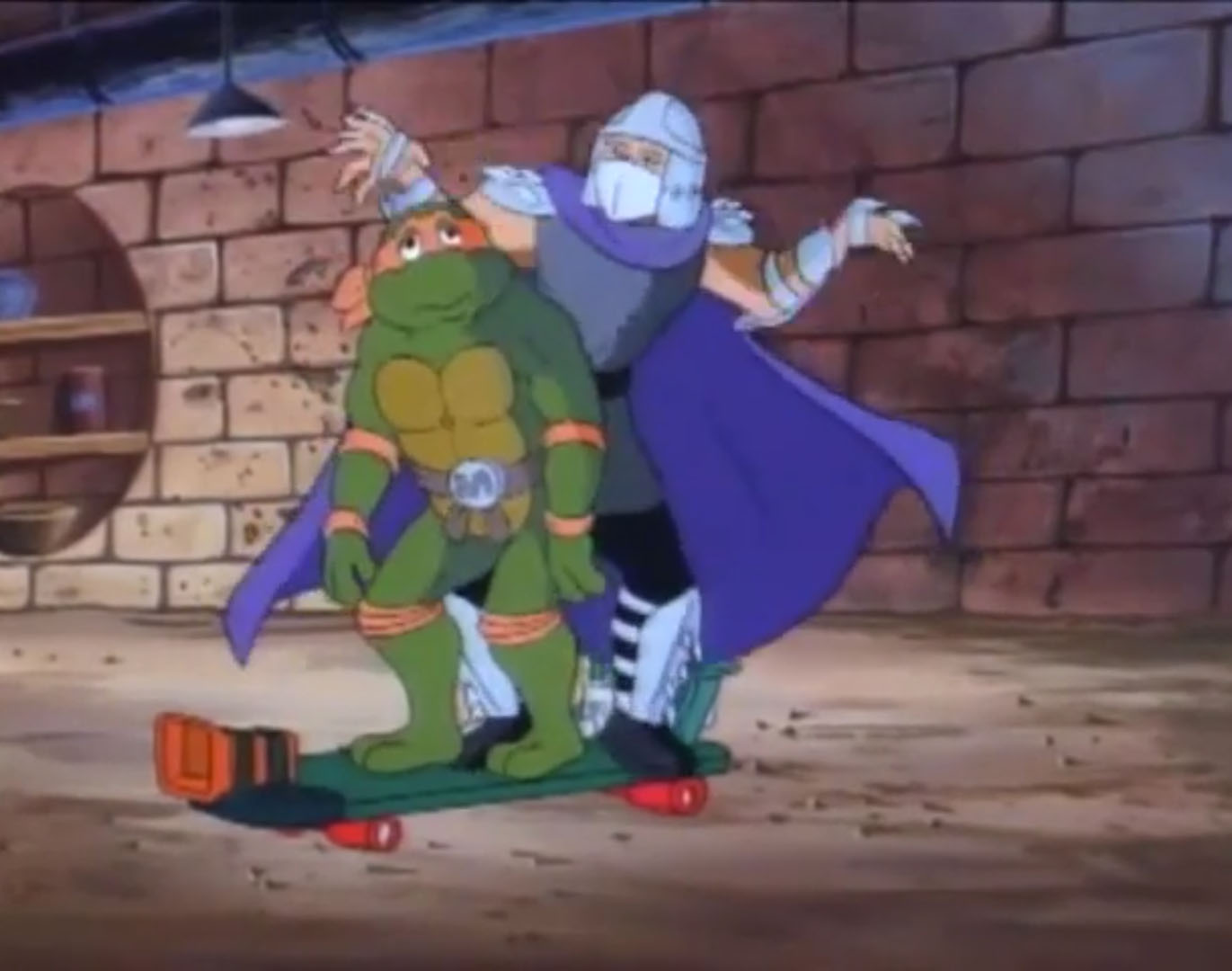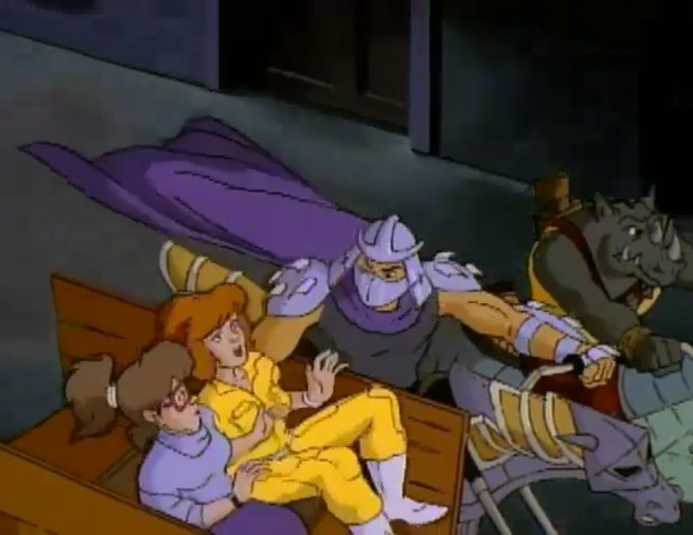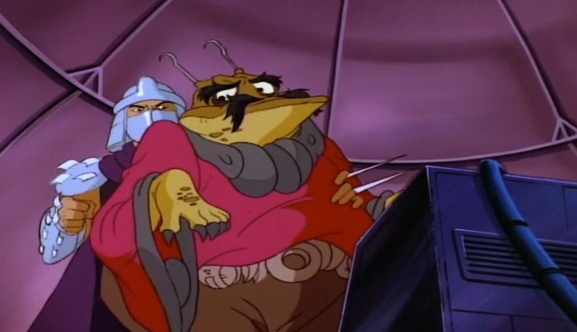 Shredder parvint à capturer Splinter et à s’en servir comme appât pour attirer les tortues. Séduit par leur talent au combat, il leur proposa de le rejoindre, en vain. Face à ce refus, l’homme lança ses deux nouveaux mutants, qui trop stupides, ne parvinrent à rien (À la recherche du Technodrome, S1 E2).
