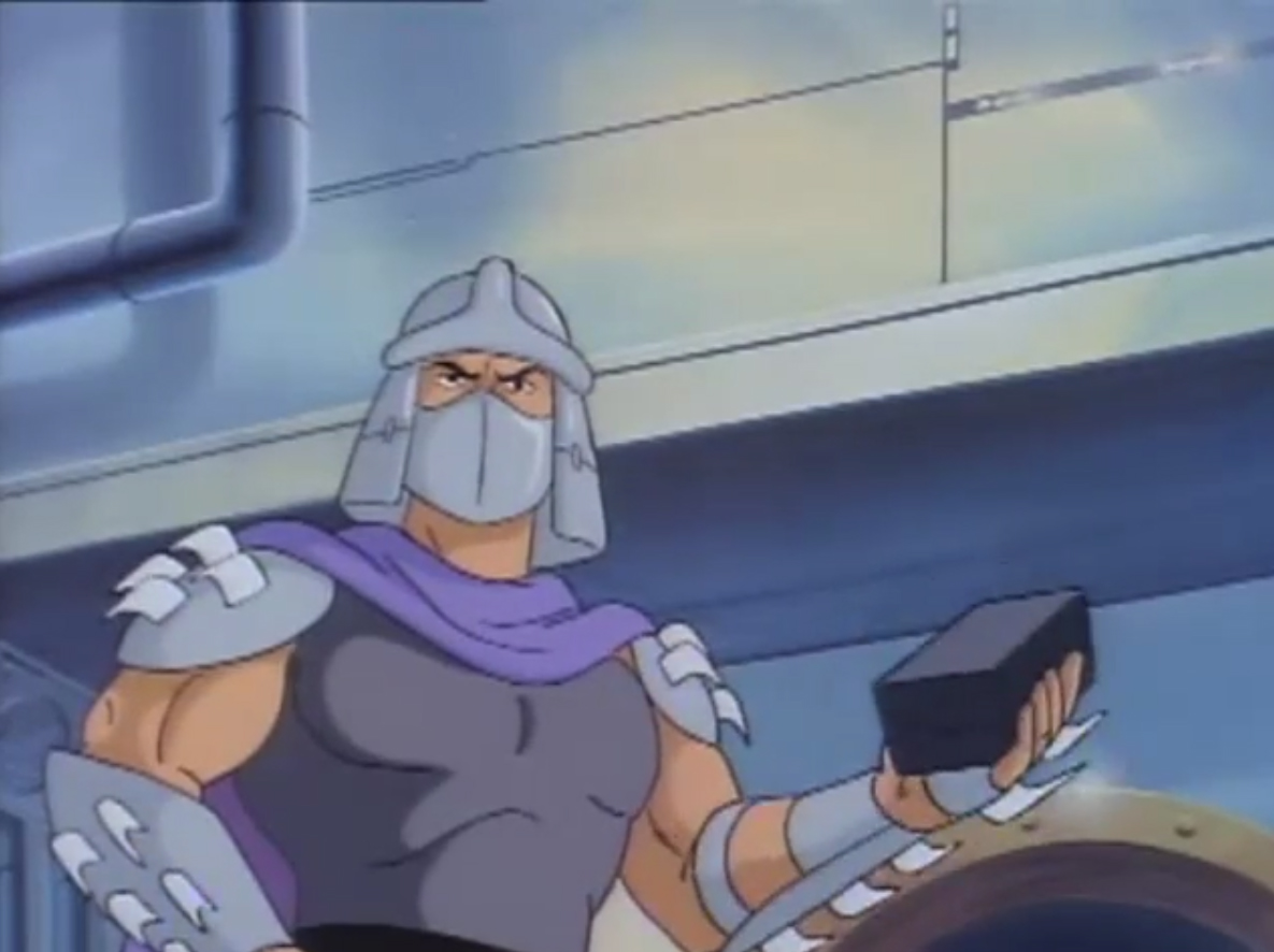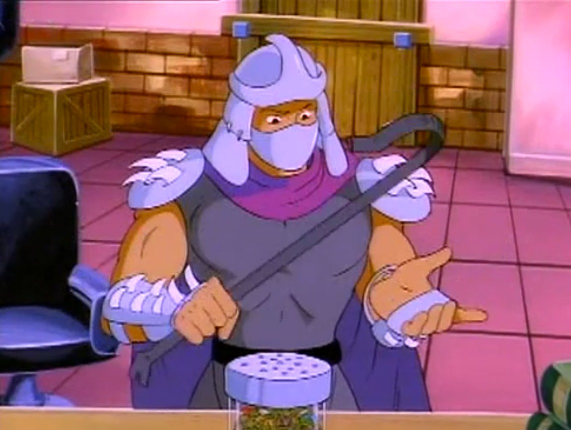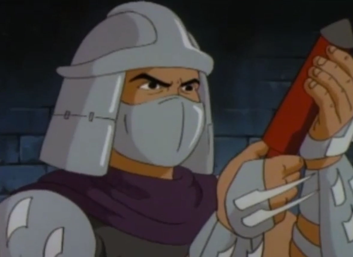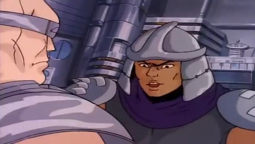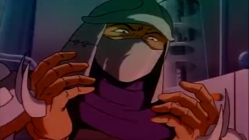 - Shredder est fondamentalement mauvais. Dans l’épisode Le monstre de Krangenstein (S6 E2), après avoir perdu la mémoire, il décida de s’accaparer un quartier et y faire régner sa loi. Par la suite, un homme à qui il sauve la vie lui propose de travailler (ce qui le dégoûte) en dirigeant une équipe dans son usine d’artificiers. Cela lui donne l’idée de créer une bombe pour s’attaquer aux grands bâtiments de New York.