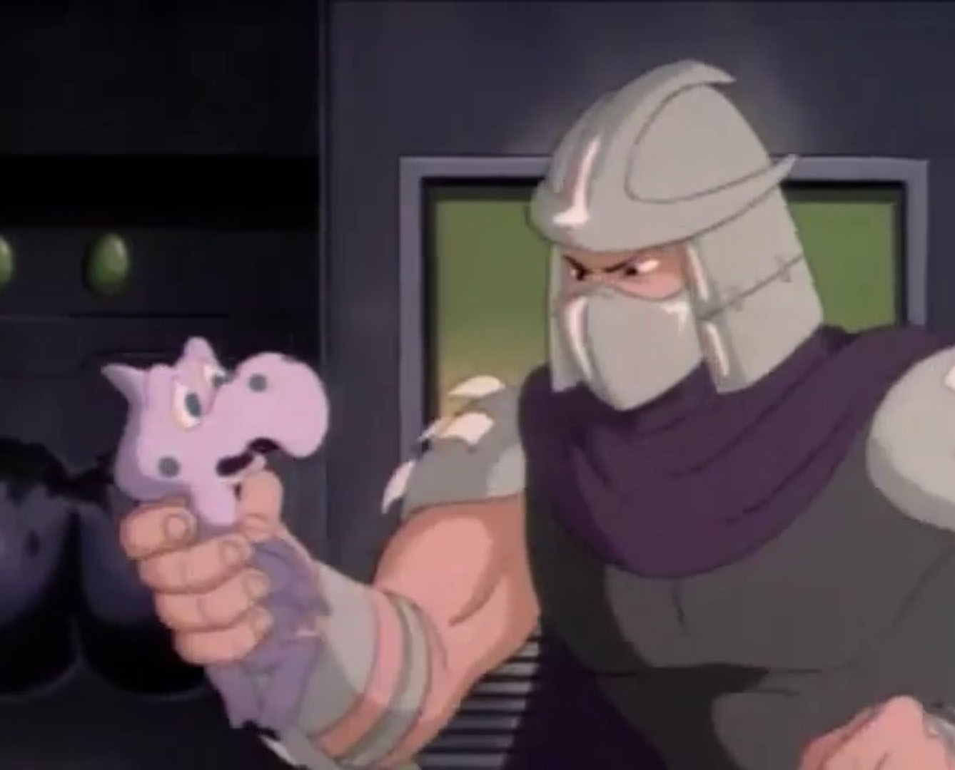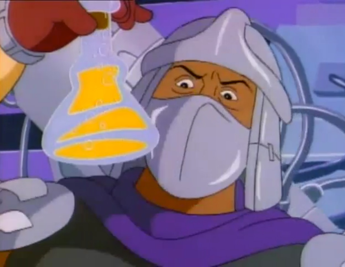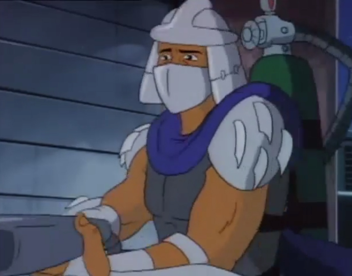 - Shredder est fondamentalement mauvais. Dans l’épisode Le monstre de Krangenstein (S6 E2), après avoir perdu la mémoire, il décida de s’accaparer un quartier et y faire régner sa loi. Par la suite, un homme à qui il sauve la vie lui propose de travailler (ce qui le dégoûte) en dirigeant une équipe dans son usine d’artificiers. Cela lui donne l’idée de créer une bombe pour s’attaquer aux grands bâtiments de New York.
