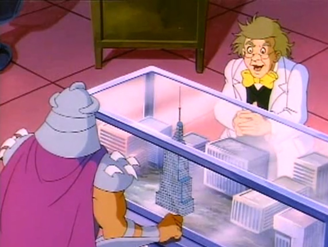 Un jour, Krang découvrit une brochure indiquant un potentiel laboratoire oublié dans la tour du pavillon des sciences de la Foire internationale de 1964. Mais s’y rendant, ils découvrirent qu’elle était déjà occupée par Berzerko, ancien architecte du Technodrome. L’ingénieur captura Krang, assoiffé par la vengeance. Croyant que son allié était tombé face aux tortues, Shredder exigea à ses ennemis qu’ils le relâchent. Dans le cas contraire, il détruirait la tour de Channel 6. L’homme s’exécuta finalement, sans faire de victime grâce à l’intervention de Splinter. Médusées par la destruction de l’immeuble, les tortues allaient devoir faire face à Burne Thompson, qui leur faisait porter le chapeau (À la recherche de Shredder, S8 E1).