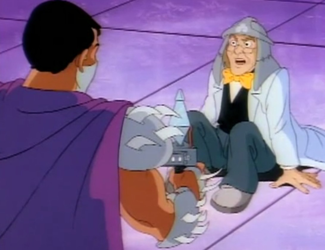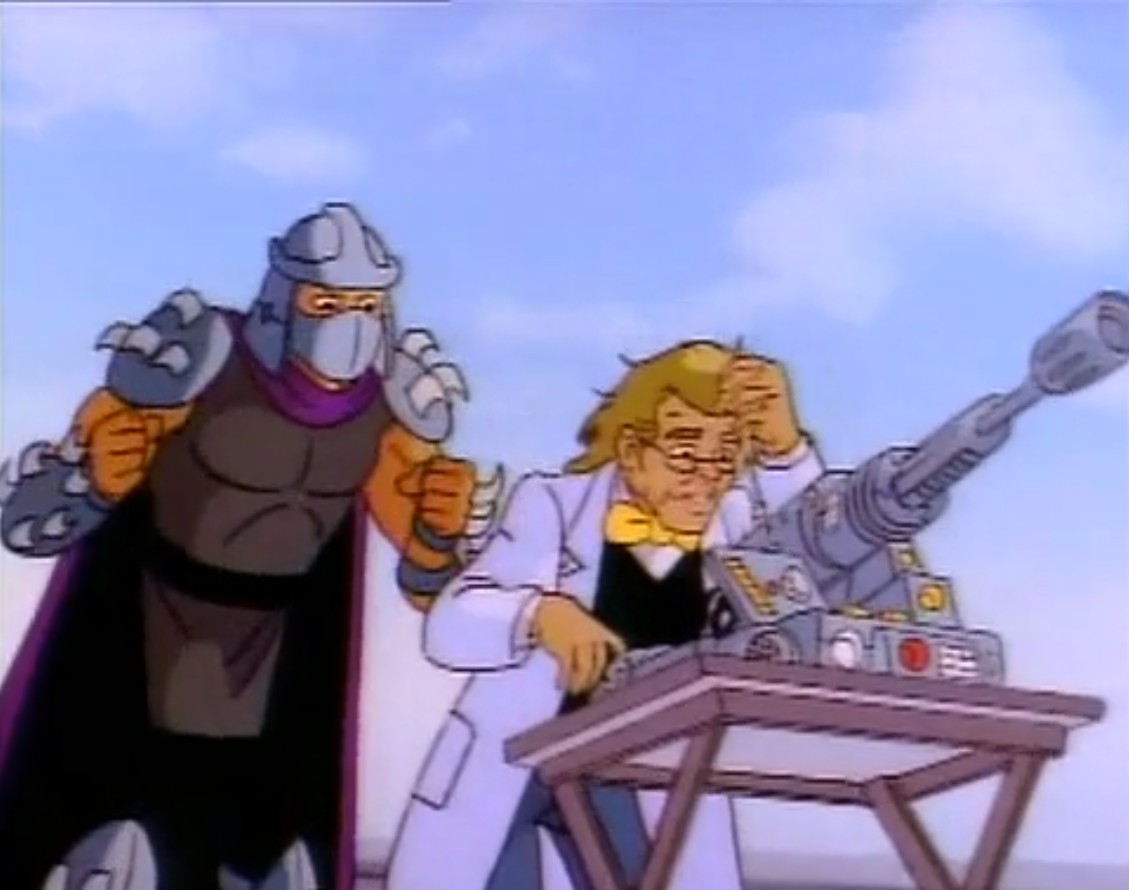 Par la suite, Shredder s’est associé avec le scientifique Baxter Stockman pour qu’il lui crée une armée de Mousers. S’attaquant une nouvelle fois à Splinter, le scientifique fou parvint à capturer Michelangelo. Krang, voyant que Shredder était proche de son but, craignait qu’il ne lui conçoive pas son corps robotique. L’extraterrestre sabota donc son plan en libérant la tortue et conduisant ainsi les robots à leur perte (Les mangeurs de rats, S1 E3). Mais Shredder n’en avait pas terminé. Il demanda à Krang une aide extérieure, celle de la Dimension X. Il fit venir l’armée de soldats de pierre par un passage interdimensionnel. C’était sans compter avec l’arrivée des neutrinos (Dimension X, S1 E4).Shredder se rendit à l’évidence, il devait construire le corps que Krang lui demandait. Il créa également un pistolet à rayon rétro-mutagène, capable d’annuler l’effet d’une mutation. Les tortues rêvaient de rendre sa forme humaine à Splinter. Sentant le piège, le rat préféra se rendre seul au Technodrome. Le pistolet fut détruit dans un combat. Krang utilisa son nouveau corps et un amplificateur moléculaire pour devenir géant. Finalement, les tortues réussirent à les vaincre et les renvoyer en Dimension X (Un vrai combat de ninja, S1 E5).