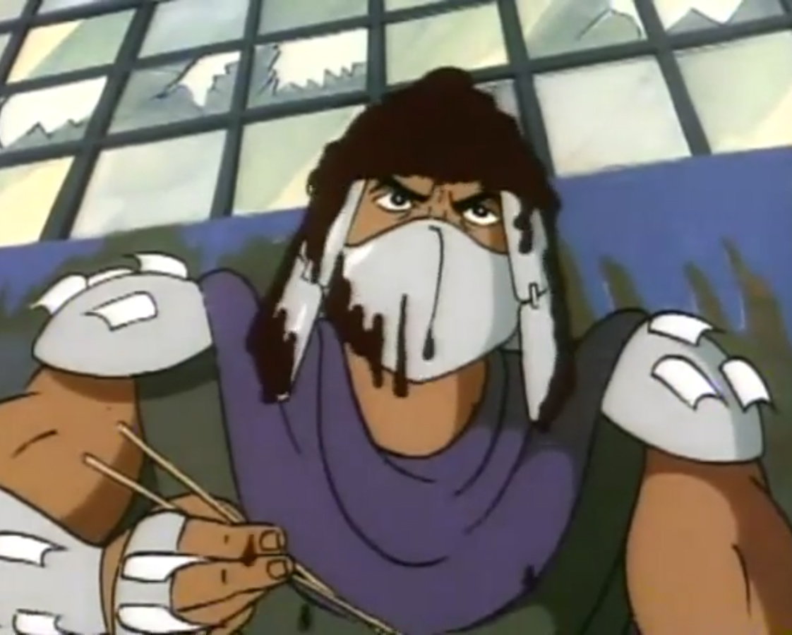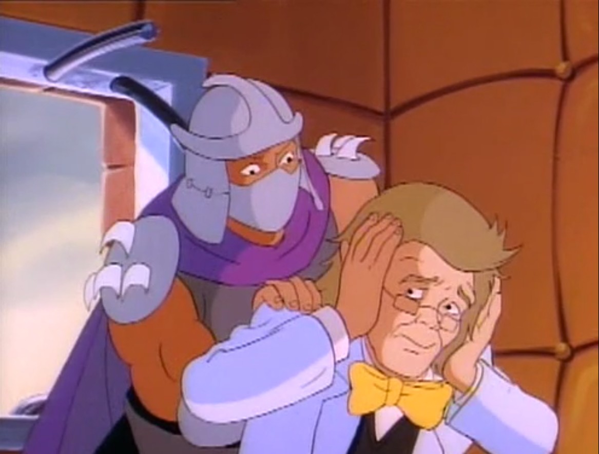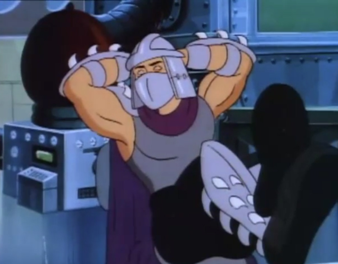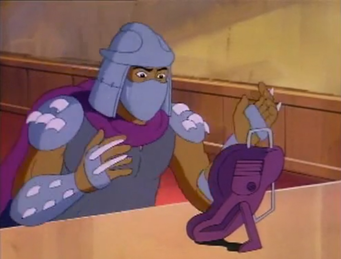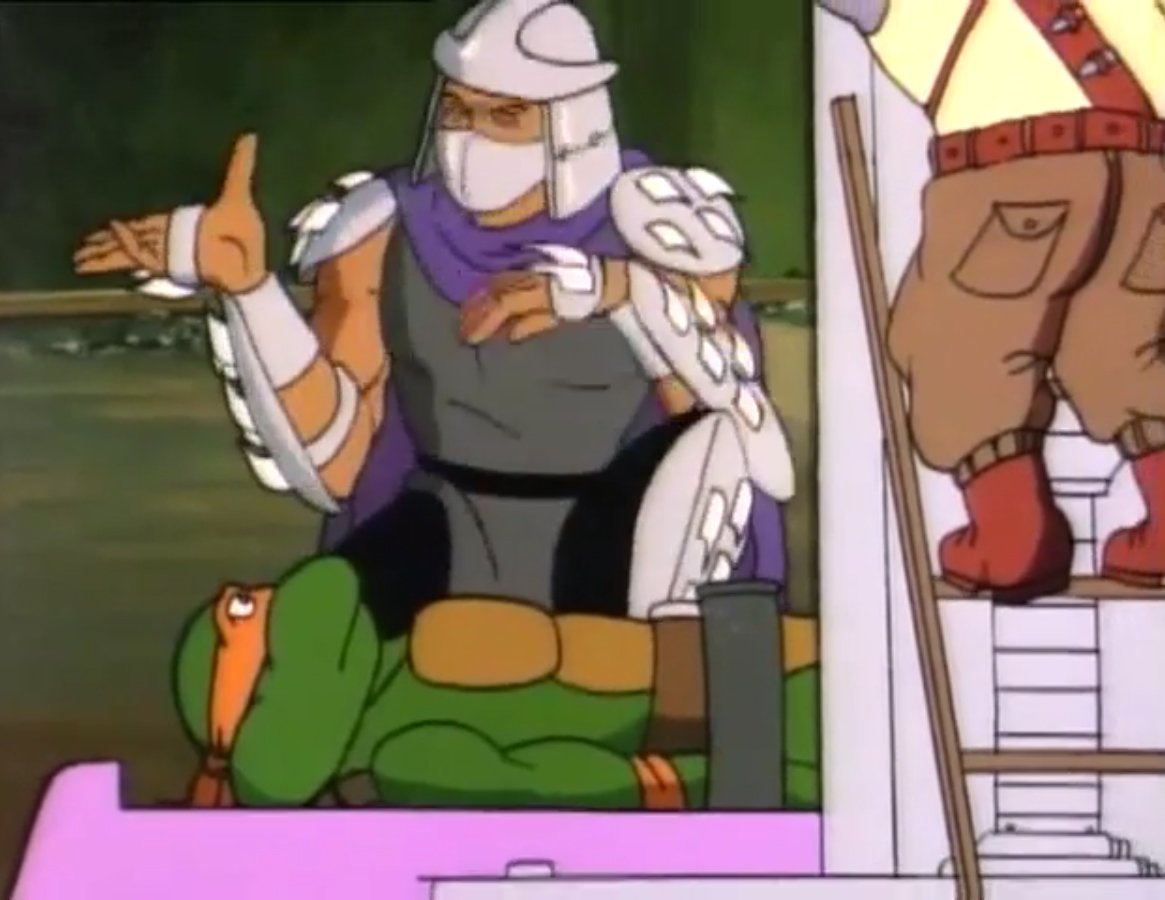 Shredder eut également l’esprit transformé après avoir reçu une décharge d’un appareil qui possédait les données de personnalité de Michaelangelo. Il voulait détruire les tortues puis capturer le président des États-Unis. Se prenant pour la tortue, il partit pour le repaire. Splinter découvrit qu’il ne fallait surtout pas que le vrai nom de leur ennemi soit prononcé, ce qui arriva inévitablement. Cela avait pour effet de rendre sa personnalité à Shredder, qui s’attaqua à Raphael et à Leonardo, qu’il plaça dans une pizza géante prête à partir au four. Les tortues réussirent à lui faire reprendre la conscience de Michaelangelo et de les délivrer. Finalement, ces changements pouvaient être une aubaine pour les frères, qui décidèrent de se jouer de leur ennemi pour le suivre et détruire sa machine. Bebop et Rocksteady crurent encore que leur chef était devenu Michaelangelo (Tortue inattendue, S3 E18).
